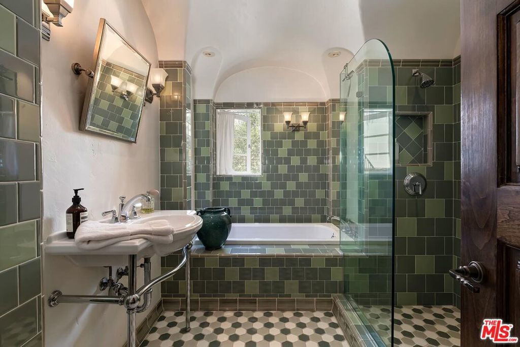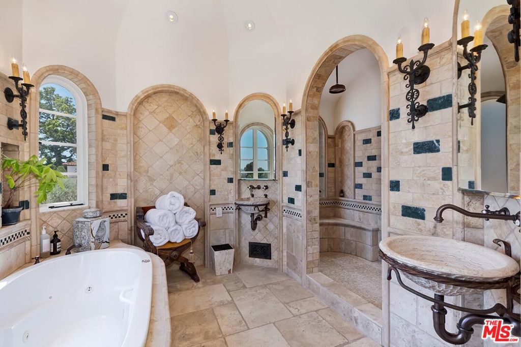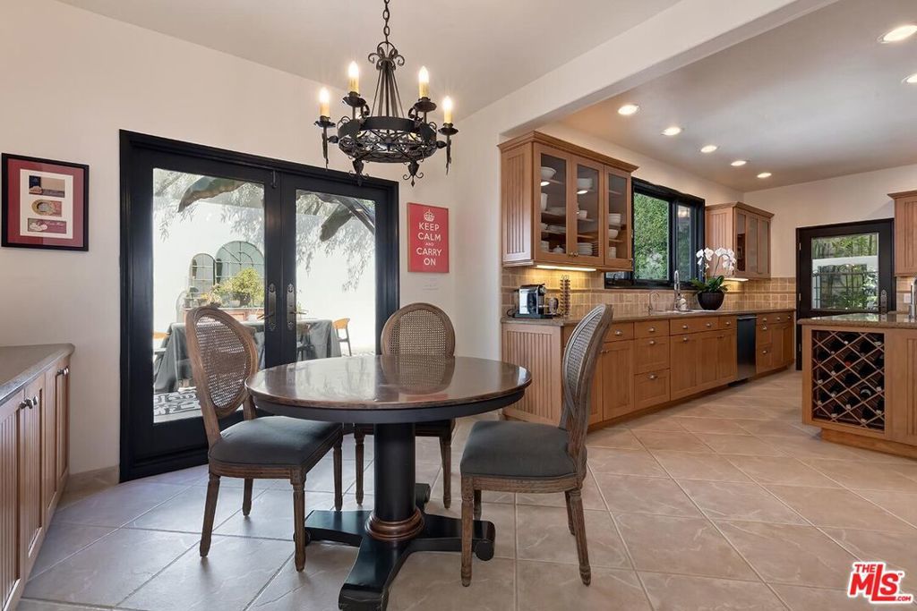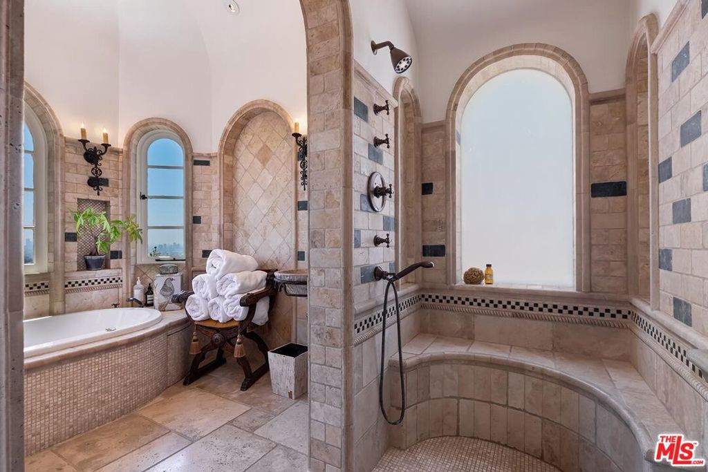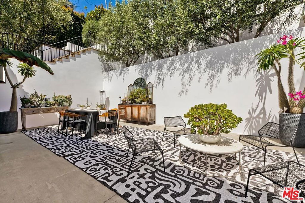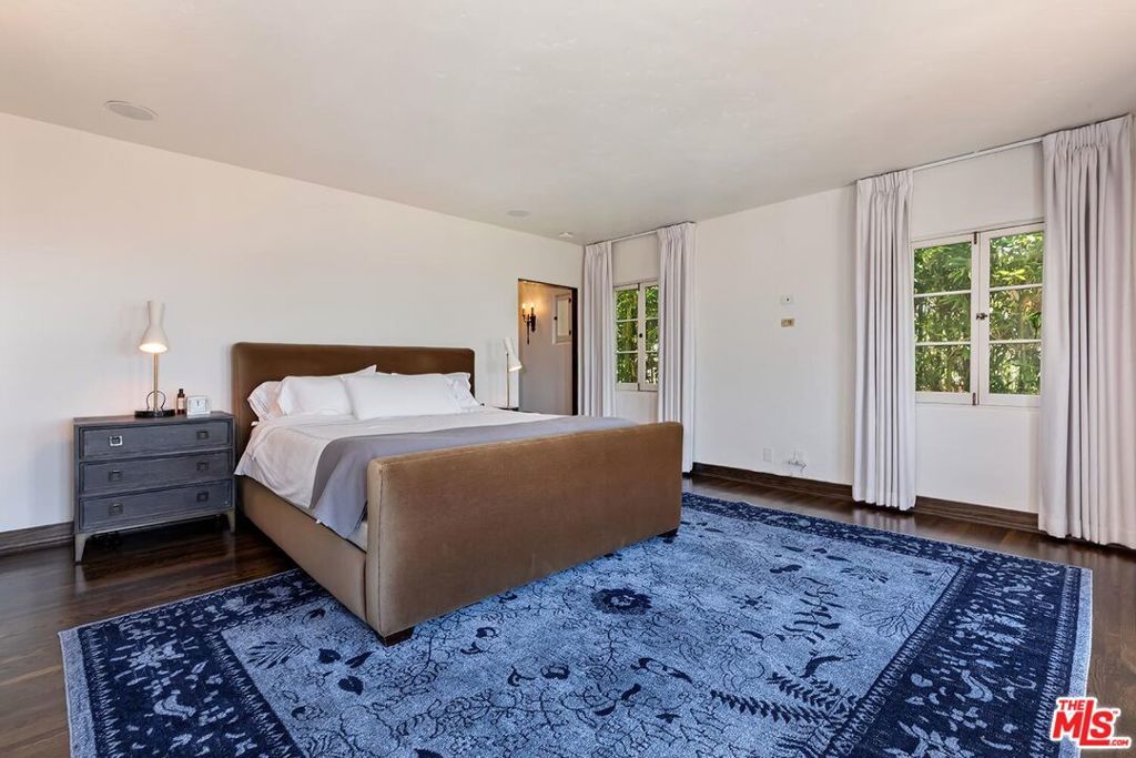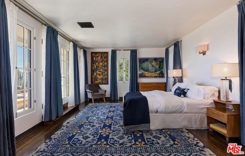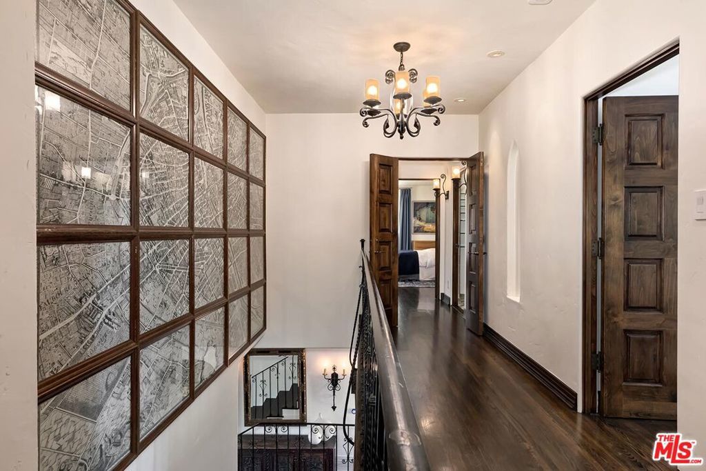 Meticulously curated Spanish stunner perched in the coveted hills of Los Feliz. This fully furnished entertainer's home features multiple indoor and outdoor living and dining spaces to optimize the California lifestyle. Panoramic views of the Los Angeles skyline visible from almost every room and multiple patios provide a jaw-dropping backdrop to everyday living. Upon entry, the formal living room anchored by a massive stone fireplace boasts original beams, a baby grand piano and designer furniture. Across the foyer sits the formal dining room complete with seating for 8 and windows flooding the room with light. A large chef's eat-in kitchen with ample storage and counter space opens to the picturesque back patio with outdoor dining and living. The main level bedroom, currently furnished as an office, offers a convenient and private workspace nearby to a full bathroom with designer tile. Up the colorfully tiled stairs sits the primary suite with a large en-suite bathroom with a walk-in shower and large soaking tub adorned with windows. Two additional guest bedrooms, one featuring a stunning front facing patio, and two full baths complete the second story. The lower level boasts a large family room with a bar, rich coffered ceiling and french doors to the sunny patio with views. Double doors open to an exquisitely designed office with plenty of built-in storage and regal fireplace. A spacious gym with views, a beautiful spa-like bathroom and attached two car garage complete this amazing property.