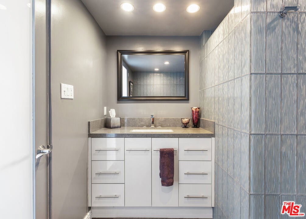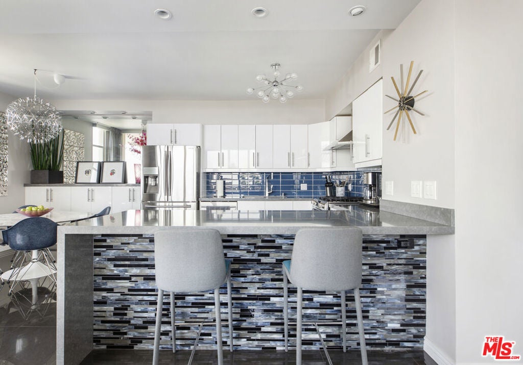 Seamlessly blending style, sophistication and bold design, a statement 1BR/1BA + den. SW corner home in Los Feliz's most vibrant hi-rise is an expression of desirability. Swing open the distinctive front door and step into the pristine, as a customized architectural wall for treasured art and stunning hi-gloss floors instantly set the tone. Proceed a few steps and explore exquisite inlaid glass tiles, an elegant treat captured throughout the home. Floor to ceiling windows/sliders allow drenching natural light and glamourous views from DTLA to the Pacific Ocean, while chic blinds close at the touch of button to lock-in sensuous privacy as desired. The large, open floor plan features special den/sitting area, an ideal location for quiet contemplation or catching up on reading. (Architectural Digest, New Yorker or Cosmopolitan subscribers sure to feel equally comfortable.) Chef's kitchen out of a designer showroom features stainless appliances, gorgeous stone counters (with seating space for martini sipping!), under-cabinet LED lighting and adjacent dining area. The luxury continues with an oversized spa-like bathroom, featuring breathtaking tiling + rain shower + soaking tub, gorgeous blackout draperies in the bedroom, plus a 24-hour doorman, security, pool + gym + 2 parking spaces. Your sanctuary for grown-up living awaits