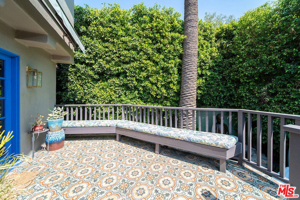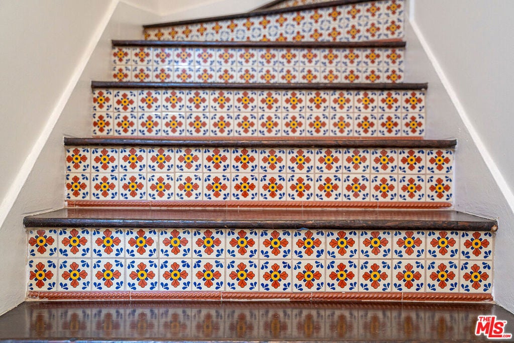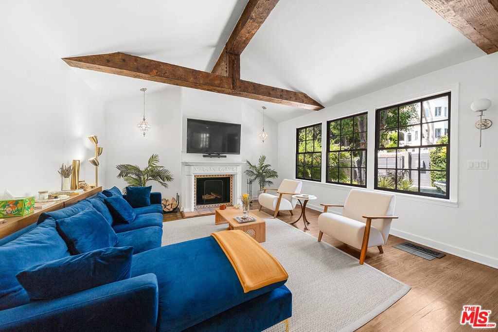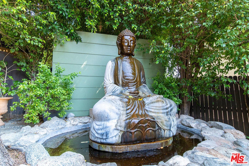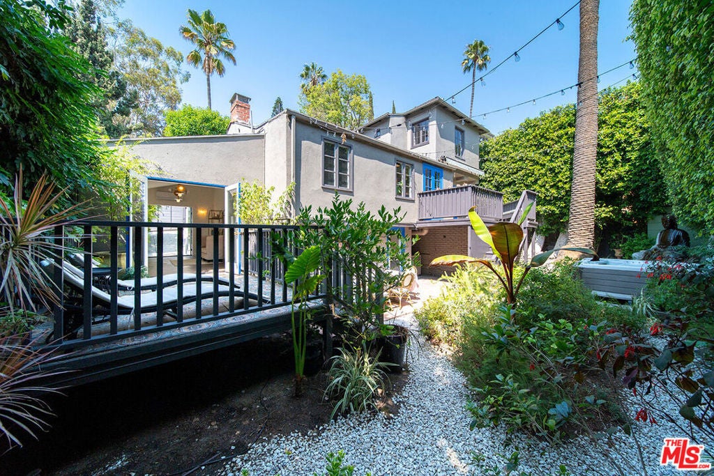 Oasis in the heart of the city, nestled in the Hollywood Hills, offering the perfect blend of tranquil sanctuary and Old Hollywood Charm with convenient access. The beautifully landscaped gated courtyard encompasses a lush flower garden with a gorgeous patio and a classic stone fountain. Built in 1927, this artful home showcases incredible Spanish Revival design elements -- an original stained-glass window, Spanish tile throughout, and a classic fireplace. You'll pass through the intricately carved 18th-century wooden entryway, where you'll be engulfed by the spacious living room enhanced by a vaulted ceiling, dramatic beams, Moroccan lanterns, a striking fireplace, original hardwood floors, and a formal dining area. All that next to a tastefully renovated downstairs bathroom and an adjacent sun room with a library that opens up through two sets of French doors onto the private back patio. The kitchen has been updated and offers stainless steel appliances, including a six-burner designer Wolf range, combining modern convenience with classic elegance. Upstairs, you'll find two bedrooms, a cozy balcony, and one bath, providing a harmonious retreat. The rear yard is surrounded by mature hedges providing complete privacy. A native-plant garden, relaxing 8-person hot tub, larger-than-life Buddha fountain, and an additional deck create a meditative, shaded outdoor haven. Additionally, the home comes with two sizable, temperature-controlled, bonus spaces totaling 450 sq ft, reflected in the MLS sq ft, that can be used as bedrooms, studios, offices, or flex spaces. The location of this home offers central proximity to major studios, renowned restaurants, and vibrant nightlife. The picturesque Lake Hollywood Reservoir is a twenty-minute hike through the hills, with iconic entertainment venues such as the Hollywood Bowl and John Anson Ford Theatre within a short distance. This one-of-a-kind sanctuary in an idyllic Hollywood Hills neighborhood has some of the most elevated, inspired aesthetics you'll find in Los Angeles!