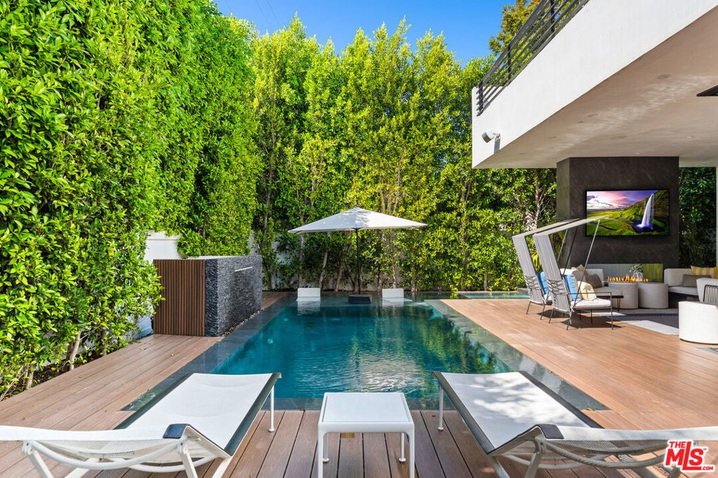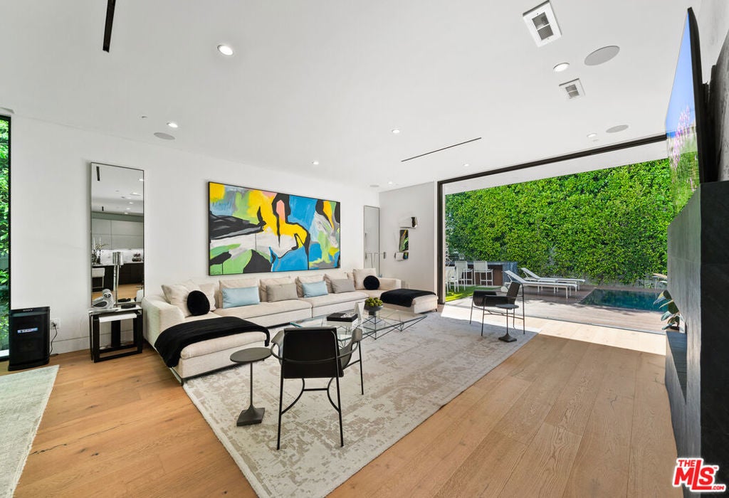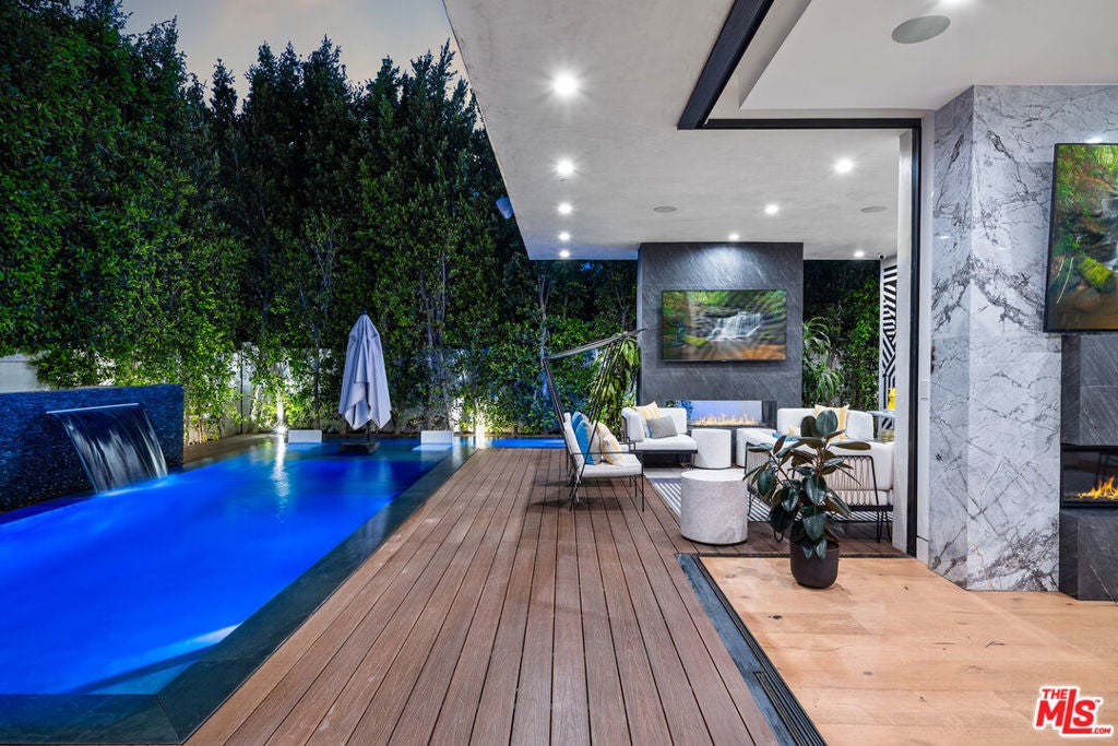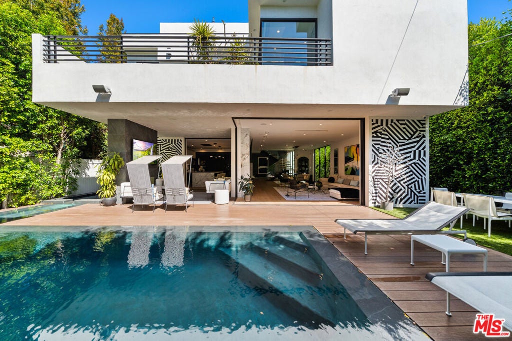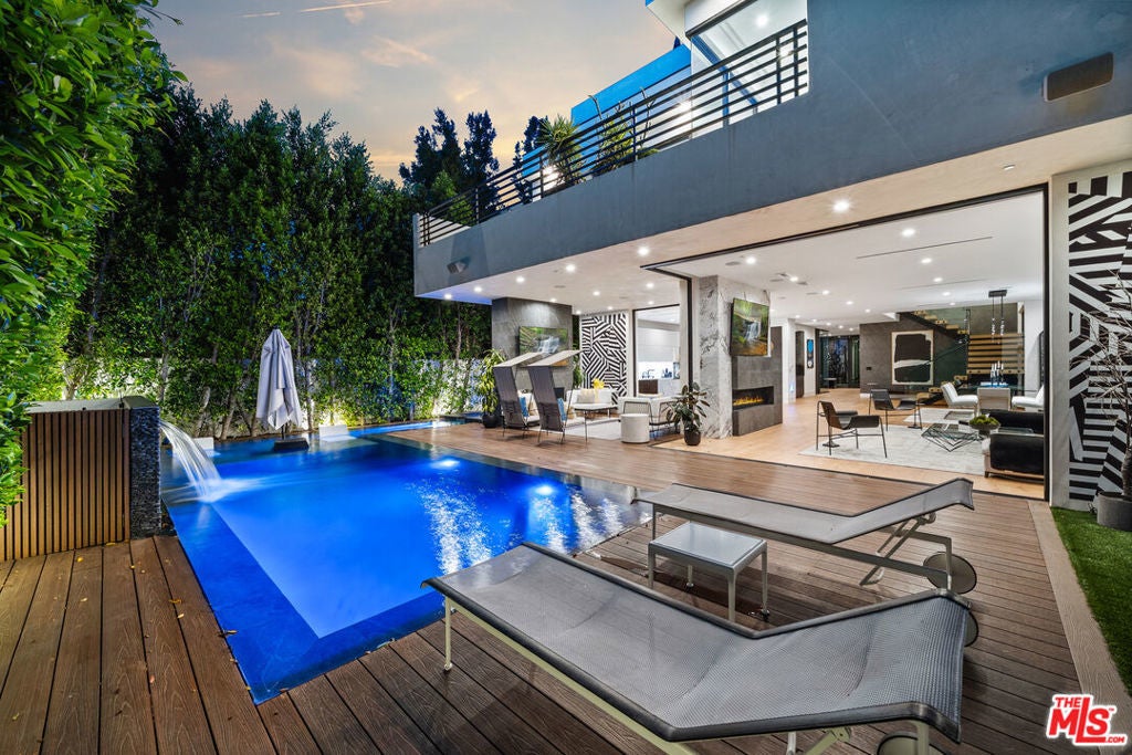Experience the Top of modern luxury in this newer construction home in coveted Beverly Grove. Step inside to find an open-concept, light-filled space featuring striking natural stone finishes and wide plank wood flooring throughout. The Italian kitchen is ideal for hosting and includes marble waterfall countertops and world-class appliances. Indulge the indoor/outdoor lifestyle in the spacious living area with pocket doors opening to the resort style grounds. A floating staircase leads to the spa-inspired primary suite with a dressing room, 2-way fireplace, soaking tub, dual rain shower, and a private deck. Enjoy 360 city light views on the expansive rooftop deck, or entertain on the grounds with zero-edge pool and spa, fireplace, and outdoor kitchen. 3 additional en-suite bedrooms offer plenty of space, while a private office is ideal for remote work. Located just steps from L.As best dining and entertainment, this designer home redefines luxury cosmopolitan living.