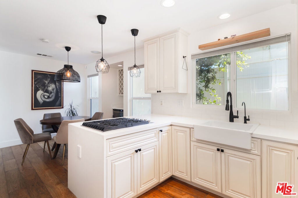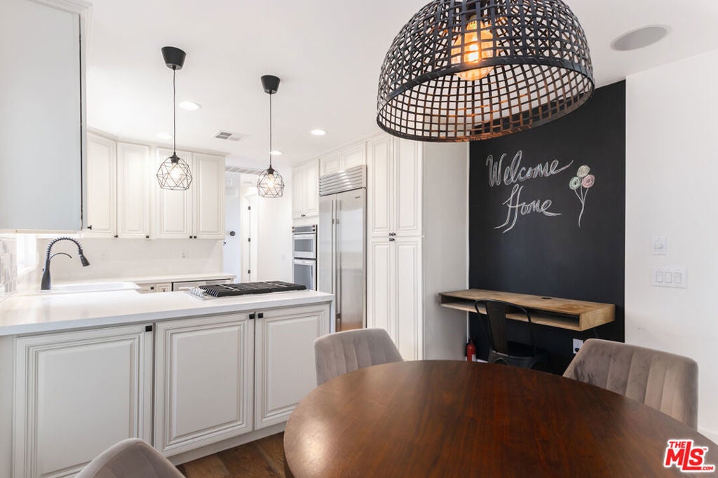 PRICED TO SELL. Nestled serenely South of Ventura Boulevard, this remarkably upscale, contemporary Craftsman Bungalow welcomes you with mature landscaping and a lovely gated driveway, fostering quiet privacy to begin your unique experience within this modern retreat. As you approach, a classic front porch invites you in. Upon entering, you are immediately struck by the clean lines, open spaces and thoughtful artistic touches throughout the home. Designer finishes abound, with wood floors, vaulted ceilings and large double-paned windows bathing the effortless flow of the Living Room, Dining, and Kitchen areas in natural light. The kitchen is a chef's dream, boasting shaker-style cabinetry, stainless steel appliances including a Subzero refrigerator and a custom-built desk. This thoughtfully designed bungalow offers two spacious bedrooms, that include a Primary Suite and beautifully remodeled bathrooms, accommodating all your needs with simplicity and grace. Additional features include central heating and air conditioning, a convenient laundry room with utility sink and a Nest thermostat. The lush, expansive outdoor spaces present endless possibilities, with multiple areas for dining, entertaining, and socializing, including a delightful pergola. Enjoy the convenience of many nearby local dining and coffee favorites, Whole Foods Market, and the scenic Corbin Canyon Park hiking trails, offering a beautiful lifestyle. This sanctuary creates a harmonious experience that will make it difficult to leave, offering the ultimate in ease and lifestyle. A beautifully taken care of home that embodies exquisite taste and style, offering the ultimate and best of modern living in a prime location. Other Amenities include: Tesla EV Charger and Storage Space in the Garage.