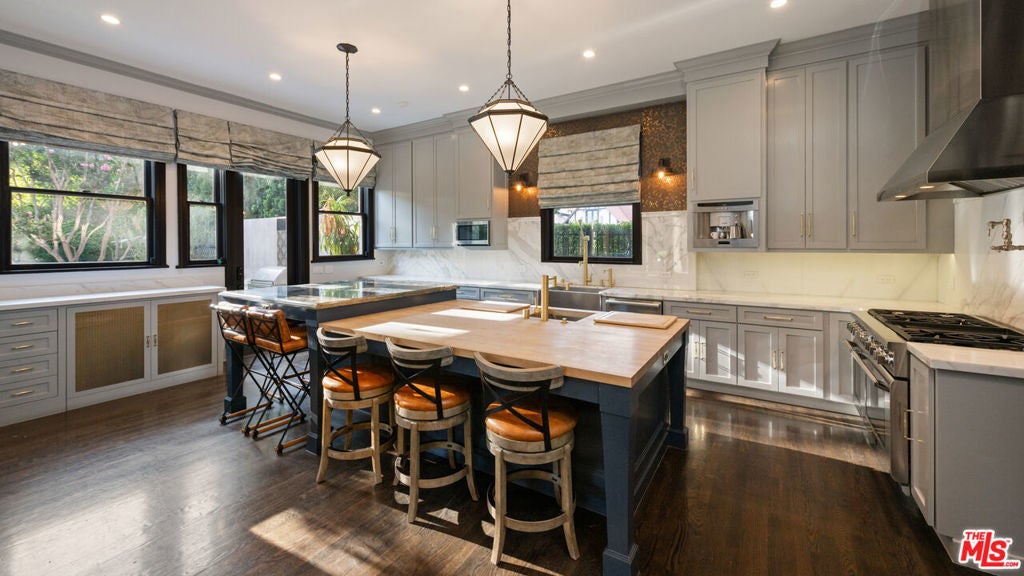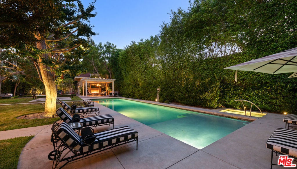Modern luxury meets timeless elegance in this fully restored Hancock Park estate, designed in 1914 by iconic architects Hunt & Burns for Milton Getz, president of Sun Drug Company. Beautifully reenvisioned by Bowery Design Group, the residence evokes the glamour of The Great Gatsby, reimagined for today. The dramatic two-story entry showcases original windows, moldings, wainscoting, and built-ins. The main level includes a formal living and dining room, a vintage game room, and an entertainer's kitchen with a Theramador range, dual refrigerators, and three Miele dishwashers. Upstairs, the primary suite offers a spa-like bath, custom closets, and 2 private terraces. 4 additional bedrooms complete the floor. The 3rd level serves as a retreat for guests or children with a living room, 2 bedrooms, and a bath. The lower entertainment level features a speakeasy, cigar lounge, theater, gym, and second laundry room. Outside, landscaped grounds ensure privacy with mature trees and a secured gated drive. Amenities include a 3-car garage with guest house above, pool and spa, outdoor kitchen and bar, cabana with fireplace, fire pit, EV charger, water softener, backup generator, and security camera system. A rare architectural icon in Hancock Park, restored and reimagined for modern living and entertaining.
