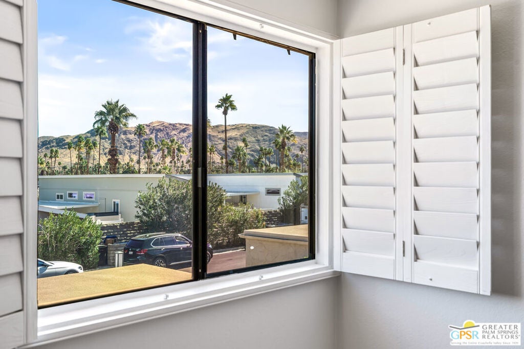DESIGNED BY RENOWNED ARCHITECT HUGH M. KAPTUR, this exceptional South Palm Springs condo seamlessly blends mid-century modern with contemporary comfort. Expansive sliders showcase BREATHTAKING SAN JACINTO MOUNTAIN VIEWS, while sleek lines and sophisticated decor create a warm, inviting atmosphere. Inside, TWO PRIMARY ENSUITES offer space and privacy one featuring a fireplace, spectacular mountain views, and a private balcony. Centered around a fireplace, the living rooms opens effortlessly to a LARGE PATIO OVERLOOKING THE POOL AND LUSH LANDSCAPE, perfect for relaxation or entertaining. An attached garage with ample storage, in-unit laundry, and a DOWNSTAIRS BATHROOM complete with a shower enhance convenience, making this home ideal for both vacation retreats and full-time living. Set within a gated community offering RESORT-STYLE AMENITIES including two POOLS, two SPAS, TENNIS COURTS, a CLUBHOUSE with a FITNESS ROOM, and citrus-lined greenbelts this home is just moments from the best dining, shopping, and outdoor recreation in Palm Springs. An incredible chance to own a slice of Palm Springs in a prime location!