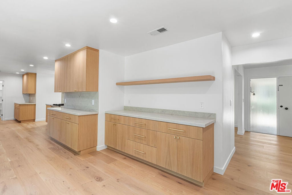 This stunning Mid-Century home, newly renovated with beautiful floors, a refreshed kitchen, and expansive windows, is located in the highly sought-after Laughlin Park community of Los Feliz. Nestled behind private gates, the property offers both exclusivity and tranquility in a premier location.Measuring just under 3,000 square feet, the home features a spacious and functional layout with 3 bedrooms and 2.5 bathrooms. The inviting floor plan includes a formal dining room with a built-in bar and wine fridge, a generous living room filled with natural light, and an oversized family room perfect for gatherings. Wide windows throughout frame picturesque views of the lush backyard.The updated kitchen is equipped with custom cabinetry, new stainless steel appliances, and ample room for a breakfast table, complemented by a walk-in butler's pantry. The family room's original wood-burning fireplace adds warmth and character, while dual sliding glass doors open directly to the private backyardideal for entertaining or relaxing.Freshly painted throughout, the home balances modern upgrades with original Mid-Century charm. Conveniently located near Griffith Park, golf courses, top-rated restaurants, and more, this residence offers the perfect combination of style, comfort, and location.