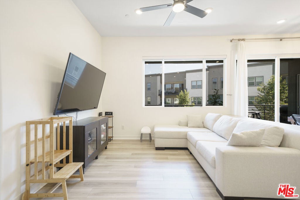 Welcome to a meticulously maintained, like-new residence in a beautifully designed eco-friendly community. Originally built in 2022 and thoughtfully improved by its current ownersMr. and Mrs. Clean themselvesthis single-level gem is nestled within a three-story building and offers the perfect blend of style, function, and comfort in one of the area's top-rated school districts.The home features a spacious open-concept floor plan that seamlessly connects the kitchen, dining, and living areas, drenched with natural light. High-quality laminate flooring runs throughout the bedrooms and main living spaces, adding warmth and sophistication. The kitchen is equipped with sleek granite countertops and a large center island offering ample cabinet storageperfect for both daily living and entertaining. Just beyond the dining area, a sliding glass door opens to a generously sized balcony where you can unwind and take in breathtaking sunset views over the mountains.The primary suite is a serene retreat, complete with a spa-inspired bathroom featuring elegant double vanities. All windows throughout the home offer a peaceful view of the beautifully landscaped and maintained courtyard, creating a sense of privacy and calm. The home also includes a side-by-side two-car garage with additional space for storage, along with a dedicated EV charging station to accommodate your electric vehicle needs.This residence is powered by solar energy, significantly reducing electricity costs while contributing to a greener lifestyle. Residents enjoy access to an array of resort-style amenities, including a sparkling community pool, clubhouse, playground, bike track, lush gardens, and scenic walking trails. This is a rare opportunity to own a turnkey home that offers all the benefits of new construction, enhanced by thoughtful upgrades and pristine upkeep. Come experience a lifestyle of comfort, convenience, and modern elegance - schedule your private showing today.