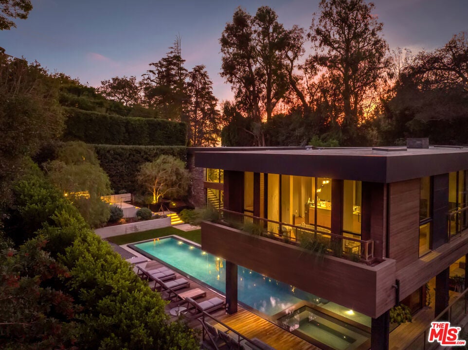 Nestled within the prestigious gated enclave of Oak Pass Road in Beverly Hills, this 5,442-square-foot modern sanctuary embodies a rare synergy of architecture and nature. Positioned on a peaceful .32-acre lot, this 3-bedroom, 5-bathroom retreat offers a secluded haven with panoramic canyon and hillside vistas. Thoughtfully crafted with wood, stone, glass, and fire elements, each room welcomes the outdoors through expansive floor-to-ceiling glass, creating a zen-inspired atmosphere for ultimate relaxation.The home's L-shaped design and sculpted landscape enhance privacy, embracing the surrounding natural beauty. A dramatic two-story atrium fills the space with light and greenery, complemented by floating fire features and suspended gardens that deepen the sense of calm. Flowing seamlessly from the formal dining room, the open living area connects to an expansive kitchen with dual sided fireplace, that opens to the outdoor covered lounge area for effortless entertaining. The primary suite appears to float above a saltwater infinity pool, offering breathtaking views, while two guest suites rest under the canopy of a majestic 100-year-old oak tree.Terraces along the property reveal sweeping views of the private backyard and surrounding mountains, with an inviting spa and lounge area designed for alfresco dining and gatherings. A dedicated gym and wellness area, private studio/office, theater room, and an outdoor kitchen with a fire pit complete this residence, a true celebration of refined, tranquil living in an extraordinary setting.Oak Pass Road is an exclusive gated neighborhood in Beverly Hills Post Office situated west of North Beverly Park, with only 42 private residences offering unparalleled access to the shopping, dining and nightlife of Rodeo Drive and the iconic Beverly Hills Hotel. Simo Designs.