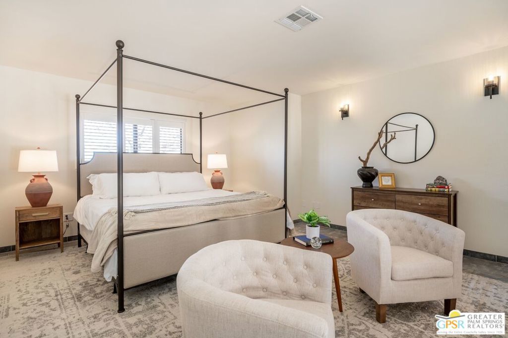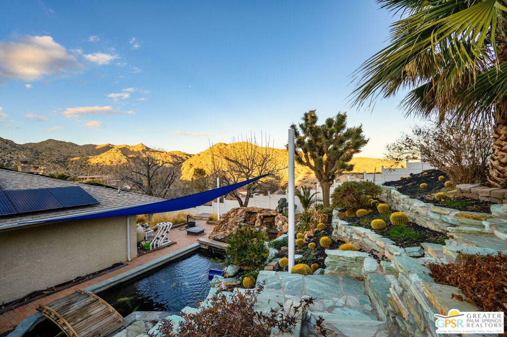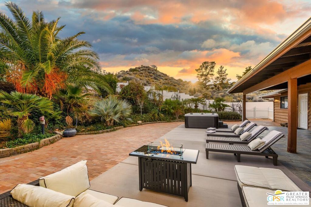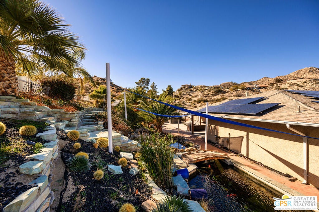 ATTENTION Buyers, The Koi pond has been evaluated and confirmed it can be converted to a pool. Ready to assist in buy down of rates for the right offer. Discover Ridge Oasis, a stunning 3-bedroom, 2.5-bath fully-furnished retreat set against the hills of Yucca Valley's serene Country Club neighborhood. Perfect as a primary residence, a vacation escape, or a high-potential investment, this fully furnished home blends desert serenity with modern elegance, just minutes from Joshua Tree National Park. Inside, the open floor plan is bright and spacious, with high ceilings and clean modern finishes. The centerpiece is a gourmet kitchen, outfitted with dual islands, two sinks, and premium appliances; it's a chef's dream, perfect for family gatherings or entertaining. Enjoy morning coffee at the breakfast nook or host dinner parties in the elegant dining room, with seating for eight, complete with a cozy reading corner overlooking the expansive living area. The living room, bathed in natural light, offers breathtaking desert views through its expansive windows. Avast stone fireplace completes the space, creating a seamless connection to nature. The primary suite is a true haven, offering a sitting area, a spa-inspired ensuite with dual vanities, and walk-out doors to a serene patio - perfect for starlit evenings. Two guest bedrooms share a spacious bathroom with dual zones for privacy. A powder room and full laundry room round out the interior layout. Outside, the gated property invites exploration. Wonder paths lined with palm and Joshua trees, relax by the exotic Japanese Koi pond (which includes complete pool infrastructure for conversion), or stargaze from the upper deck's sweeping views. The hot tub and spacious entertainment patio make it easy to host and unwind. The home also comes with a three-car garage, a large custom shed, and an upgraded solar system (keeping utility costs low).Just a short drive from local dining, shopping, and hiking, Ridge Oasis offers seclusion and accessibility. Schedule your tour today to claim this desert masterpiece as your forever home!