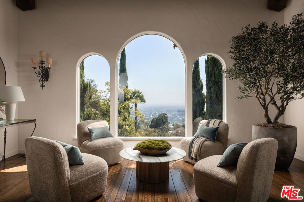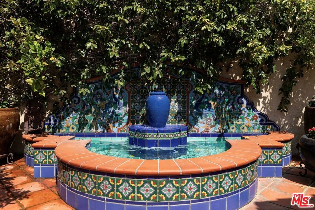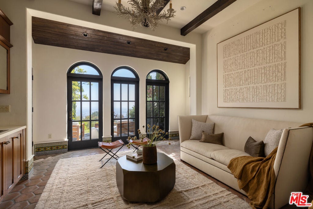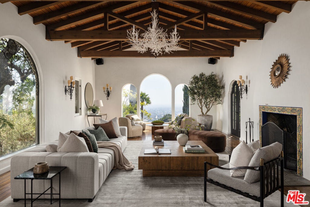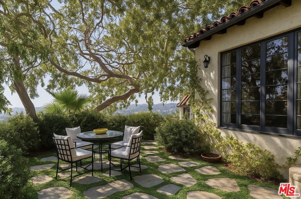 This restored Spanish villa sits on a large promontory offering sweeping views from the city to the ocean. It combines modern amenities with the timeless character of its original period design. A gracious wood beamed rotunda entrance, a soaring vaulted truss ceiling in the living room, large picture windows, French doors with original carved arches, rich wood flooring and Malibu tile accents throughout are just a few of the home's striking design features. The floor plan features a center-island kitchen, wood-paneled office, family/media room, formal living room with a bar and fireplace, formal dining room, and two powder rooms. An interior circular stairwell leads to a spectacular guest suite with a private exterior entrance, an elegant bathroom, and a separate sitting room with a kitchenette. The exquisite grounds include an inner courtyard, multiple patios, an expansive lawn, and a striking swimming pool, all set within a secluded cul-de-sac in The Oaks community.