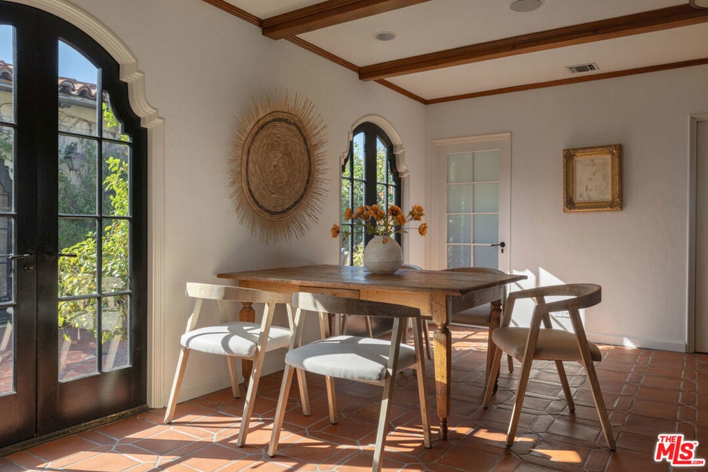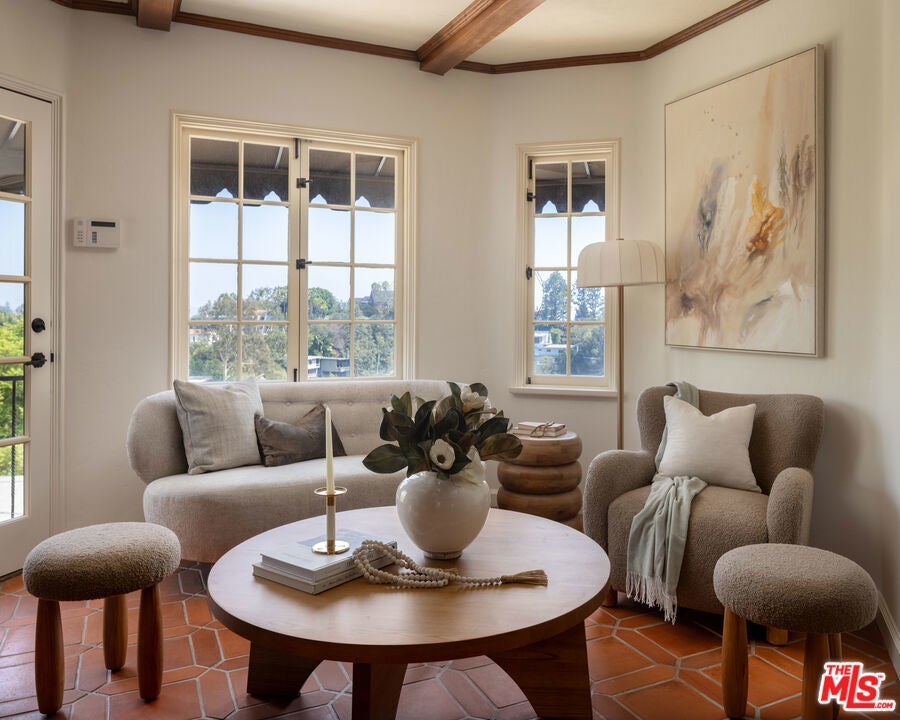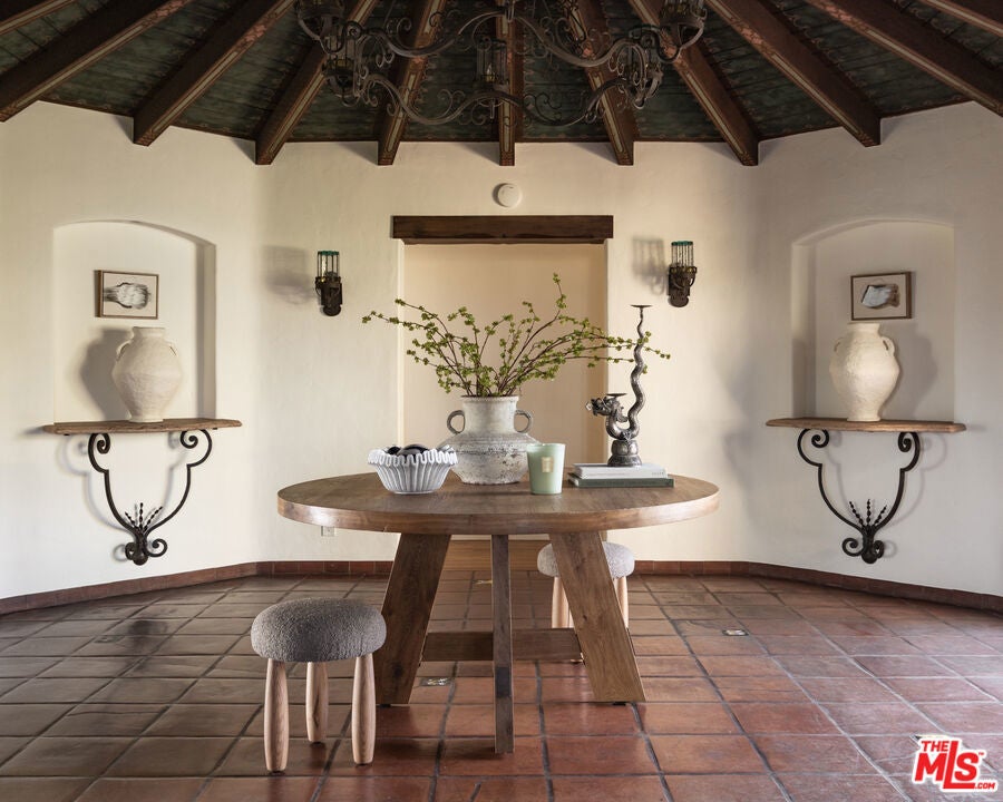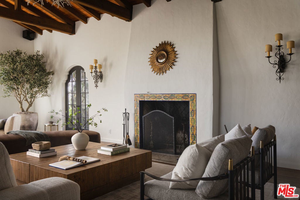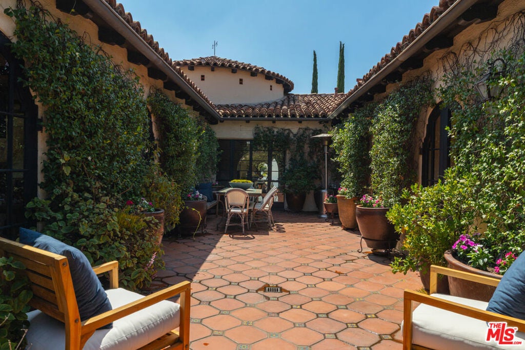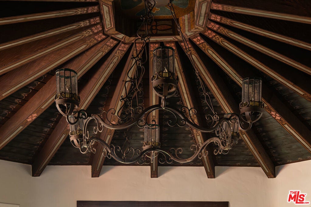 This restored Spanish villa sits on a large promontory offering sweeping views from the city to the ocean. It combines modern amenities with the timeless character of its original period design. A gracious wood beamed rotunda entrance, a soaring vaulted truss ceiling in the living room, large picture windows, French doors with original carved arches, rich wood flooring and Malibu tile accents throughout are just a few of the home's striking design features. The floor plan features a center-island kitchen, wood-paneled office, family/media room, formal living room with a bar and fireplace, formal dining room, and two powder rooms. An interior circular stairwell leads to a spectacular guest suite with a private exterior entrance, an elegant bathroom, and a separate sitting room with a kitchenette. The exquisite grounds include an inner courtyard, multiple patios, an expansive lawn, and a striking swimming pool, all set within a secluded cul-de-sac in The Oaks community.