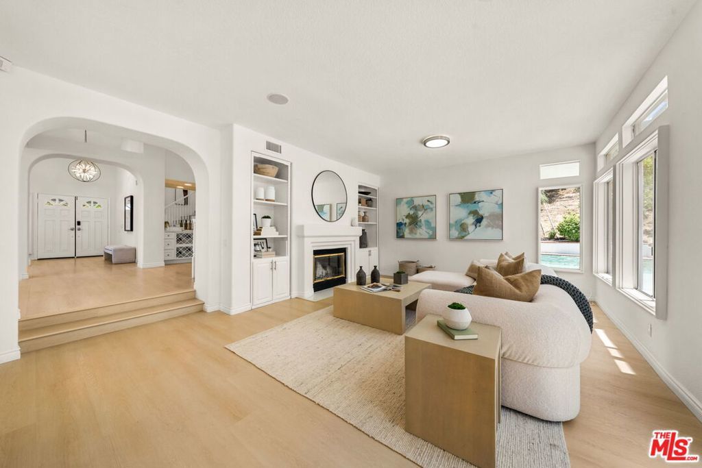 Welcome to this turnkey, renovated view home in the highly sought-after Mulholland Heights community of Calabasas where privacy, natural light, and open-concept living come together beautifully. Just across the street from a serene private park and playground, this light-filled residence features an open floor plan, perfect for modern living and entertaining. Enjoy a seamless indoor-outdoor lifestyle with a sparkling pool, spacious patio, and a flat grassy area ideal for kids and pets.Inside, soaring two-story ceilings and wide-plank flooring set the tone for refined yet comfortable living. The spacious living and dining areas flow effortlessly, framed by mountain views and chic modern finishes. At the heart of the home is a lovely kitchen equipped with a large center island, eat-in bar, white shaker cabinets, stainless steel appliances, and stylish new countertops. A cozy breakfast nook and an adjoining family room with built-in bookshelves and a fireplace complete the main living space.The home offers four well-appointed bedrooms, including one on the main floor and three upstairs. The luxurious primary suite is a true retreat, featuring a private sitting area with a balcony, fireplace, spa-like bathroom, and an oversized walk-in closet.Step outside to your private backyard oasis an entertainer's dream with a resort-style pool and spa, ample patio space for dining and lounging, and a lush grassy area perfect for play and pets. Whether you're enjoying a peaceful afternoon or hosting guests, the outdoor space is designed for relaxation and fun.Located directly across from a scenic park and minutes from hiking trails, top-rated Las Virgenes schools, and the best of Calabasas living, this home is ready for you to move right in.Bonus Features: Owned solar panels, EV charging station, a separate-access office space within the 3-car garage, 24-hour security patrol, plus Spectrum TV & internet included in the HOA.
