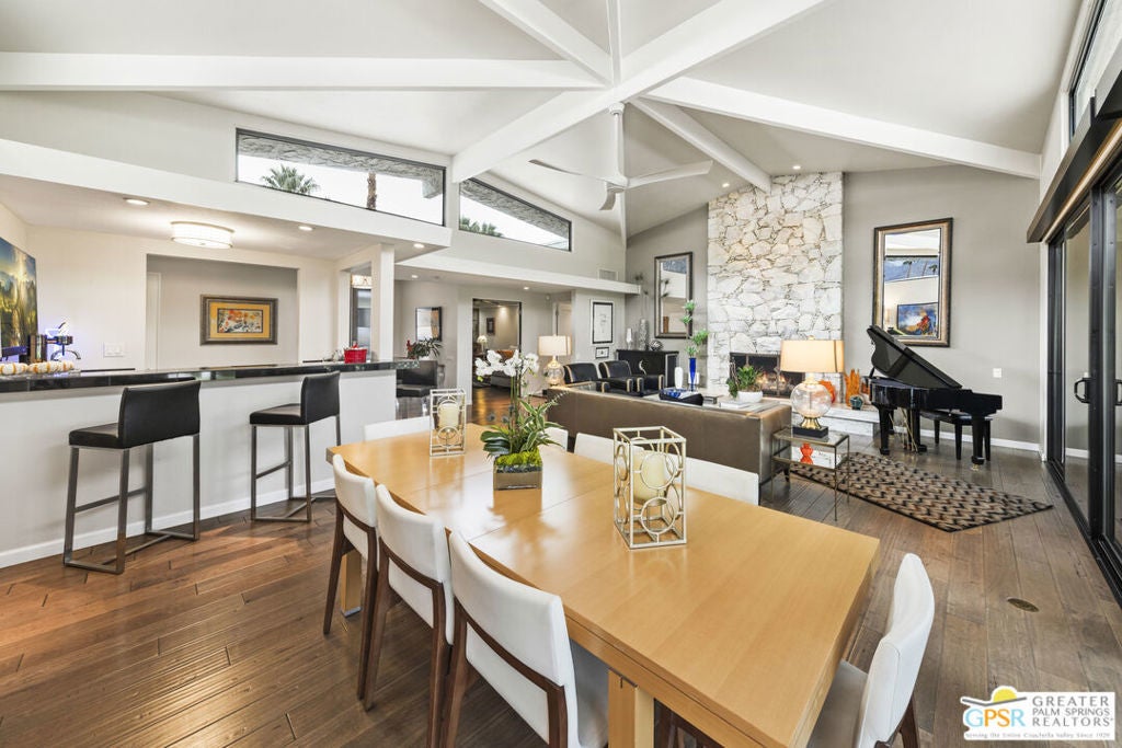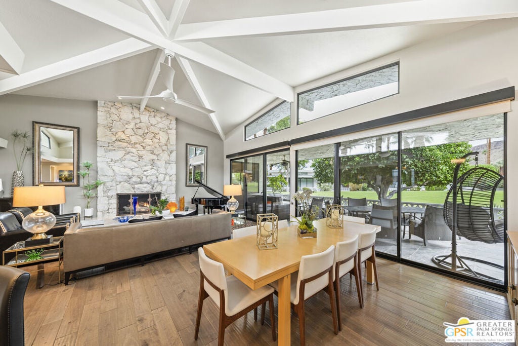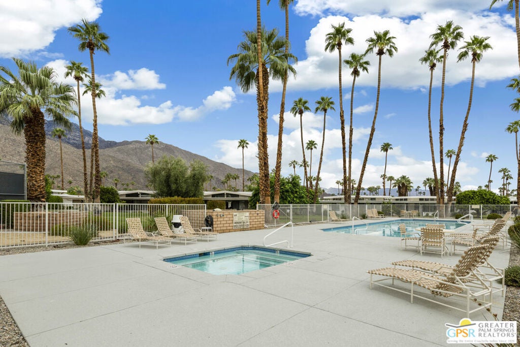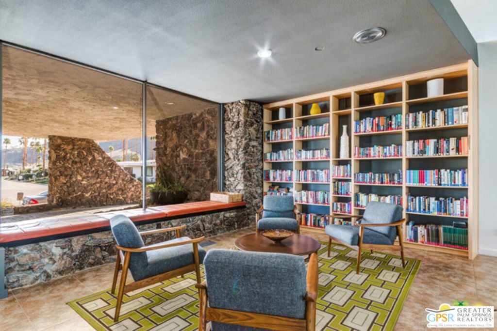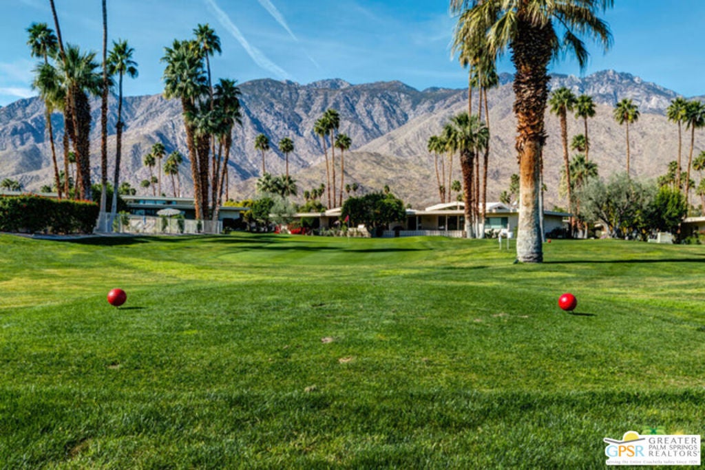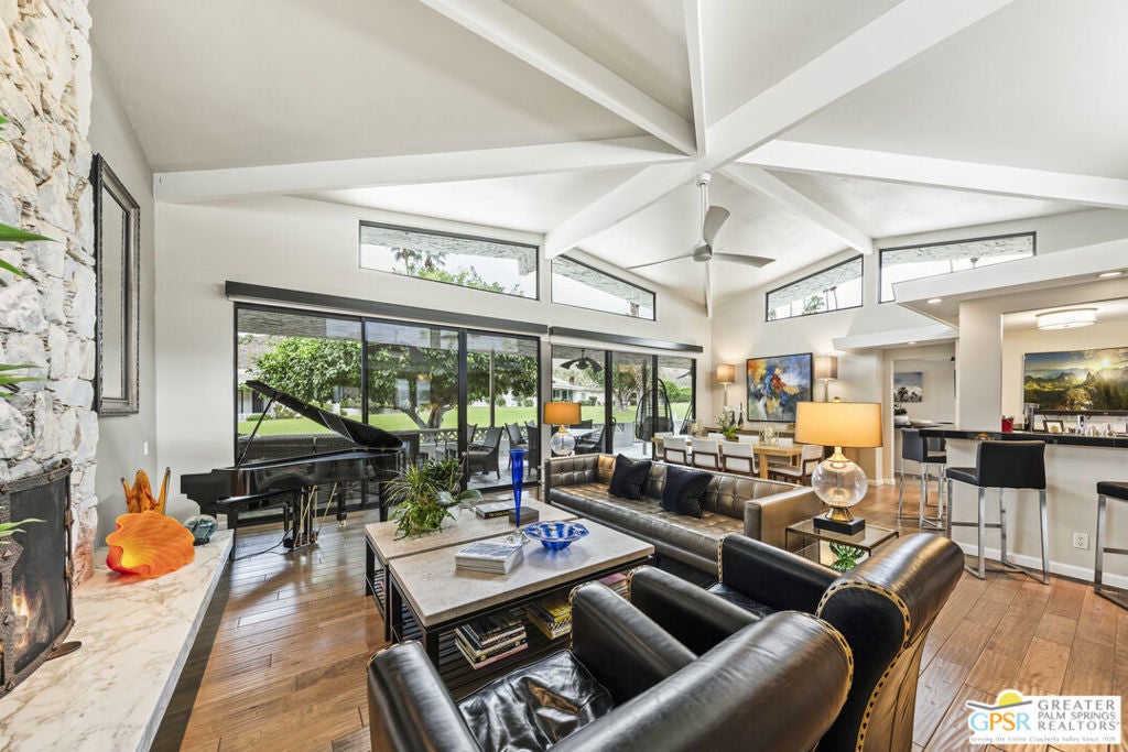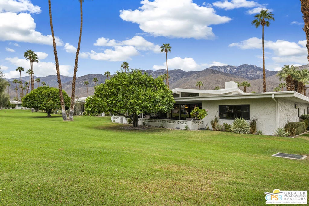 Experience Mid-Century Modern Living in Canyon Estates! Discover the hallmark of mid-century modern architecture in the sought-after Canyon Estates community, where acclaimed architect Charles E. Du Bois designed homes that blend timeless style, comfort, and sophistication - perfectly capturing the quintessential Palm Springs iconic lifestyle. Step through an elegant reeded glass double-door entry into a welcoming foyer that opens to a stunning living room, complete with a signature umbrella open beam style ceiling. Walls of glass and iconic clerestory windows frame dramatic east-facing mountain views and invite abundant natural light. The space flows seamlessly to a broad, covered patio overlooking a serene greenbelt with the mountains beyond - ideal for indoor-outdoor entertaining. A floor to ceiling stone-clad fireplace with white marble hearth and "Rat Pack" ready wet bar add to the authentic Palm Springs vibe. This thoughtfully upgraded, move-in-ready home is furnished in a warm neutral palette and features: 2 great ensuite primary bedrooms plus 2 additional bedrooms (currently used as a den and office), 3 well- appointed bathrooms, custom wood built-ins in the den, add functionality and elegance. Modern upgrades include all new Milgard windows, doors, and clerestory windows. A bonus eat-in breakfast area is perfect for morning coffee and extended views. This and much more in easy single level luxury living. Residents enjoy an array of amenities, including 15 pools, 12 spas, tennis and pickleball courts, a PAR-3 golf course, and a clubhouse with a newly upgraded fitness center. These offerings foster an active and social lifestyle in a resort-like environment. With its low-density layout, Canyon Estates provides generous open spaces, a peaceful setting, and a true sense of community.