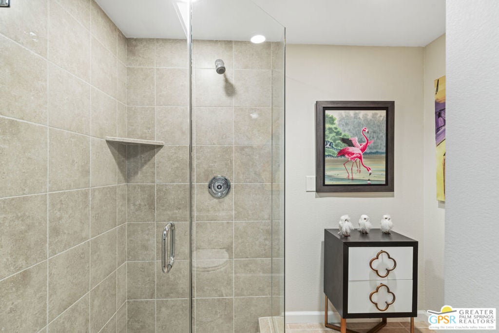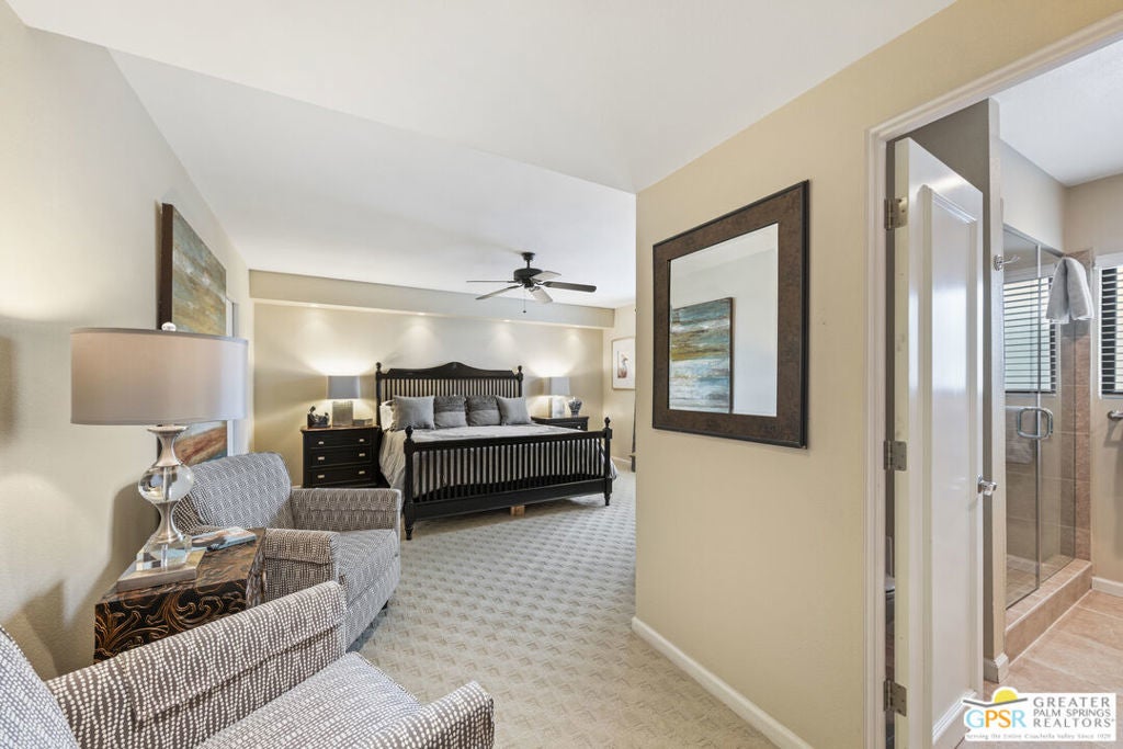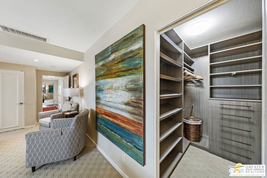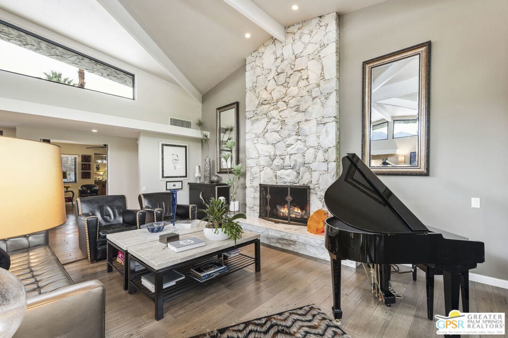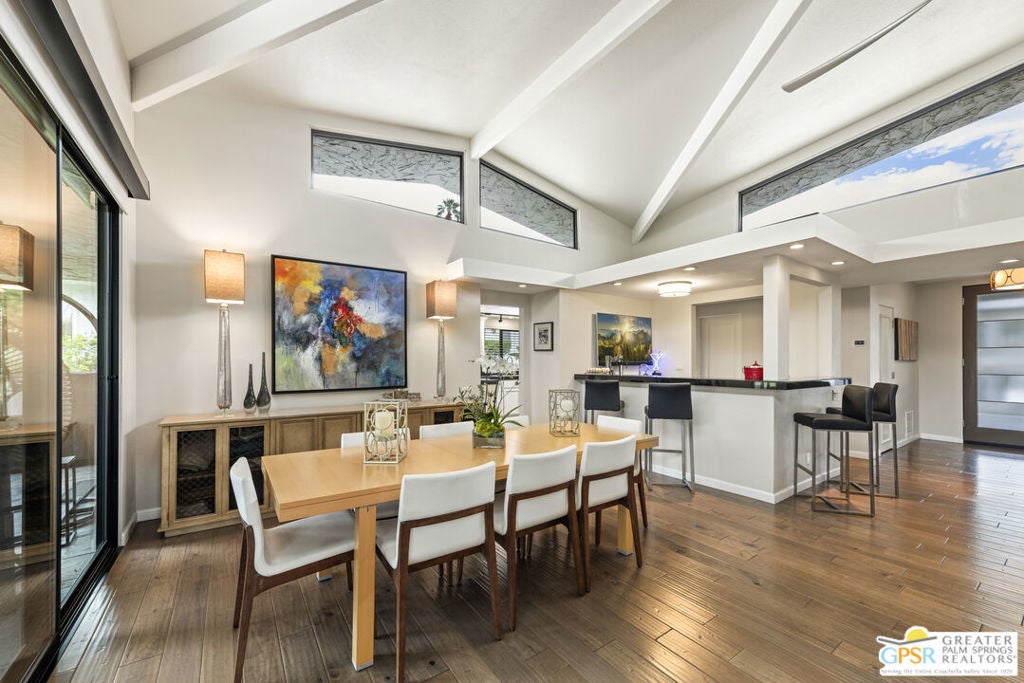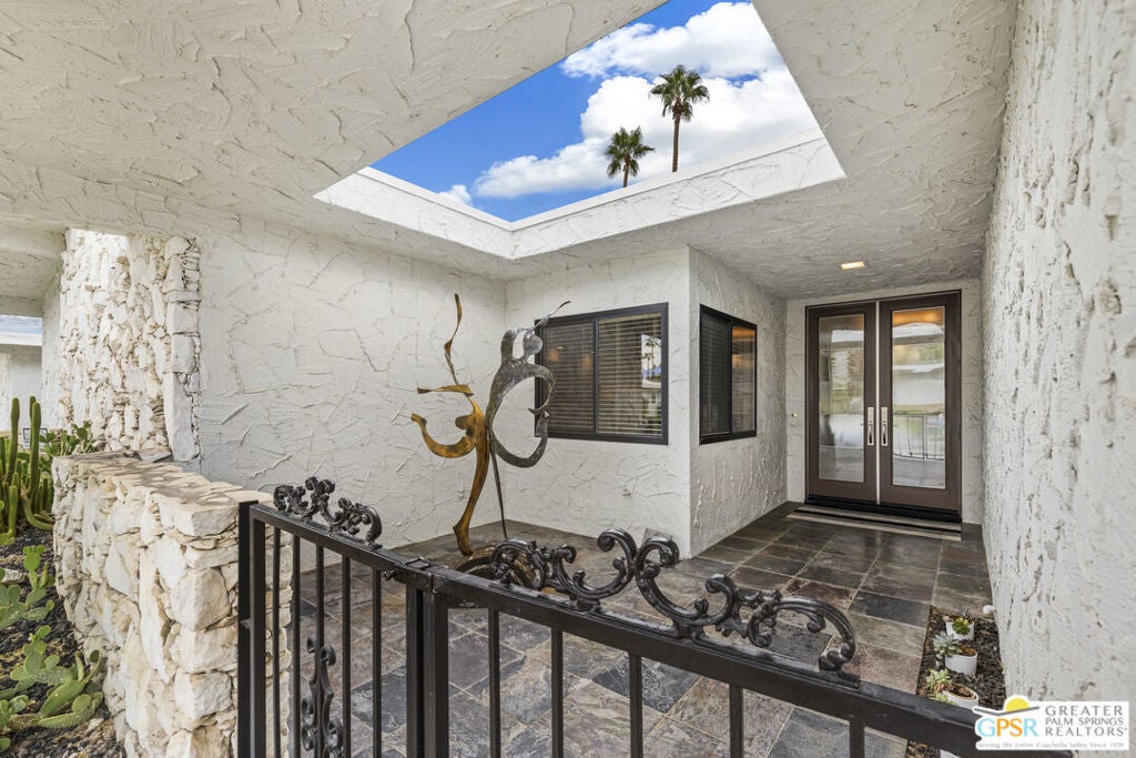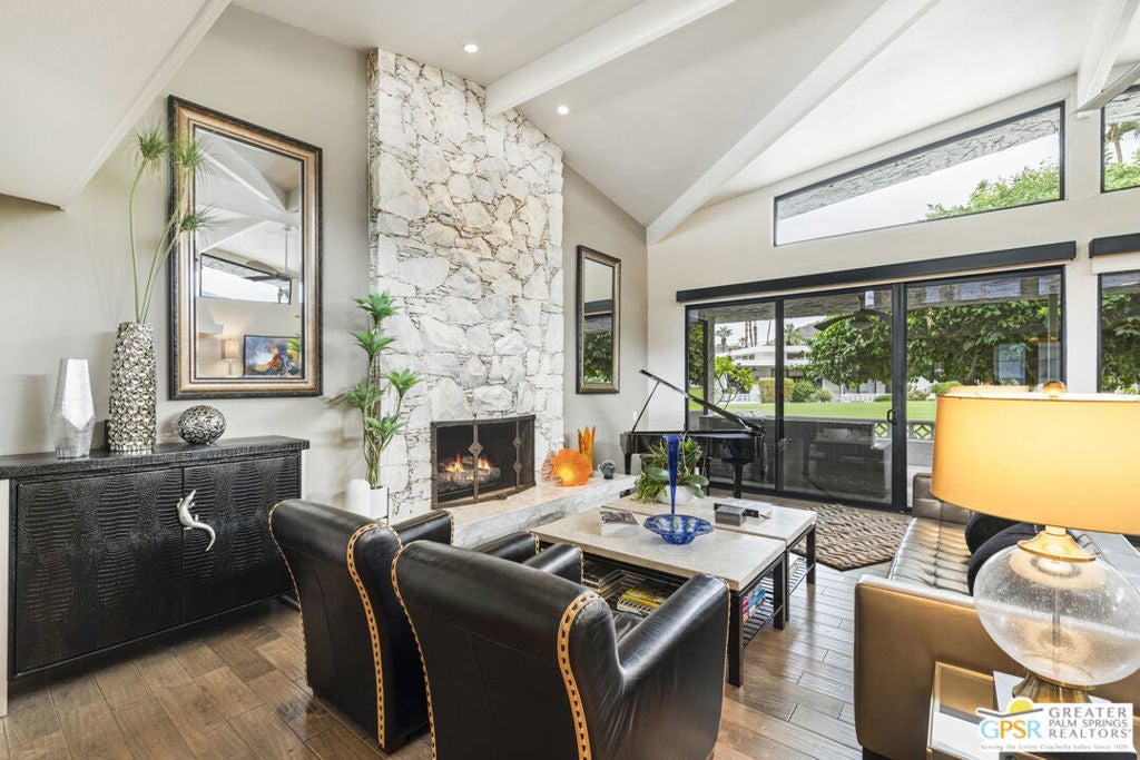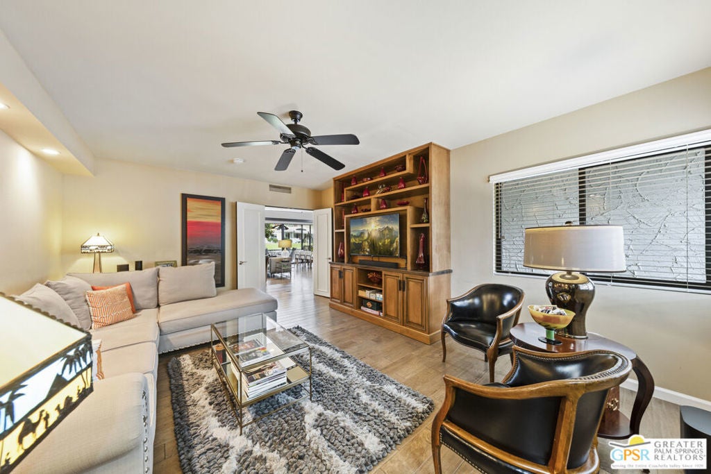 Experience Mid-Century Modern Living in Canyon Estates! Discover the hallmark of mid-century modern architecture in the sought-after Canyon Estates community, where acclaimed architect Charles E. Du Bois designed homes that blend timeless style, comfort, and sophistication - perfectly capturing the quintessential Palm Springs iconic lifestyle. Step through an elegant reeded glass double-door entry into a welcoming foyer that opens to a stunning living room, complete with a signature umbrella open beam style ceiling. Walls of glass and iconic clerestory windows frame dramatic east-facing mountain views and invite abundant natural light. The space flows seamlessly to a broad, covered patio overlooking a serene greenbelt with the mountains beyond - ideal for indoor-outdoor entertaining. A floor to ceiling stone-clad fireplace with white marble hearth and "Rat Pack" ready wet bar add to the authentic Palm Springs vibe. This thoughtfully upgraded, move-in-ready home is furnished in a warm neutral palette and features: 2 great ensuite primary bedrooms plus 2 additional bedrooms (currently used as a den and office), 3 well- appointed bathrooms, custom wood built-ins in the den, add functionality and elegance. Modern upgrades include all new Milgard windows, doors, and clerestory windows. A bonus eat-in breakfast area is perfect for morning coffee and extended views. This and much more in easy single level luxury living. Residents enjoy an array of amenities, including 15 pools, 12 spas, tennis and pickleball courts, a PAR-3 golf course, and a clubhouse with a newly upgraded fitness center. These offerings foster an active and social lifestyle in a resort-like environment. With its low-density layout, Canyon Estates provides generous open spaces, a peaceful setting, and a true sense of community.