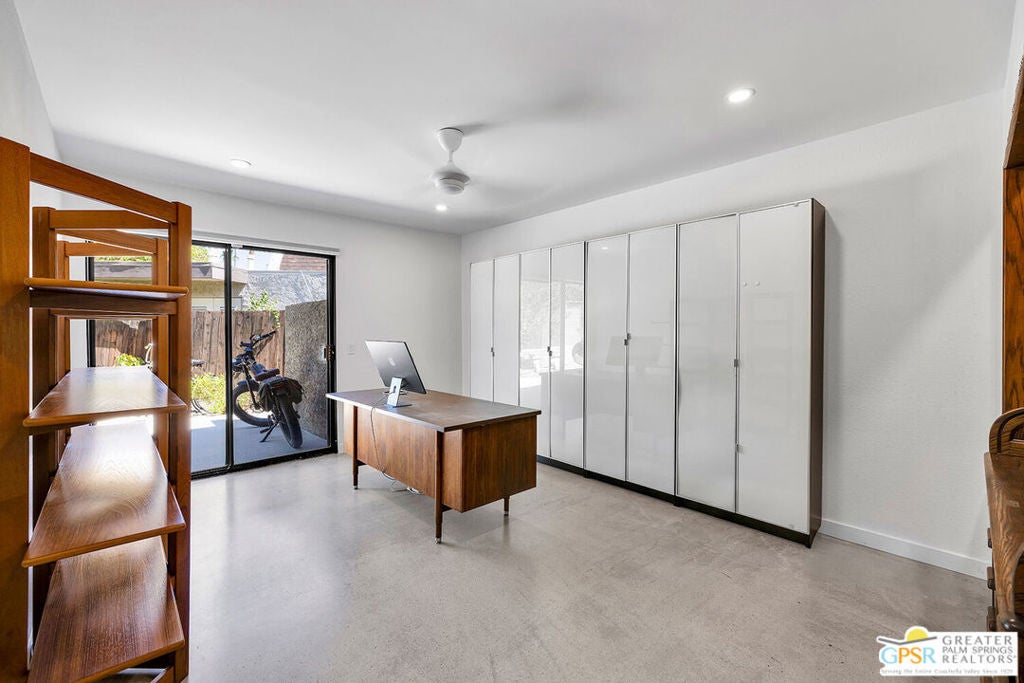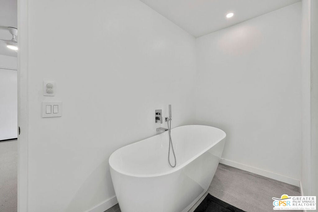 This home presents a rare opportunity to own a piece of architectural history, enhanced with modern comforts and eco-conscious upgrades. This stunning free-standing home, designed by iconic mid-century modern architect Donald Wexler, is in the private, gated community of Rancho Estates. The interior is thoughtfully updated and features sleek polished cement flooring, energy-efficient LED lighting, and a renovated kitchen with all new appliances. The focal point of the living room is a floor to ceiling mid-century modern inspired fireplace. Bathrooms have been stylishly upgraded with new countertops, sinks, faucets, and toilets, while the luxurious primary bathroom includes a new shower and a free-standing soaking tub. Custom closets enhance a large walk-in closet in the primary bedroom. Comfort and sustainability meet with a dual-zoned HVAC system, a 14-panel owned solar system, and an EV charging station. Situated on one of the largest lots in the community (6,098 sq ft), the beautifully landscaped backyard offers a private oasis with a pebble-tech salt-water pool and spa, mature citrus trees, and an outdoor kitchen, perfect for entertaining or unwinding in style. For a complete list of improvements, see documents. Community amenities include a swimming pool, tennis courts, pavilion and beautifully maintained common areas. HOA includes internet and cable.