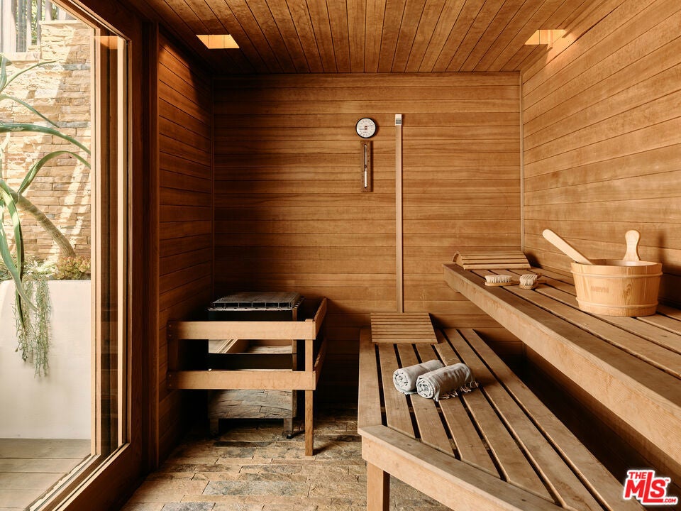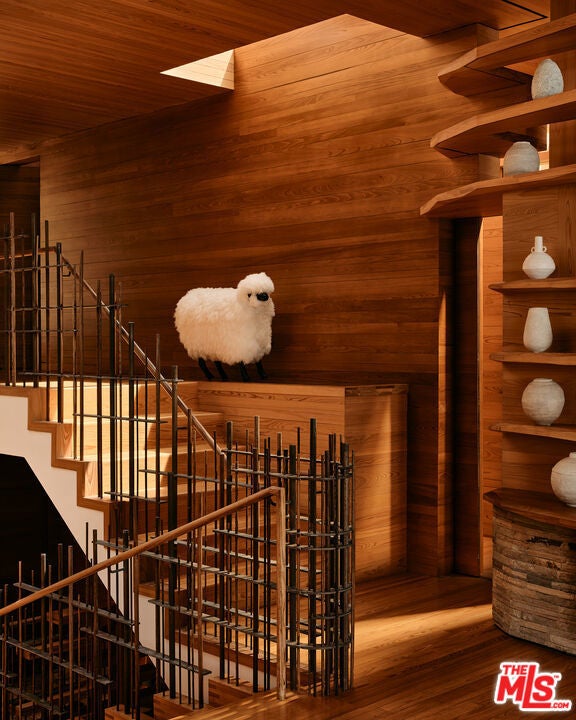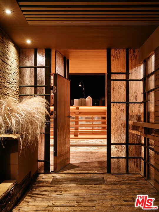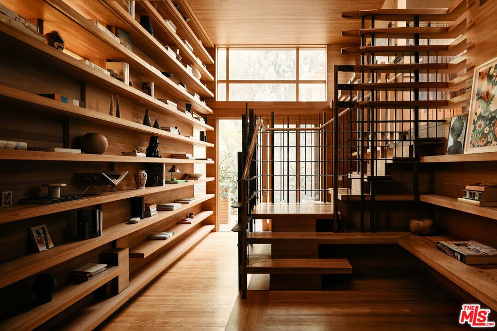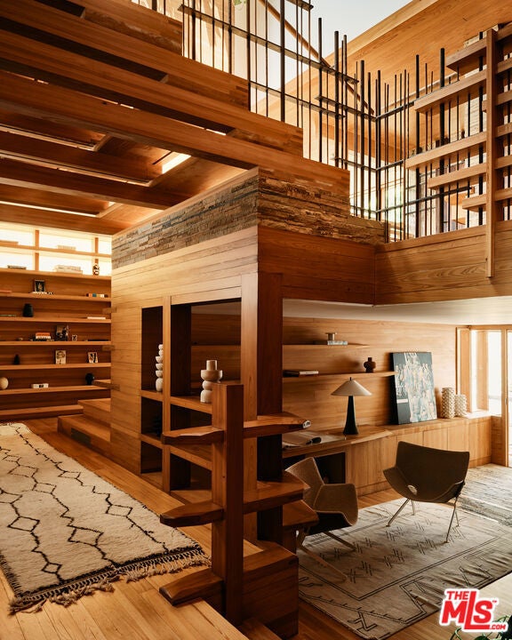 This architectural marvel features an intricate blend of vertical and horizontal planes of wood, stone, and metal, bathed in natural light streaming through sliding glass walls, strategically placed skylights, and an artistic glass floor. Designed by architect Jay Vanos, the finest woodworkers used American Southern cypress for its durability and golden hue on the floors and walls, complemented by a soaring wave redwood ceiling. With ocean views from almost every room, the home boasts a great room with a fireplace, a sitting/dining area, a gourmet kitchen with high-end appliances, and glass walls that open to an outdoor deck perfect for intimate or lavish entertaining. It includes three spacious master suites with fireplaces, luxurious spa-like baths, large closets, and ocean view decks, along with two additional bedrooms. Additional spaces include a sun-filled office/den, a cozy reading/library area, an art studio, an indoor sauna, a zen-style wellness area with sauna and cold plunge, and more. Steps lead to a lower-level surfboard storage area and provide direct access to the beach and renowned Latigo surf spot, making it an ideal home for surfing enthusiasts.