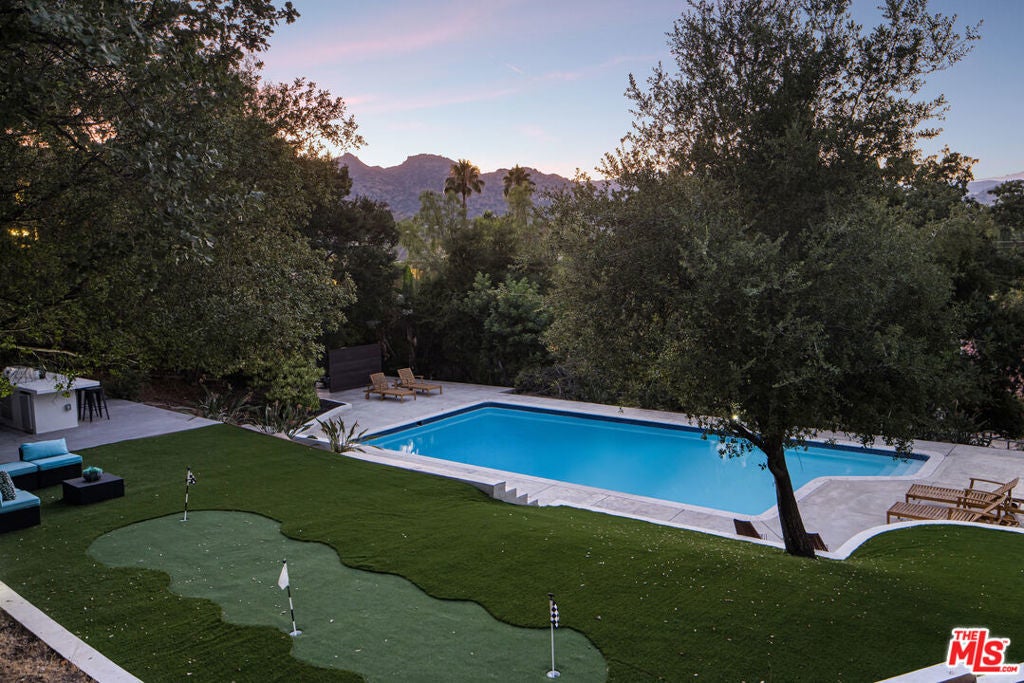 From the moment the automated gates open, The Sky Estate at 9425 Gierson feels less like a residence and more like a private retreat in the clouds. A sculpted drive winds past a detached four car garage and curated California modern landscaping of olive and willow trees, specimen succulents, and native cacti. As you ascend the ridge, the city fades away and the horizon opens wide. Inside, a dramatic living room with 12-foot ceilings and floor to ceiling glass frames panoramic mountain and valley vistas turning every sunset into part of the decor. Wide plank oak floors lead into an open dining area and chef's kitchen with Italian cabinetry, a quartz waterfall island, and a complete Thermador suite, designed for effortless entertaining and everyday comfort. The main level also offers a junior en-suite for guests or multigenerational living, a powder bath, mudroom, laundry, and a lounge with canyon views. Floating Brazilian stairs rise to two secondary bedrooms and a breathtaking primary suite, where mornings begin with sunrise over the ridgeline. The spa inspired bath showcases a freestanding tub, dual rain showers, and custom wardrobe storage. Outdoors, the estate unfolds like a hillside resort: a pool with built-in BBQ, a putting green, and a sky-deck with firepit capturing 270-degree city-light views. With nearly two acres of LARA-zoned land, the property also carries rare equestrian-friendly allowances an uncommon advantage in Los Angeles that expands the lifestyle possibilities of this private sanctuary. Thoughtfully engineered with dual-zone HVAC, tankless water heater, 400-amp service, EV charging, and Low-E glazing, The Sky Estate offers architectural presence, modern luxury, and a sense of escape ready to welcome its next chapter.