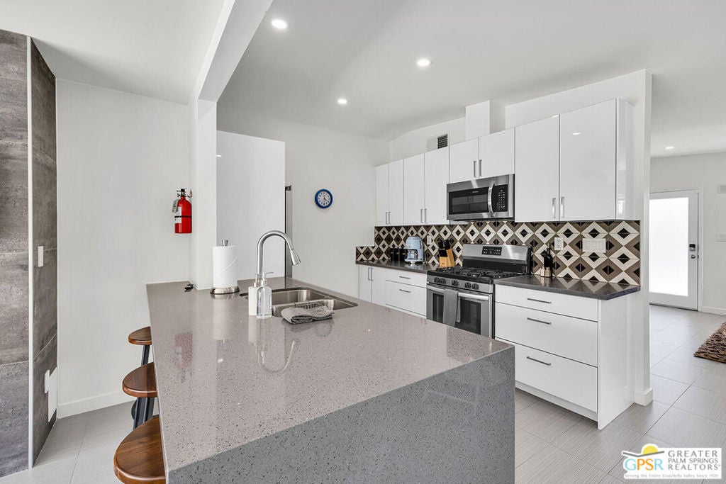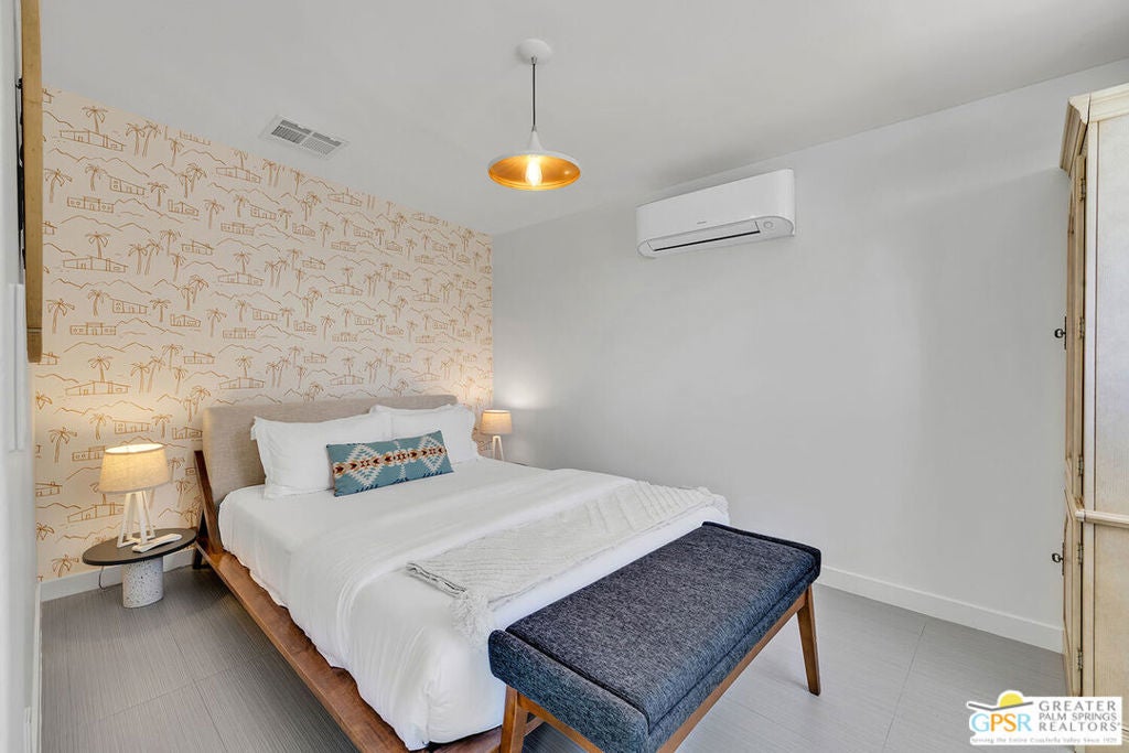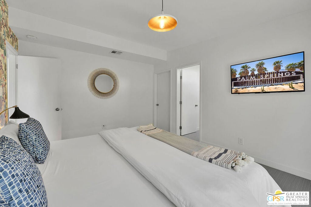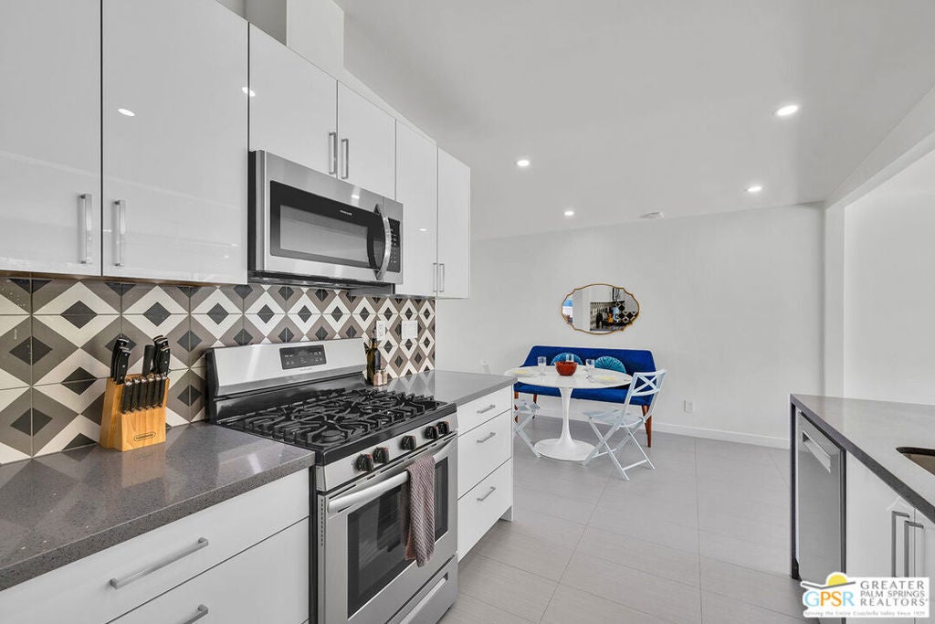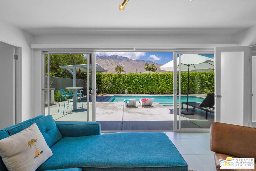 Discover this beautifully updated 1954 Meiselman-built mid-century home, perfectly situated in the heart of Movie Colony East in Palm Springs. This stylish retreat features two spacious bedrooms, two full bathrooms, and a versatile den that can easily serve as a third bedroom, home office, art studio, or gym. Recently renovated, the home has a sleek open-concept kitchen, modern bathrooms, and generously sized bedrooms. The kitchen is a chef's dream, offering panoramic views through a wall of glass that overlooks the sparkling pool and the serene mountain backdrop. Step outside and enjoy the ultimate desert lifestyle with a refreshing swim in the recently added pool, a soak in the spa, or a barbecue followed by alfresco dining beneath the built-in shade structure. As the sun sets, gather around the cozy fire pit for relaxing evenings and great conversation. The fully gated property includes a one-car garage, ample off-street parking, and a fully owned solar system with a Tesla battery helping you save on energy costs year-round. Last but not least, this home is offered turnkey furnished. Interested in rental income? Check with the City of Palm Springs about obtaining a Junior Rental Permit. Contact the agent today for a private showing of this iconic Palm Springs home!