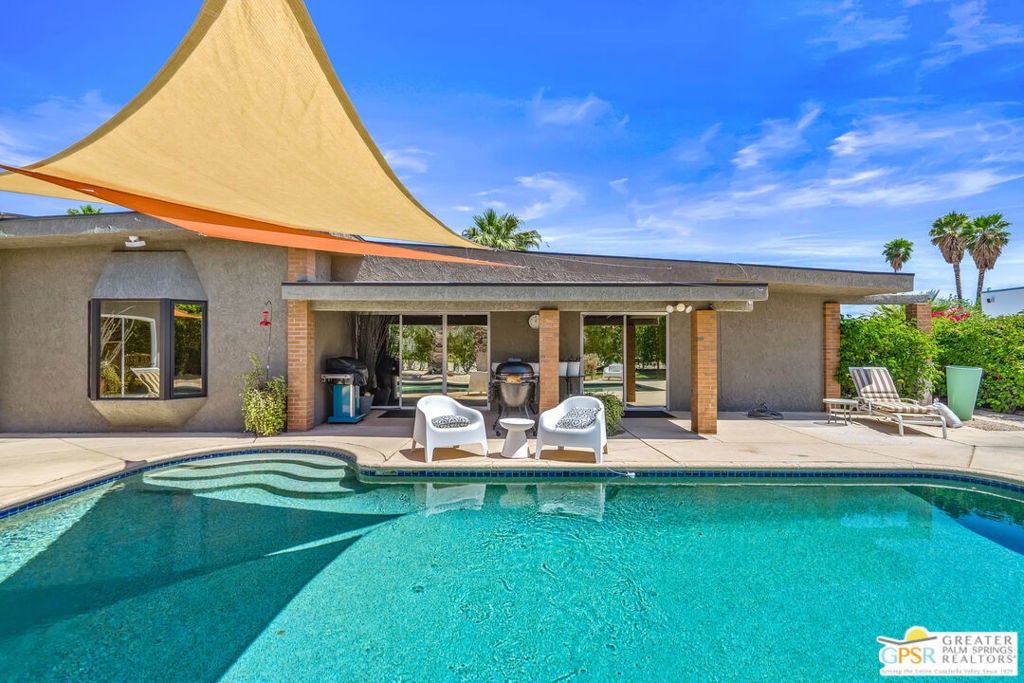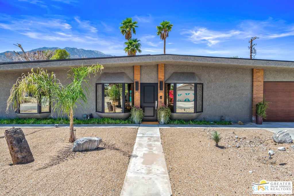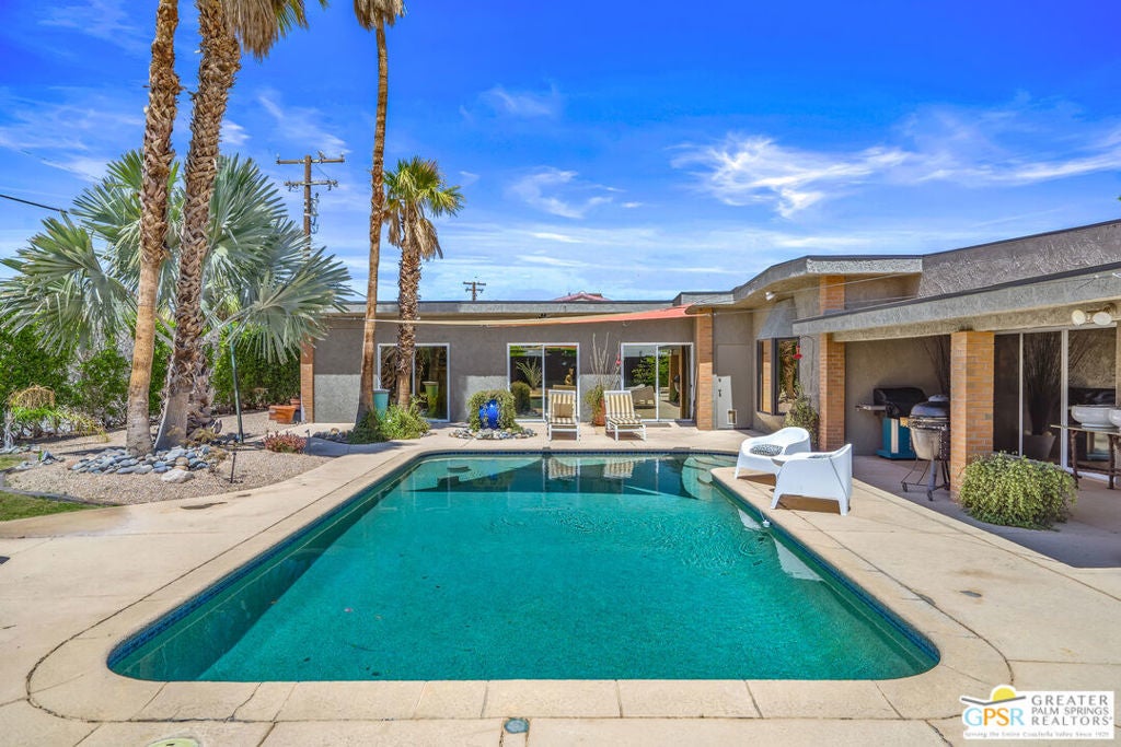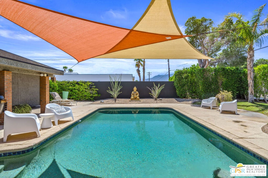 Welcome to Desert Park Estates in beautiful Palm Springs. Please view the 3D Matterport tour and Floorplan! This mid-century modified charmer is a veritable blank canvas, priced to allow your own creative vision and customizations to turn it into the home of your dreams! This property is located on a quiet street and offers gorgeous mountain views. The home forms a classic "L" shape around the serene backyard, pool and deck. A generously sized crystal blue pebble-tech swimming pool with built-in bar stools reflects a covered patio surrounded by desert landscaping, palm trees, and a large shimmering gold Buddha (Hello, The White Lotus!) to make this scene-stealing backyard retreat your private sanctuary for sun, relaxation, and entertaining! The home features 3 bedrooms, plus a study which could be a 4th bedroom and 4 bathrooms. 3 large sets of custom windows on the front of the house and 5 sets of sliders on the back allow tons of natural light, while offering beautiful views of the pool, deck, hummingbirds, and statuesque San Jacinto Mountains. (BTW - with all of the window views and the convenient grassy area in the backyard, your pets will LOVE this house!)There are master bedroom suites at opposing ends of the property, ideal for in-laws or guest quarters. The generous 2-car garage includes laundry and a bathroom. Leased rooftop solar panels. You need to see it to appreciate it! Priced to sell. Don't wait. No HOA - No Land Lease!