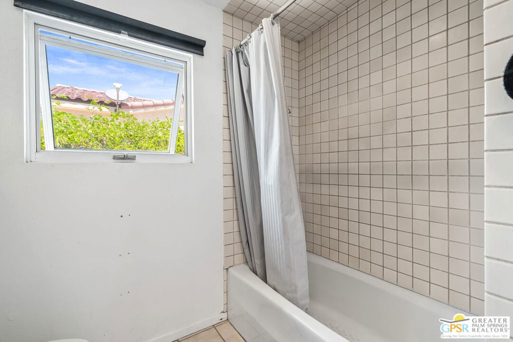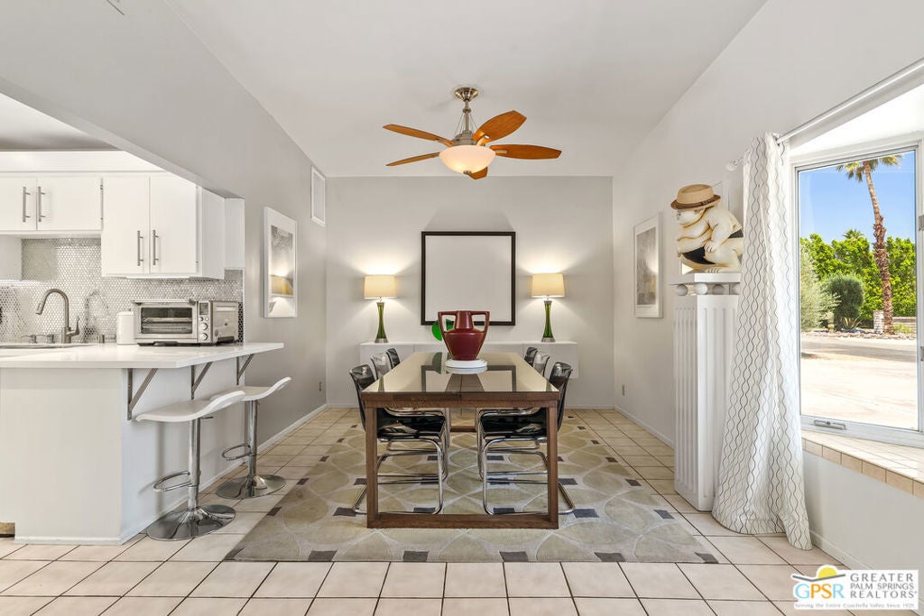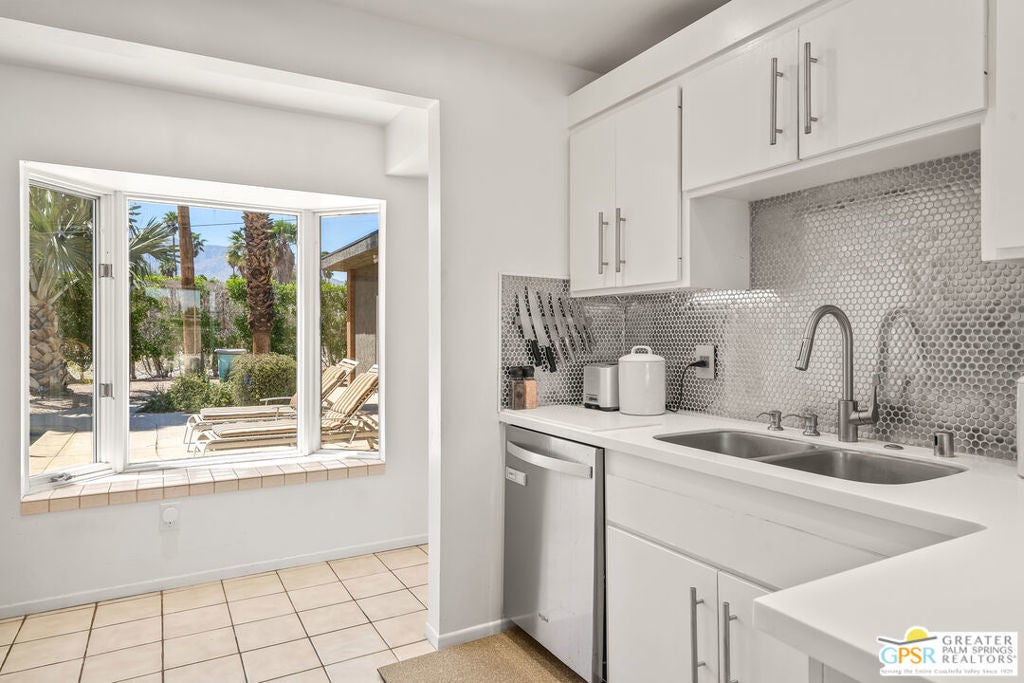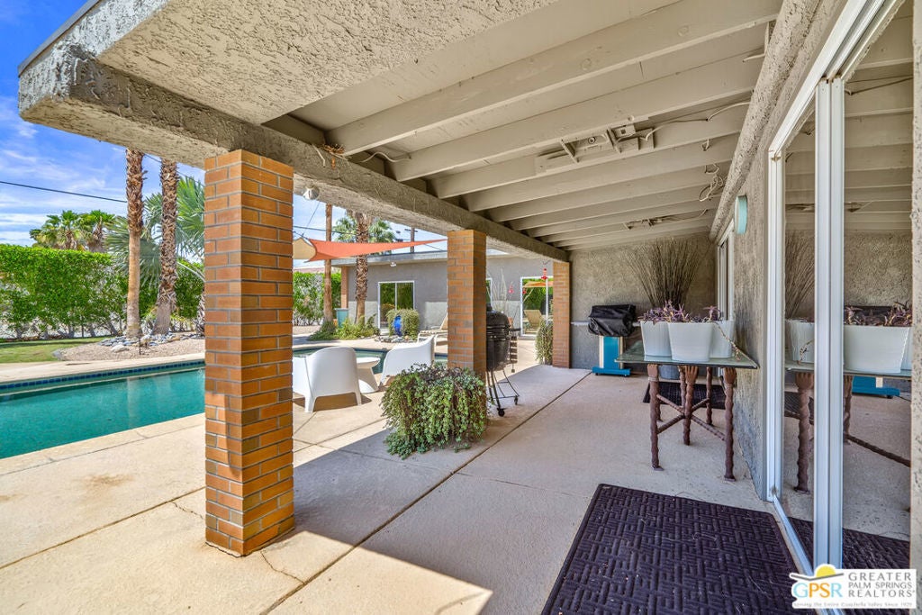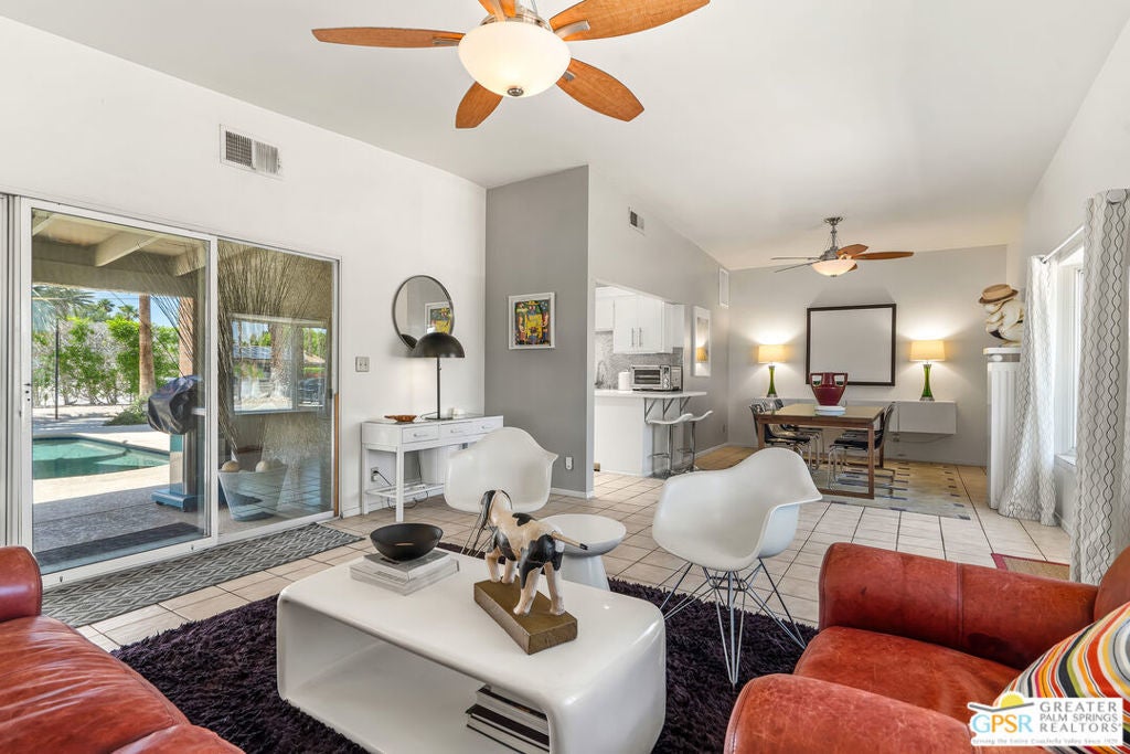 Welcome to Desert Park Estates in beautiful Palm Springs. Please view the 3D Matterport tour and Floorplan! This mid-century modified charmer is a veritable blank canvas, priced to allow your own creative vision and customizations to turn it into the home of your dreams! This property is located on a quiet street and offers gorgeous mountain views. The home forms a classic "L" shape around the serene backyard, pool and deck. A generously sized crystal blue pebble-tech swimming pool with built-in bar stools reflects a covered patio surrounded by desert landscaping, palm trees, and a large shimmering gold Buddha (Hello, The White Lotus!) to make this scene-stealing backyard retreat your private sanctuary for sun, relaxation, and entertaining! The home features 3 bedrooms, plus a study which could be a 4th bedroom and 4 bathrooms. 3 large sets of custom windows on the front of the house and 5 sets of sliders on the back allow tons of natural light, while offering beautiful views of the pool, deck, hummingbirds, and statuesque San Jacinto Mountains. (BTW - with all of the window views and the convenient grassy area in the backyard, your pets will LOVE this house!)There are master bedroom suites at opposing ends of the property, ideal for in-laws or guest quarters. The generous 2-car garage includes laundry and a bathroom. Leased rooftop solar panels. You need to see it to appreciate it! Priced to sell. Don't wait. No HOA - No Land Lease!