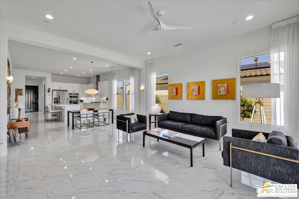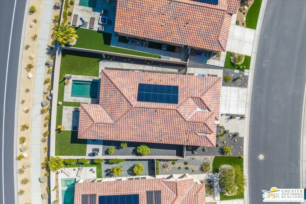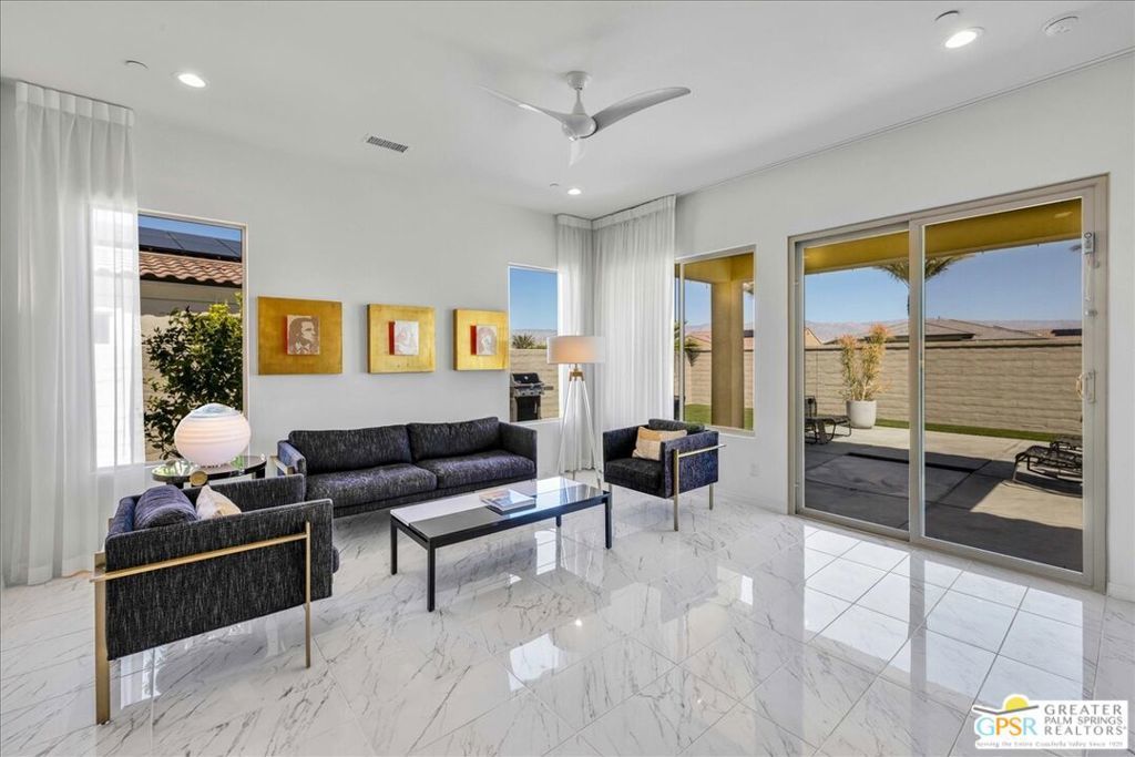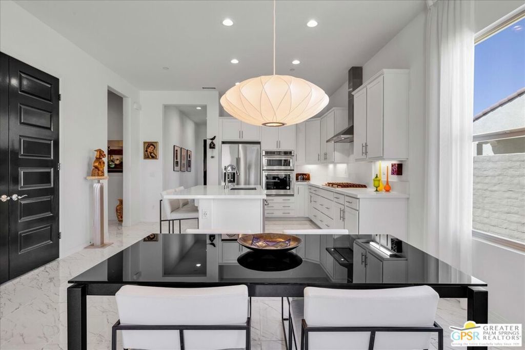 Resort-Style Elegance in Del Webb Rancho Mirage Experience the pinnacle of 55+ active-adult living in this exquisite Phase 4, Plan 2 Solitude residence with a spool, perfectly situated near the clubhouse in one of the community's most serene locations. This sophisticated retreat blends modern comfort with resort-inspired design, offering 2 bedrooms, 2 baths, and a versatile den - ideal for a home office, creative studio, or quiet reading lounge. The open-concept layout creates a seamless flow between the living, dining, and kitchen areas, framed by expansive windows that showcase breathtaking views of the Shadow Mountains. The chef's kitchen impresses with a sleek quartz island and countertops, upgraded 42" upper cabinetry, high-end gas cooktop, stainless steel appliances, and a spacious pantry - perfect for entertaining in effortless style. The primary suite is a private sanctuary featuring direct access to the spool area, a spa-like ensuite with dual vanities, a glass-enclosed shower, and an oversized walk-in closet. The secondary bedroom, thoughtfully positioned for privacy, offers a welcoming space for guests. Throughout the home, designer details shine - from polished porcelain tile flooring to bold black lacquer accents and multiple builder upgrades that elevate every room. Step outside to your own private desert oasis. The beautifully designed backyard features a lush faux lawn, striking hardscape with a built-in gas fire pit, and a glimmering spool with spa jets and tranquil water features - an ideal setting to unwind beneath the desert sky. A charming citrus garden adds a refreshing touch of color and fragrance to this exceptional outdoor retreat. Additional highlights include leased solar ($114.51/mo), a two-car attached garage, and a well-appointed laundry room with extra storage. Nestled within the prestigious guard-gated community of Del Webb Rancho Mirage, residents enjoy access to world-class amenities including a clubhouse, resort-style pool and spa, tennis and pickleball courts, state-of-the-art fitness center, putting green, billiards, and miles of scenic walking paths. Truly a must see.