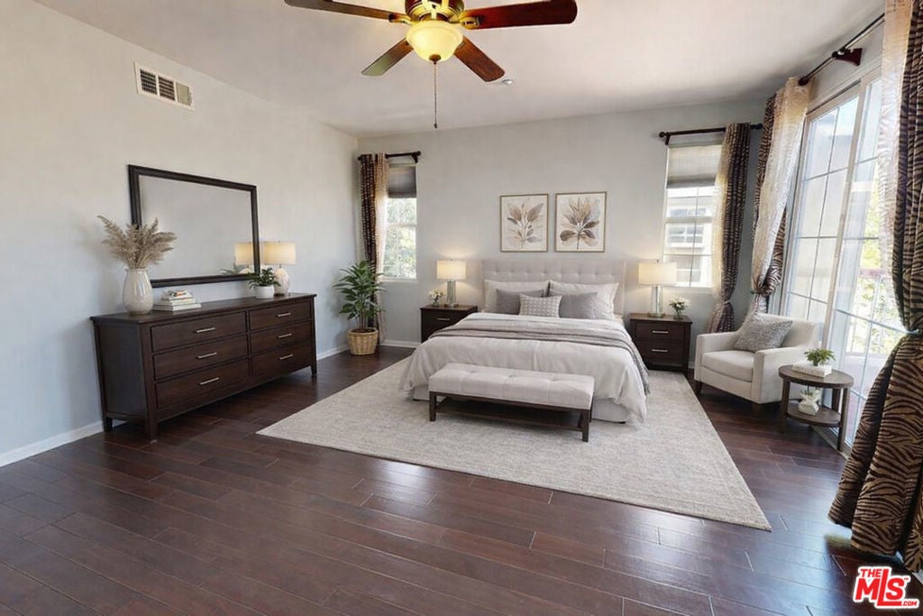 AVAILABLE IMMEDIATELY! A Gated Hillside Oasis in Siena. Discover unparalleled luxury and comfort in this stunning, custom villa-style home, perfectly situated within the exclusive, gated community of Siena. Spanning over 3,500 sq. ft., this residence boasts 4 bedrooms and 3.5 baths, offering generous space for upscale living. The home welcomes you with a fresh, move-in ready appeal, featuring brand-new carpeting and a full, fresh paint job. Inside, an open floor plan is highlighted by elegant hardwood floors and dramatic vaulted 14-ft. ceilings. The expansive living room, brightened by oversized windows, flows seamlessly into the dining area and showcases cozy wood-plank flooring and a built-in fireplace. The chef's kitchen is a culinary dream, equipped with stainless steel appliances, granite countertops, a large pantry, and durable stone flooring. Downstairs, the family room offers direct access to a private, entertainment-ready patio. This outdoor retreat features a built-in barbecue, a cozy fire pit, and sweeping hillside views, perfect for hosting year-round. A dedicated laundry room with a new washer and dryer adds essential convenience. Retreat to the magnificent primary suite, which includes a spacious sitting area, a spa-like bath with a luxurious rain shower, and access to an oversized roof-top patio/balcony. Enjoy spectacular panoramic views of the City and Mountains from your private perch. Additional premium features include a dedicated office with built-ins for focused work and a two-car garage recently updated with new doors and flooring. Committed to sustainability, the home also features solar panels for outstanding energy efficiency and lower utility costs. Enjoy a highly coveted location close to prestigious schools like Sierra Canyon, Chaminade, and Oaks Christian, renowned for their academic and athletic excellence. You'll be minutes from the vibrant Warner Center, high-end shopping, diverse restaurants, theaters, and parks, all while being just a short drive from the beautiful beaches. This is more than a home; it's a lifestyle. Don't miss this must-see property that effortlessly blends elegance, functionality, and comfort!