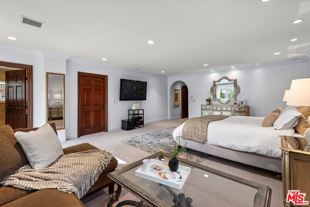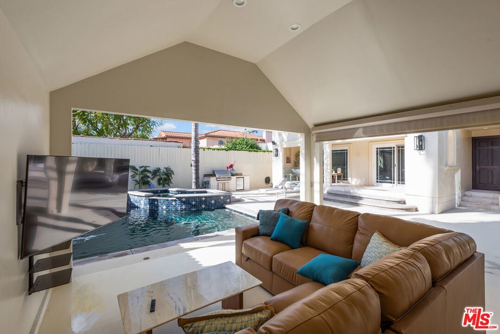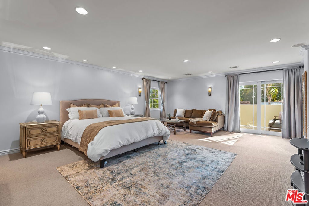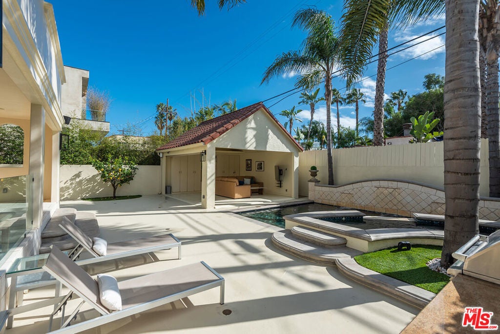 Lovely Mediterranean available furnished located in the Hancock Park Elementary School district. This well appointed 4 bed + 5 bath home offers living room with fireplace, formal dining and chef's gourmet kitchen equipped with top-of-the-line appliances and oversized center island with prep sink. Inviting primary retreat featuring sitting area, custom walk-in closet, private balcony and luxurious bath with separate shower and tub with jets. 3 additional en suite bedrooms upstairs. Spacious family room seamlessly joins both formal dining and breakfast room which leads to covered patio - perfect for entertaining! Great outdoor space highlighted by sparkling pool with fountains, Jacuzzi spa, large cabana with TV and outdoor kitchen with BBQ and fridge. AV features include surround sound systems in primary and family rooms, ceiling speakers throughout, and 6 plasma TVs. Long private driveway and attached carport accommodating multiple cars. Internet, pool and gardener included with rent.