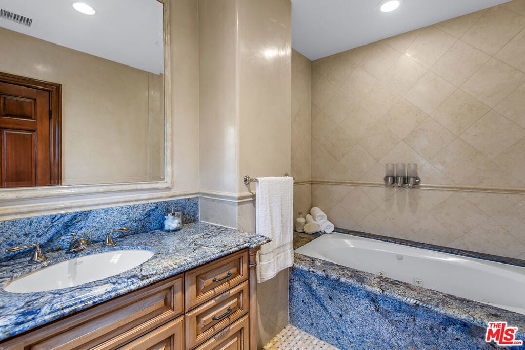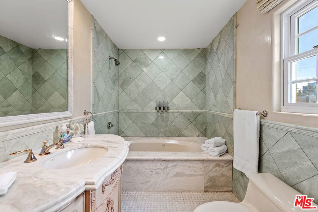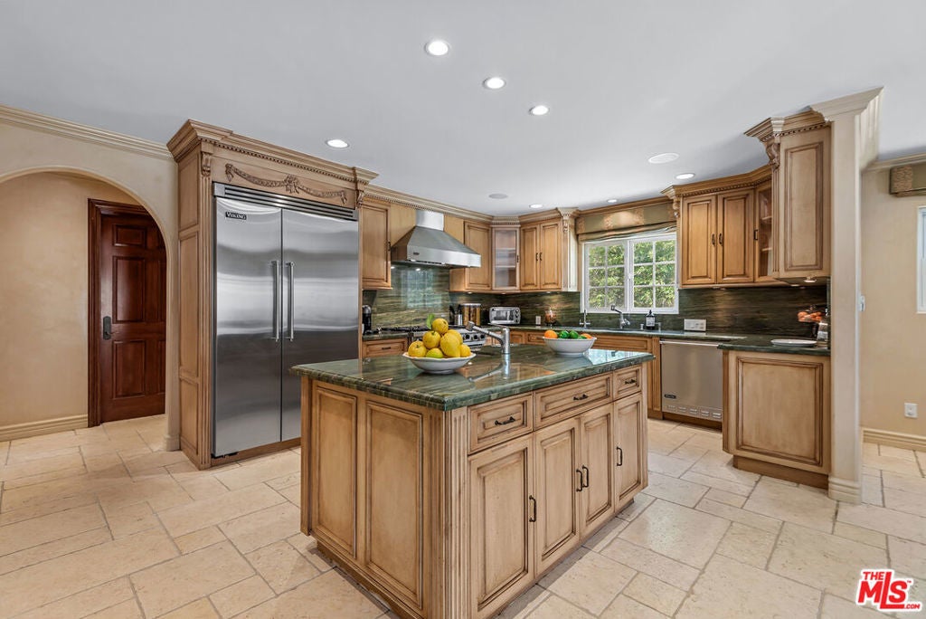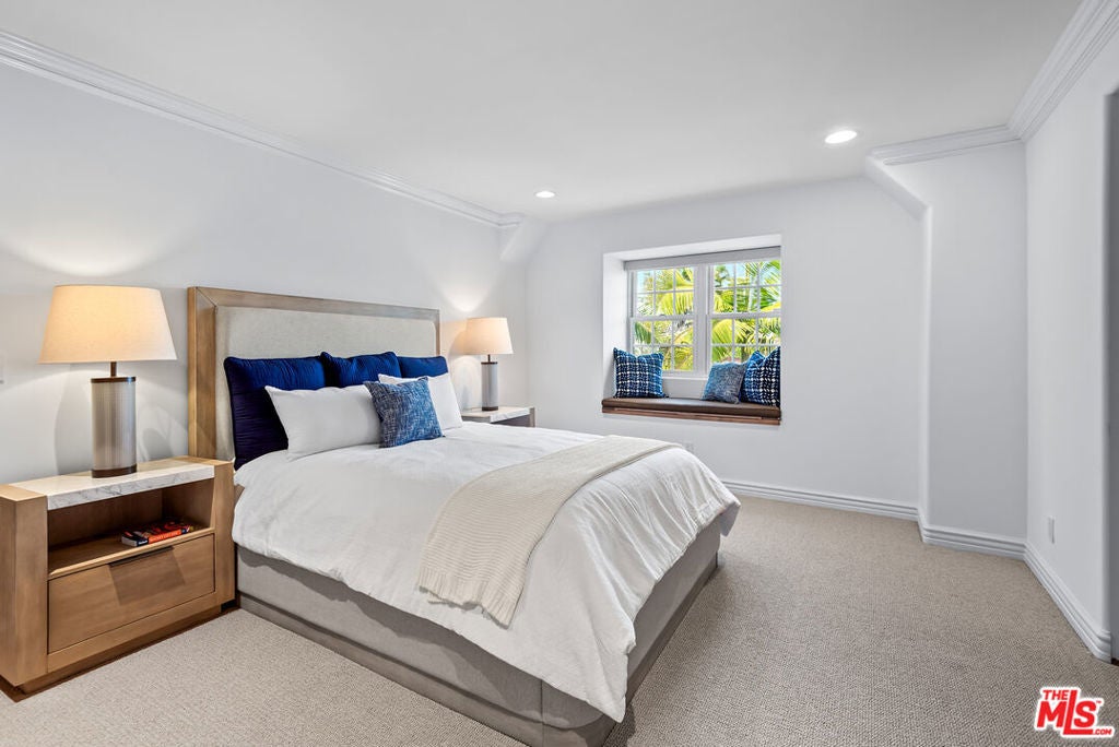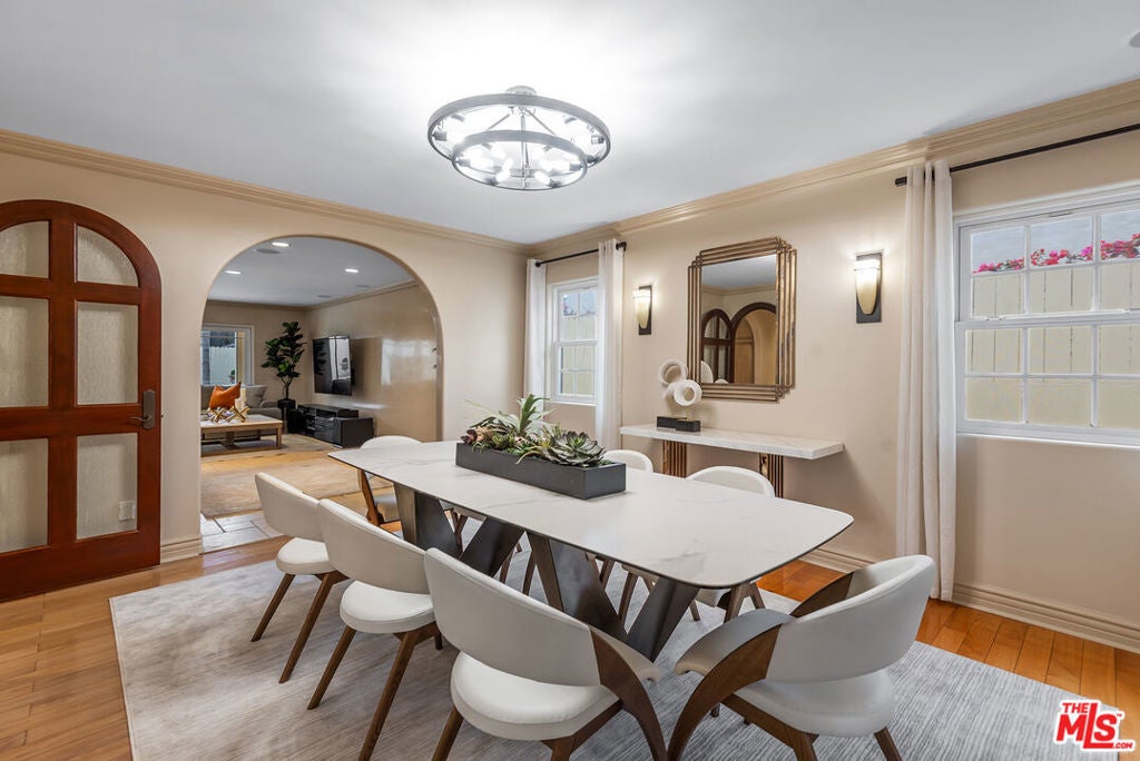 Lovely Mediterranean available furnished located in the Hancock Park Elementary School district. This well appointed 4 bed + 5 bath home offers living room with fireplace, formal dining and chef's gourmet kitchen equipped with top-of-the-line appliances and oversized center island with prep sink. Inviting primary retreat featuring sitting area, custom walk-in closet, private balcony and luxurious bath with separate shower and tub with jets. 3 additional en suite bedrooms upstairs. Spacious family room seamlessly joins both formal dining and breakfast room which leads to covered patio - perfect for entertaining! Great outdoor space highlighted by sparkling pool with fountains, Jacuzzi spa, large cabana with TV and outdoor kitchen with BBQ and fridge. AV features include surround sound systems in primary and family rooms, ceiling speakers throughout, and 6 plasma TVs. Long private driveway and attached carport accommodating multiple cars. Internet, pool and gardener included with rent.
