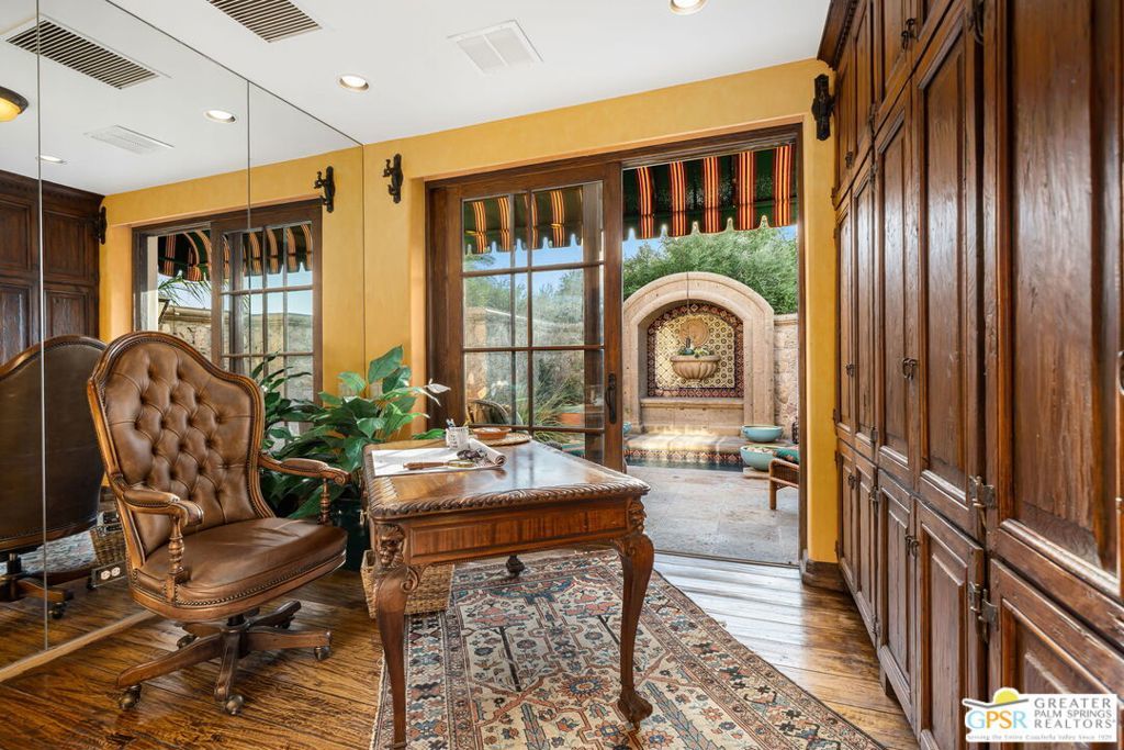 Welcome to La Belle Dame, a breathtaking one-acre Mediterranean-inspired estate by renowned architect Juan Carlos Ochoa, located in Rancho Mirage's most prestigious gated enclave, Clancy Lane Estates. This 6,424 sq. ft. single-level villa blends old-world artistry with modern resort living, offering ultimate privacy and elegance.Inside, you'll find hand-hewn oak floors, vaulted wood-beamed ceilings, Saltillo tile, custom Italian cabinetry, and Albertini doors that open seamlessly to the outdoors. The grand living and dining rooms, chef's kitchen with Wolf appliances, butler's pantry, Sub-Zero refrigeration, and 200-bottle wine cabinet create an entertainer's dream. The primary suite features dual walk-in closets, a spa-inspired bath with hand-painted tile, private den, and executive office. Three additional ensuite bedrooms and a poolside cabana complete this exceptional home. Outdoors, enjoy the south-facing resort yard with a tiled swimming pool framed by gas fire bowls, a spa in a stone grotto, a four-sided firepit, and a pavilion with a fully equipped outdoor kitchen. Lush gardens, multiple fountains, and shaded patios offer serene spaces for relaxation or entertaining. Lease details: $3,000 cleaning fee (includes one professional cleaning per month), Twice-weekly maintenance service included, Pool and landscaping services included. Cable, internet, and utilities included. One-month minimum rental. Clancy Lane Estates offers 24-hour gated security and proximity to fine dining, shopping, golf, and cultural attractions. La Belle Dame is a rare opportunity to experience refined desert living at its most exquisite.
