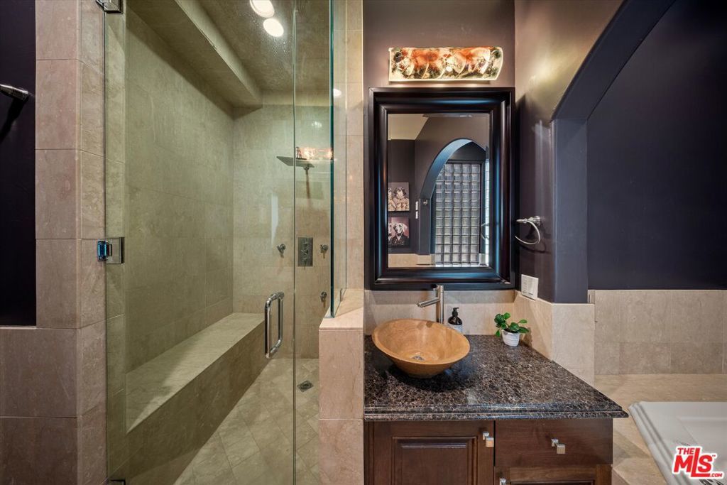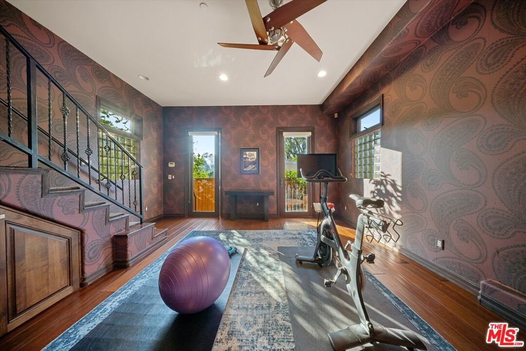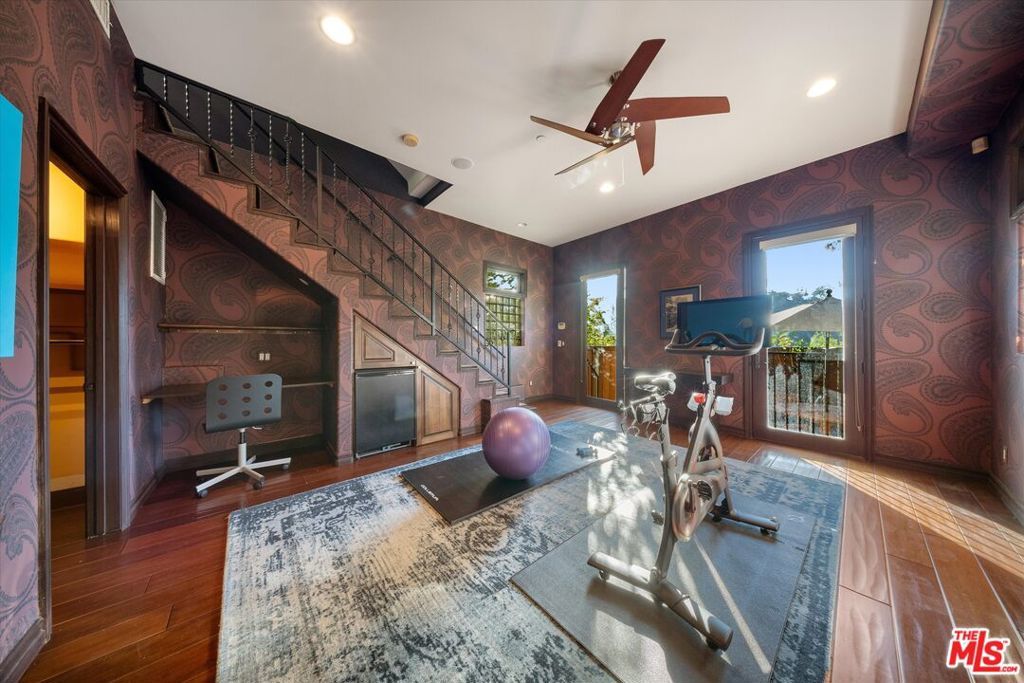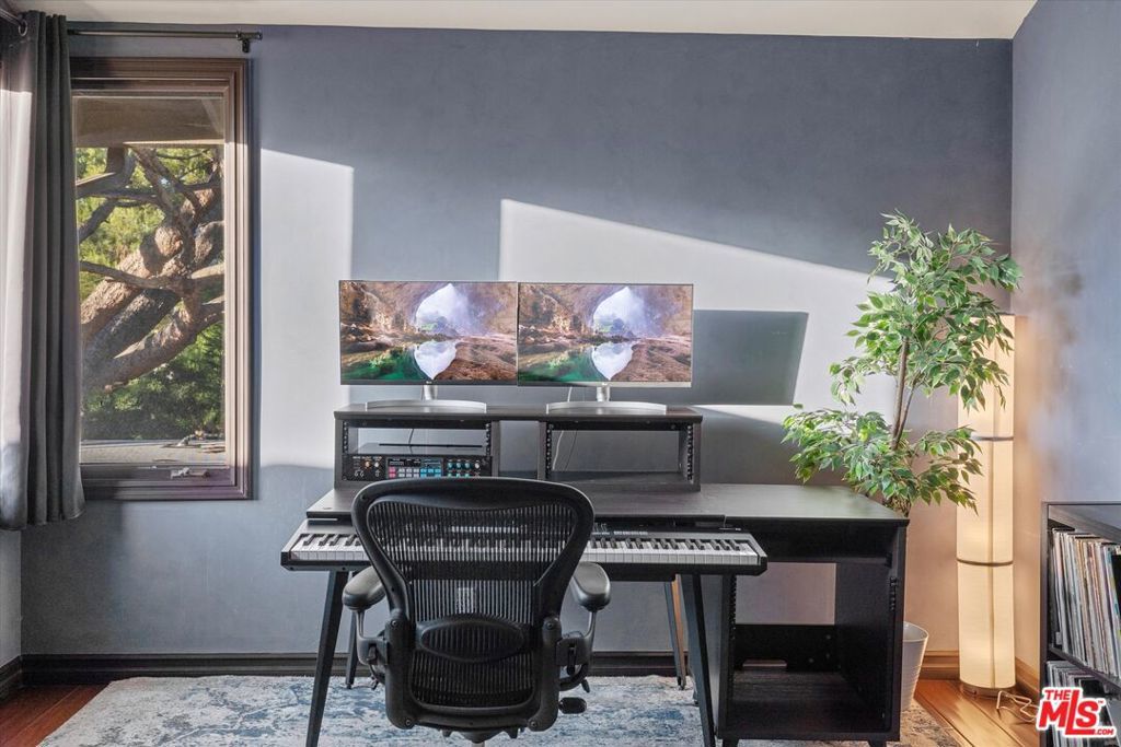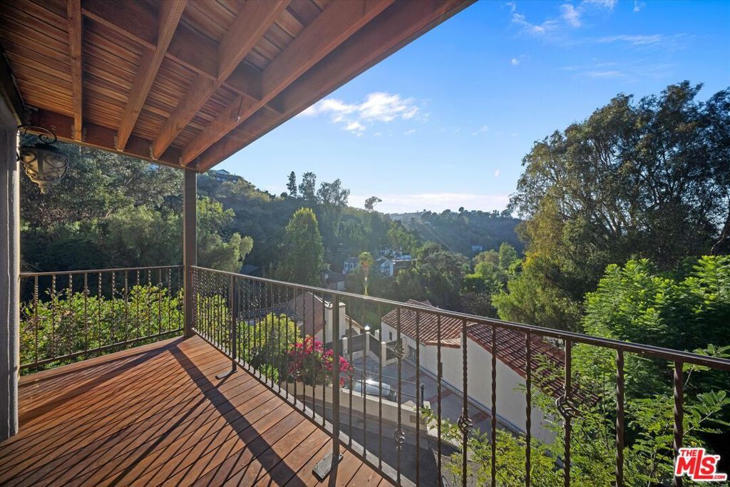 MOTIVATED SELLERS. BRING ALL OFFERS. Tucked into the Cahuenga Pass near the Hollywood Bowl, The Ford, and Universal Studios, this striking Spanish Colonial Revival offers timeless character, modern comfort, and incredible versatility. Soaring ceilings and a dramatic chandelier welcome you into a bright open living and dining space framed by treetop and canyon views. The chef's kitchen features professional-grade stainless steel appliances and connects seamlessly to the main entertaining level. Upstairs are two bedrooms and two bathrooms, including one with its own balcony and another that serves beautifully as a creative workspace, studio, or home office. Downstairs, a second living area features its own kitchen, a balcony overlooking the canyon, and a spacious primary suite with walk-in closet, dual vanities, a large walk-in shower with double shower heads, and a jetted soaking tub. The lower levels also include a dedicated media room with theater seating and a flexible bedroom currently used as a gym that opens to an outdoor patio with a built-in barbecue. Additional highlights include dual laundry areas, a Nest smart thermostat, Ring security system, a two-car garage with a 40v EV charger, and an extra parking space at the bottom of the property. Located just minutes from Studio City, Toluca Lake, and Hollywood with easy access to the 101, this multi-level home offers outstanding convenience and flexibility for creative living, extended stays, or guests.