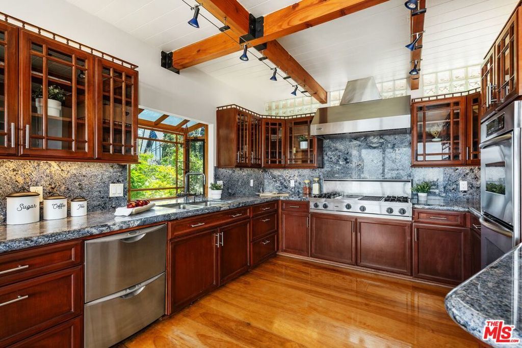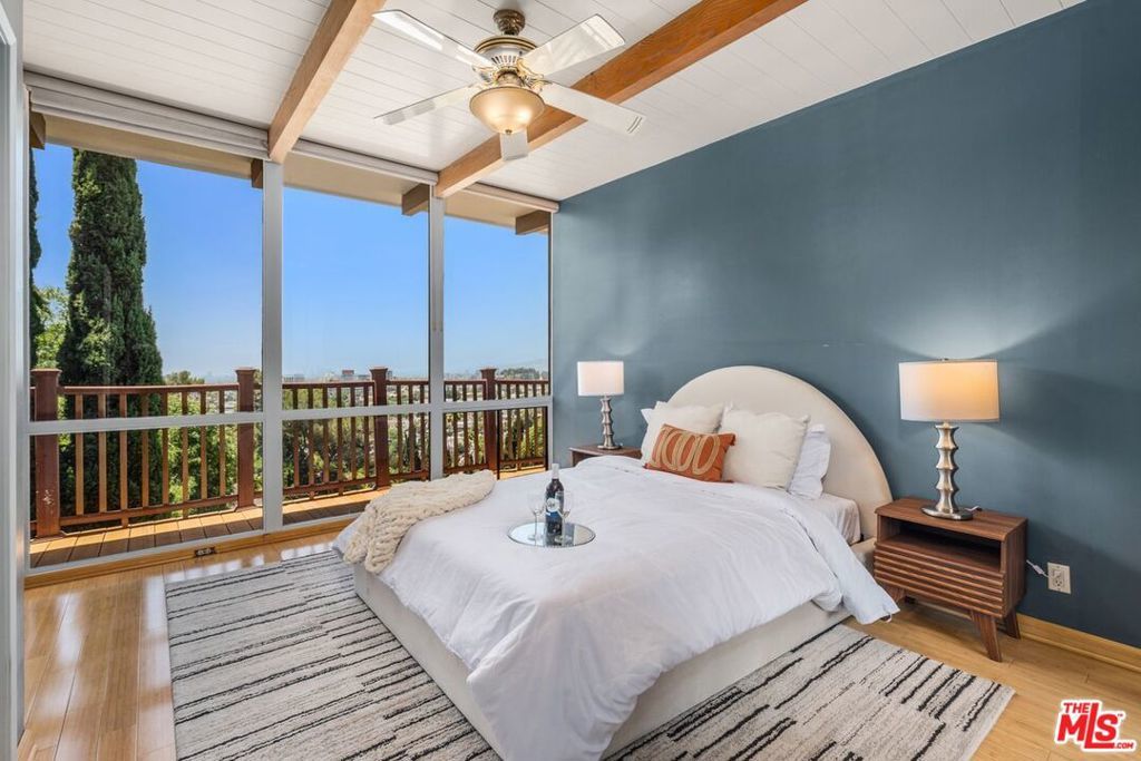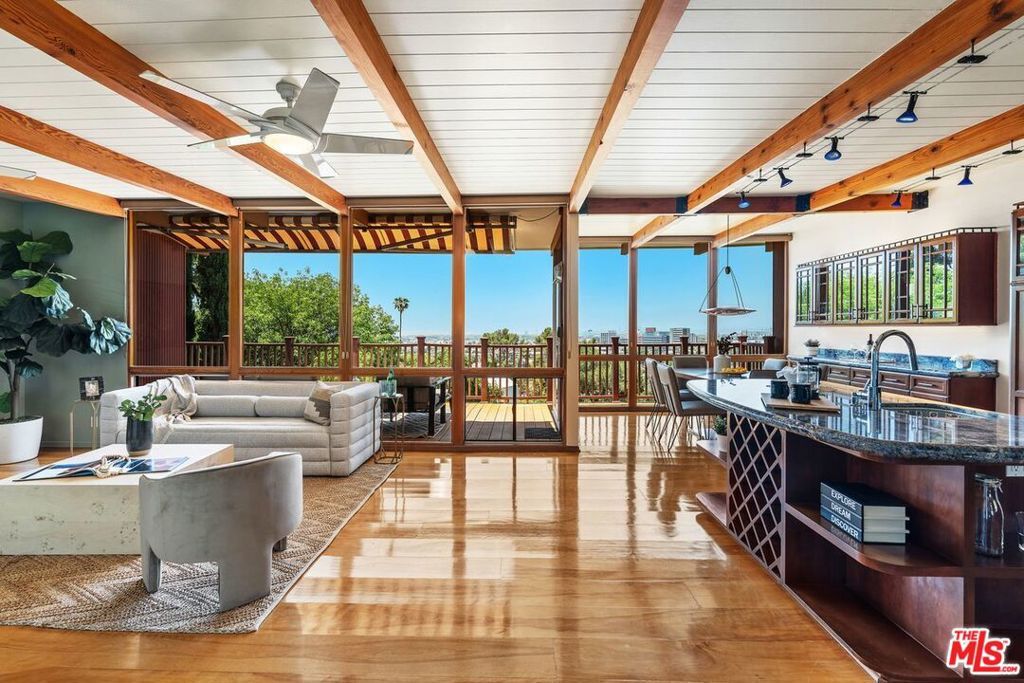 Nestled in the coveted Franklin Elementary School District, offering elevated hillside living above Los Feliz Village and minutes from Griffith Park and the Observatory. Spanning 2,387 sq ft over three levels, the home delivers timeless mid-century design blended with modern luxury: exposed wooden beam ceilings, rich hardwood floors, and expansive glass that showcases sweeping panoramic views from nearly every room. On the main level, the open-plan living and dining areas flow effortlessly out to wide-view decks. At the same time, the chef's kitchen features top-tier appliances, a Sub-Zero refrigerator, a Viking Stove, double ovens and microwaves, a wine cooler, and Brazilian granite countertops, ideal for entertaining. Two serene bedrooms and two full baths provide comfortable everyday living. Below, a fully independent one-bedroom suite with living room, full bath, separate entrance, and laundry offers guests, extended family, or income rental potential. Additionally, a flexible bonus room at the lowest level invites use as a home office, art studio, gym, or media room. Outdoor living shines with terraced lawns, mature fruit trees, a koi pond, multiple view decks, and newly renovated exterior stairways connecting every level, making this one of the rare hillside retreats where architecture, views, and lifestyle converge. Ideal for buyers seeking Los Feliz's vibrant neighborhood life, top schools, and ready-to-go design-forward home, don't miss this rare opportunity to own a hillside classic with panoramic views, income-capable space, and mid-century pedigree.