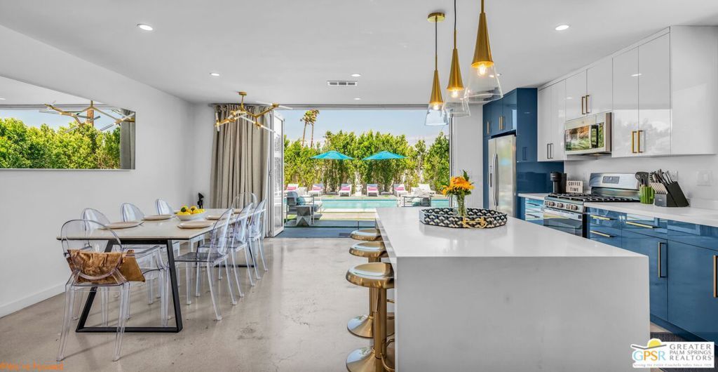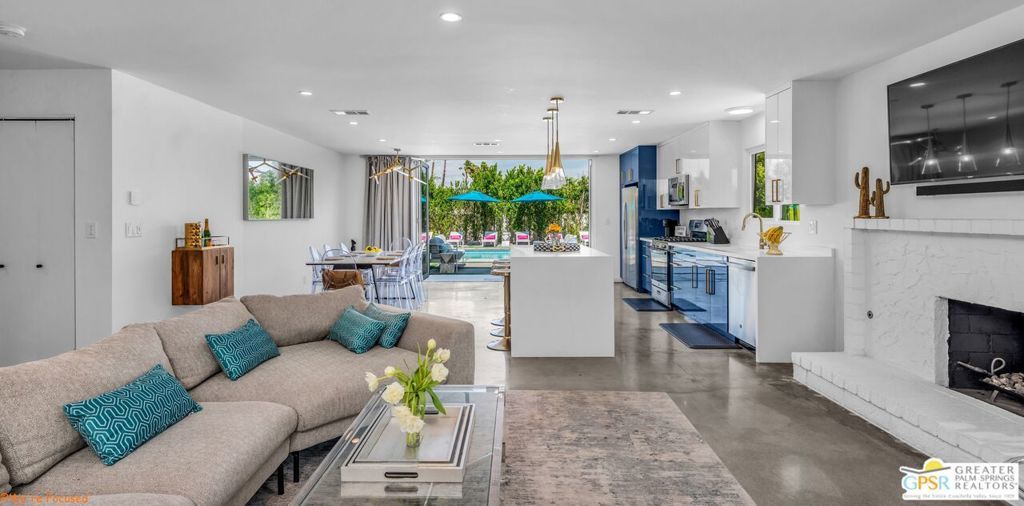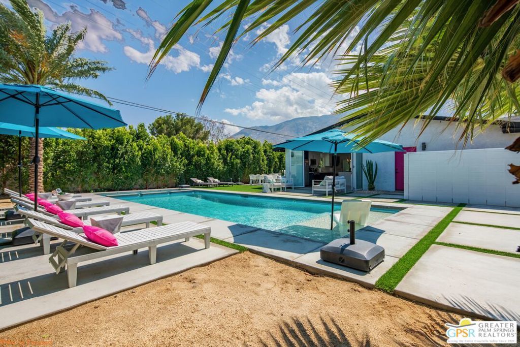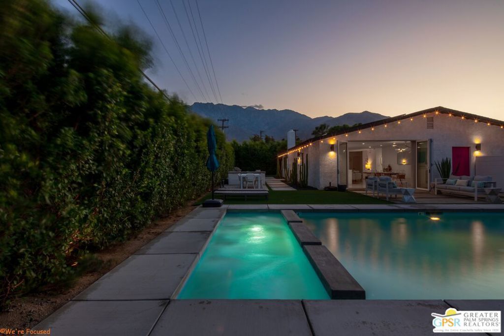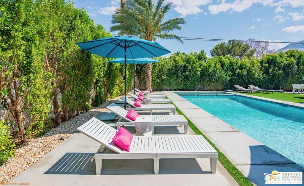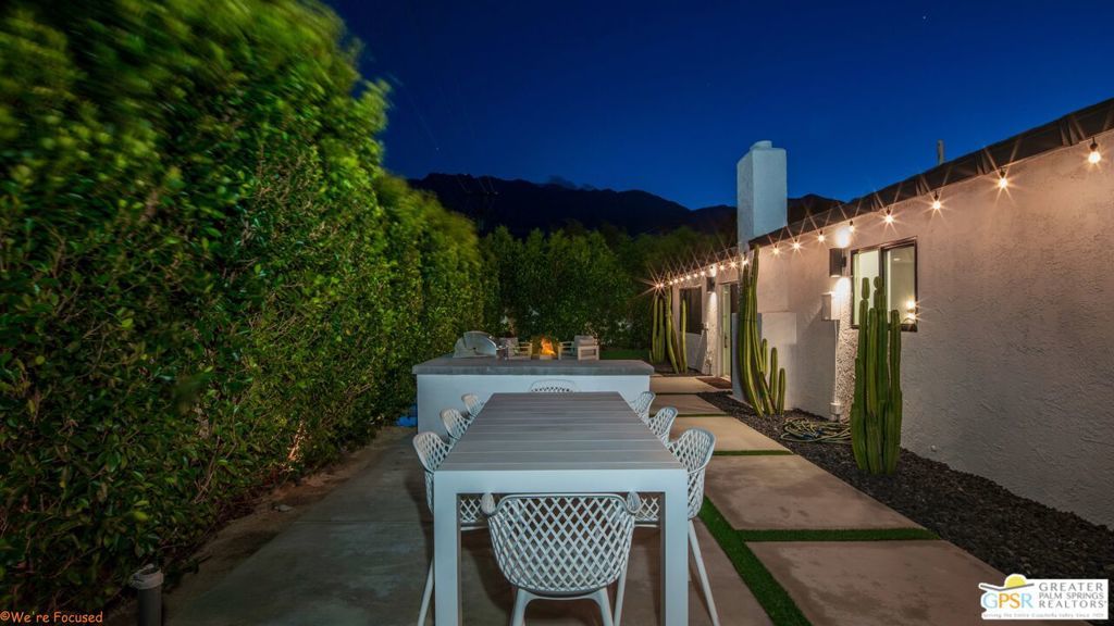 Experience the pinnacle of desert living in this 4-bedroom, 3.5-bath modern oasisa fully reimagined retreat where sophistication meets serenity. Set on a rare double-wide lot, this home is surrounded by over 100 mature ficus trees, creating a lush private sanctuary with unobstructed mountain views. Step outside to a resort-style escape featuring a saltwater pool and spa with baja shelf, a 10-person hot tub, and a firepit beside a turfed play area. Entertain with ease thanks to a built-in BBQ, outdoor dining area, and dedicated pool bath, all enhanced by $150K+ in professional hardscaping and landscaping, sleek block walls, and ample parking pads. Inside, natural light pours through expansive glass doors connecting the living area to the outdoors. The chef's kitchen boasts quartz counters, stainless steel appliances, and a Carrara marble dining table centerpiece. Modern touches abound: polished concrete floors, floating vanities, and two primary suites with en-suite baths.Offered fully furnished and turnkey, this property has a proven short-term rental history with rave reviews, making it ideal as a luxury investment or personal retreat. Additional upgrades include a new HVAC system, leased solar, and a new Pentair saline system for effortless maintenance.Live or invest in one of Palm Springs' most desirable neighborhoods where modern elegance, privacy, and income potential unite in one extraordinary property.