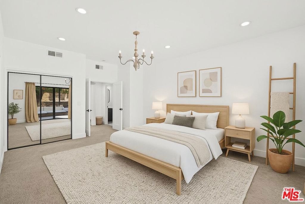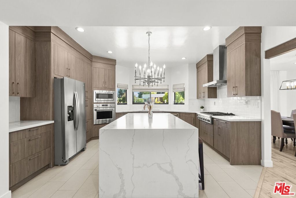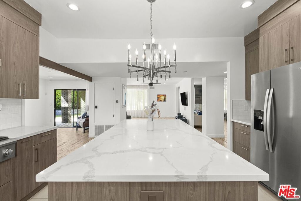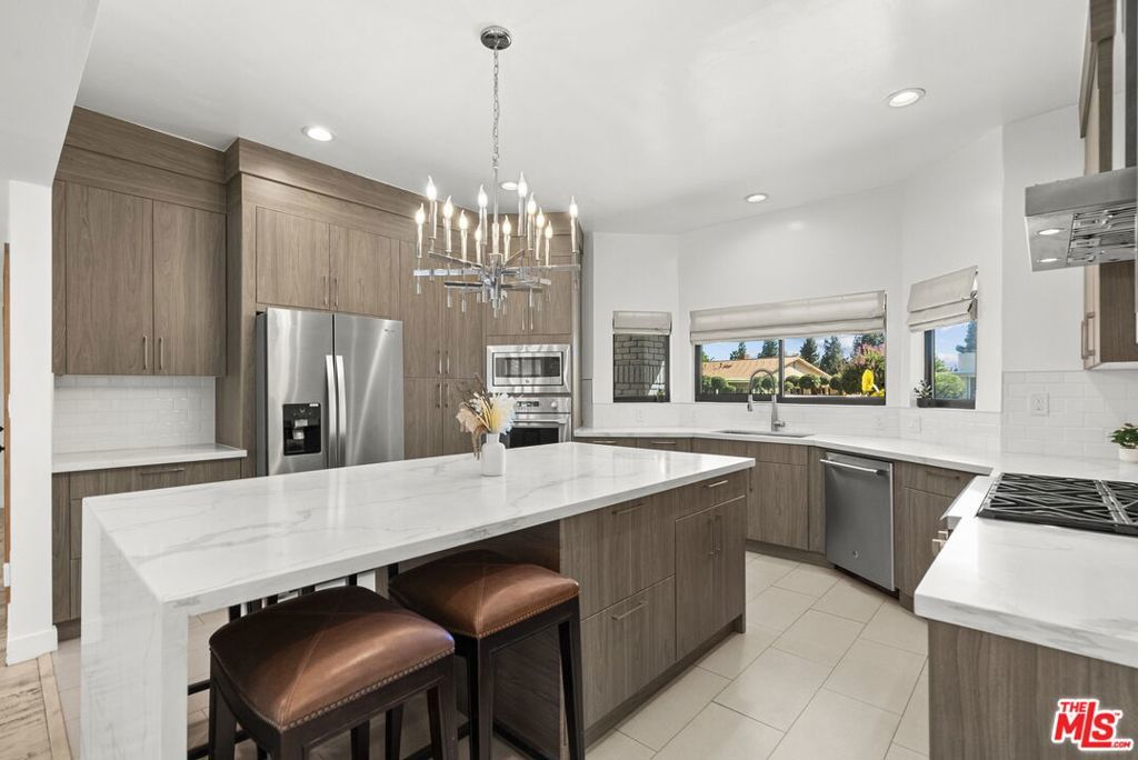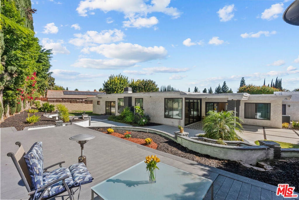 Step inside this elegant single-story home in Northridge's coveted Devonshire Highlands, where modern design meets timeless comfort. Spanning nearly 2,800 sq ft on an almost 13,000 sq ft lot, this 4-bedroom, 4-bath retreat welcomes you with an airy open layout, high ceilings, and abundant natural light from modern sliding doors that frame the lush greenery outside. The formal entry leads to a sophisticated living room with a striking marble-and-wood fireplace and calming neutral tones. The chef's kitchen is the heart of the home, showcasing an enormous center island, quartz countertops, custom cabinetry, and stainless steel appliances, flowing seamlessly into the family room with accordion glass doors that open to the backyard for effortless indoor-outdoor living.The dining area offers elegance with a modern chandelier and large sliding doors, ideal for family gatherings or entertaining guests. The primary suite is a private retreat featuring a spa-inspired bath, soaking tub, and a spacious walk-in closet. Nearly every bedroom includes its own walk-in closet, ensuring comfort and functionality throughout. Additional highlights include recessed smart lighting, newer windows, modern bathrooms, a 3-car garage, a huge backyard with mature trees that enhance both privacy and beauty. A covered patio outdoor with spacious deck, and newly refreshed landscaping make this home perfect for relaxation or entertaining. With designer finishes, modern upgrades, and a cul-de-sac location near top-rated schools, shops, and dining, this home captures the essence of modern California living.