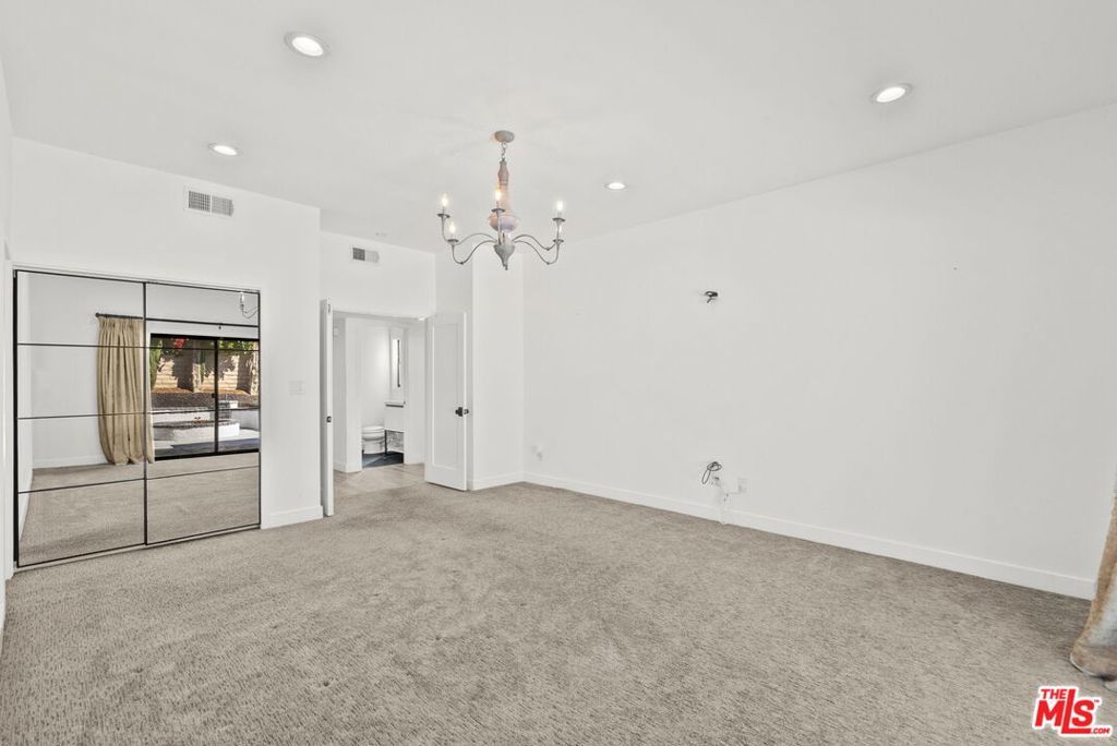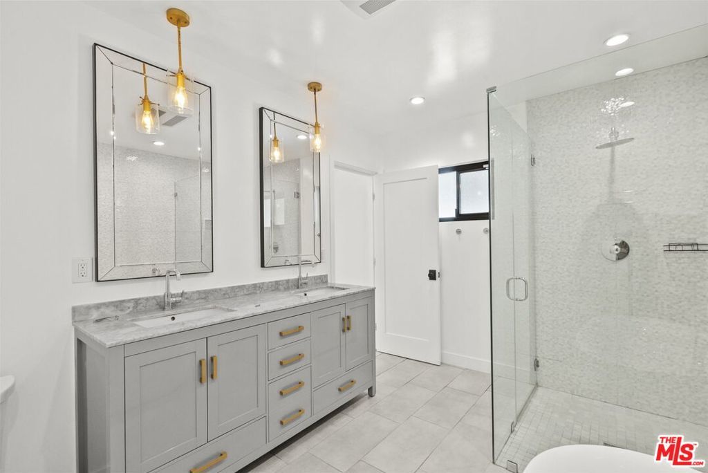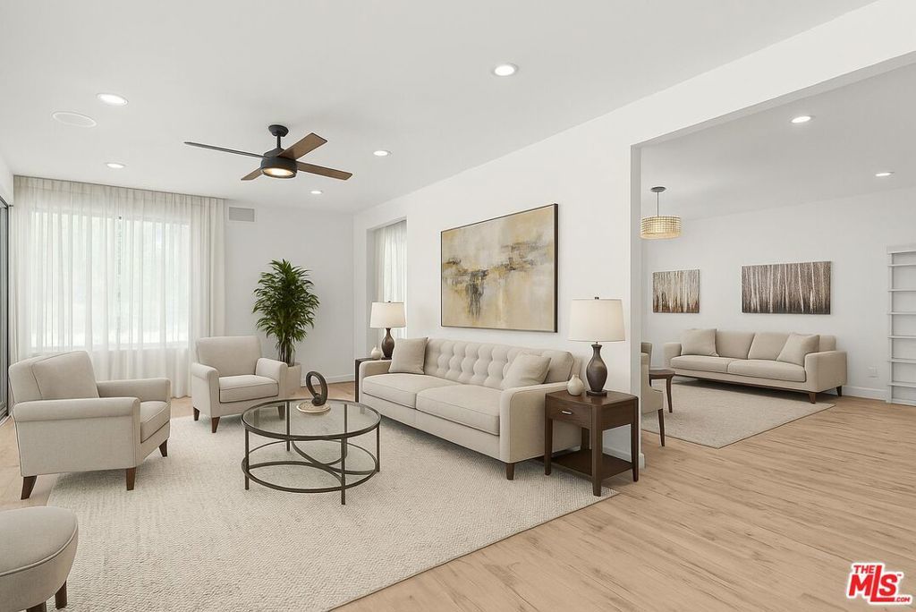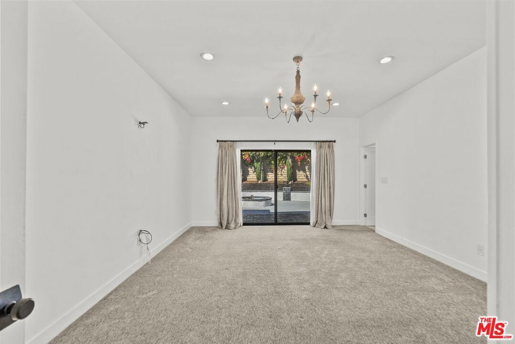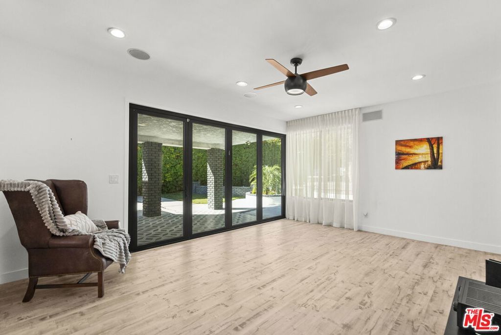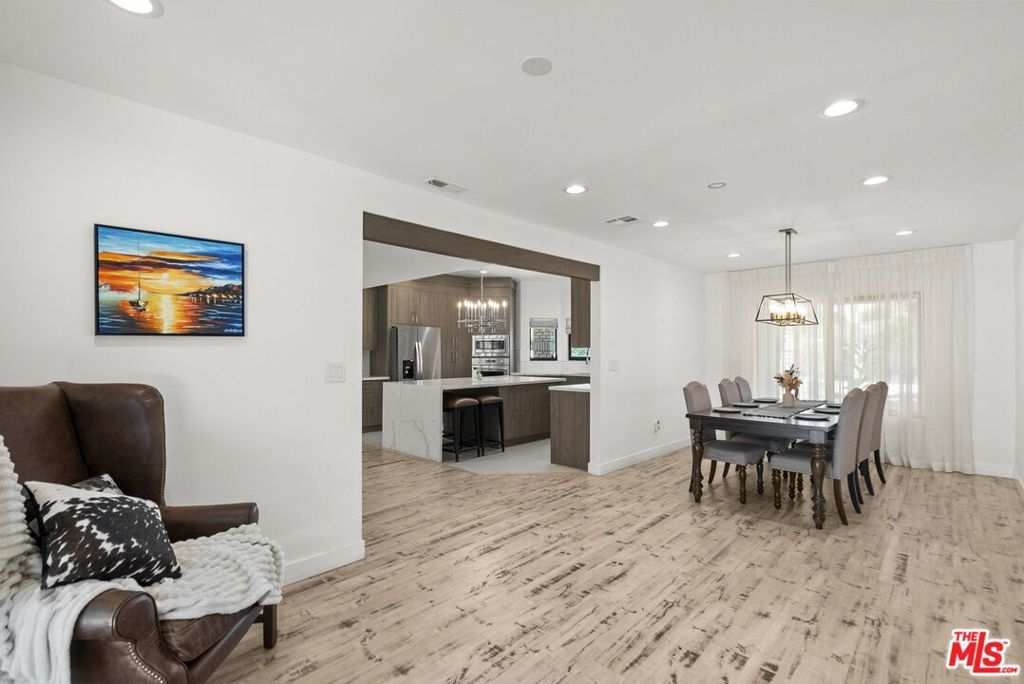Step inside this elegant single-story home in Northridge's coveted Devonshire Highlands, where modern design meets timeless comfort. Spanning nearly 2,800 sq ft on an almost 13,000 sq ft lot, this 4-bedroom, 4-bath retreat welcomes you with an airy open layout, high ceilings, and abundant natural light from modern sliding doors that frame the lush greenery outside. The formal entry leads to a sophisticated living room with a striking marble-and-wood fireplace and calming neutral tones. The chef's kitchen is the heart of the home, showcasing an enormous center island, quartz countertops, custom cabinetry, and stainless steel appliances, flowing seamlessly into the family room with accordion glass doors that open to the backyard for effortless indoor-outdoor living.The dining area offers elegance with a modern chandelier and large sliding doors, ideal for family gatherings or entertaining guests. The primary suite is a private retreat featuring a spa-inspired bath, soaking tub, and a spacious walk-in closet. Nearly every bedroom includes its own walk-in closet, ensuring comfort and functionality throughout. Additional highlights include recessed smart lighting, newer windows, modern bathrooms, a 3-car garage, a huge backyard with mature trees that enhance both privacy and beauty. A covered patio outdoor with spacious deck, and newly refreshed landscaping make this home perfect for relaxation or entertaining. With designer finishes, modern upgrades, and a cul-de-sac location near top-rated schools, shops, and dining, this home captures the essence of modern California living.