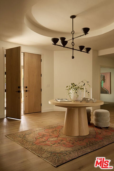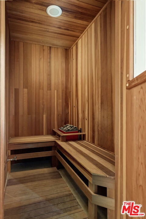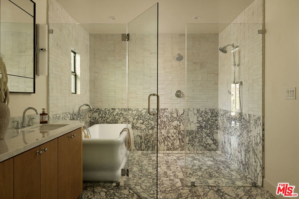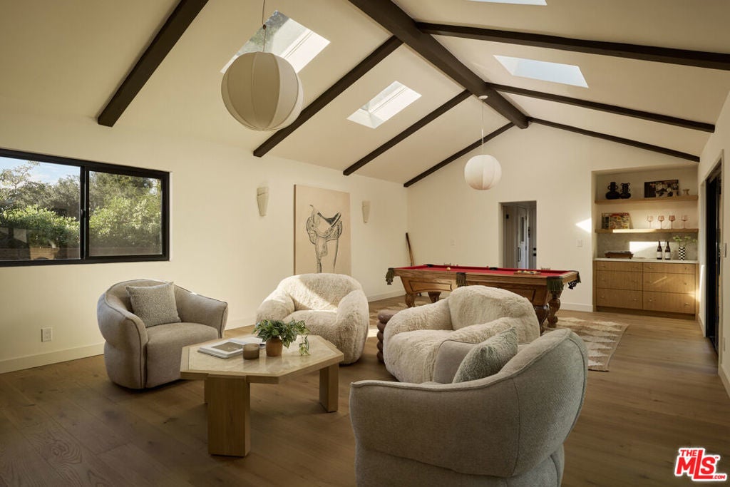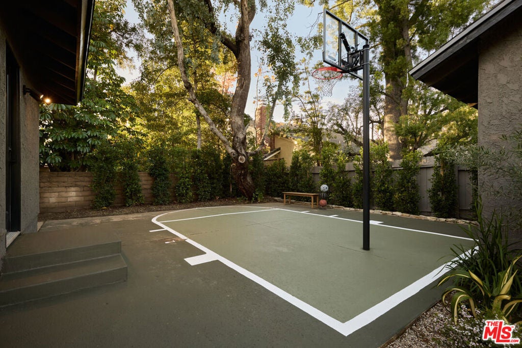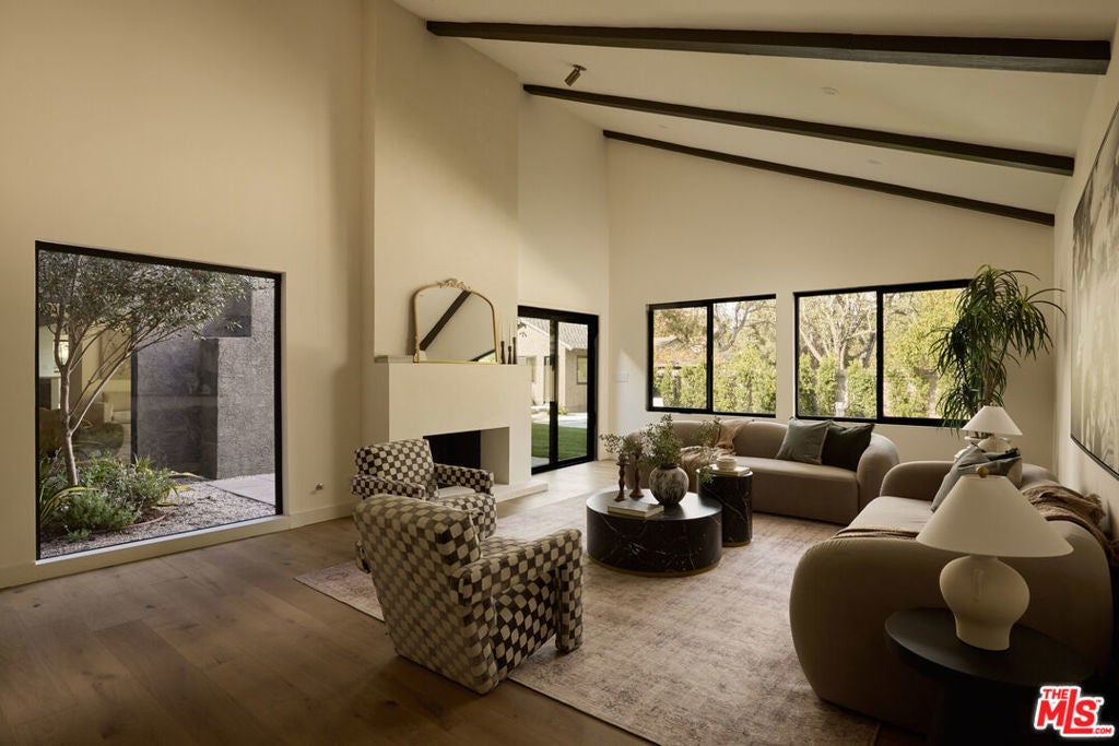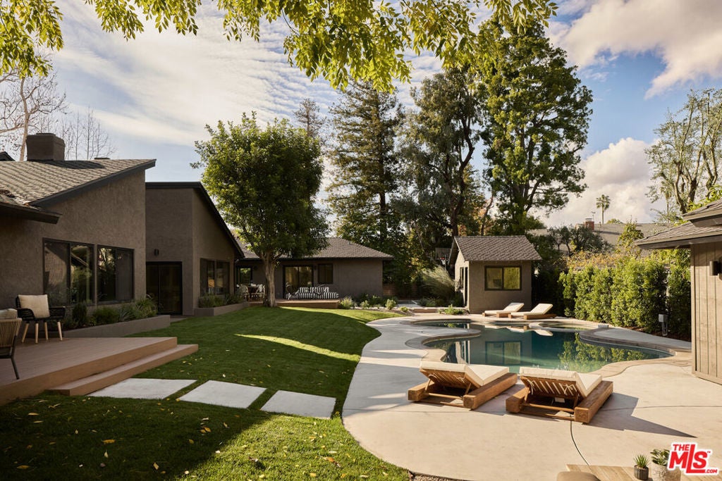 Completely reimagined for modern living by Maverick Design, this 1970s Ranch-style home in Encino blends timeless character with contemporary luxury on an expansive 17,022-square-foot lot just moments from vibrant Ventura Blvd. The single-story, 5,032-square-foot layout unfolds with effortless ease, grounded by wide-plank oak floors, designer lighting, oversized picture windows, and a refined palette of modern finishes. Enter through double doors to the dramatic entry foyer that sets the tone for the home's beautifully connected living spaces. The formal living room, accented by soaring vaulted ceilings and a built-in bar, invites stylish entertaining, while the family room's striking stone fireplace creates a relaxed gathering place that opens directly to the gourmet kitchen. Designed as the heart of the home, the kitchen is appointed with Perla Venata leathered stone countertops and backsplash, premium appliances including an oversized double-oven range, and a generous walk-in pantry. Nearby, the formal dining room provides an elegant setting for dinner parties, and an expansive recreation room, with an in-home wooden sauna and direct access to the backyard, offers a versatile space to unwind. Four spacious bedrooms are thoughtfully positioned, including a serene primary suite with dual walk-in closets, a cozy sitting area, and a stone-clad ensuite featuring a dual vanity and a glass-enclosed wet room with a shower and soaking tub. A dedicated office, gym, laundry room, and attached three-car garage meet the demands of modern living with ease. Outside, discover a true resort-style sanctuary. Multiple outdoor lounge areas wrap around a sparkling pool and spa, complemented by a detached pool bar and bathroom, mature trees, a manicured lawn, and a private sport court, creating the ultimate backdrop for both intimate gatherings and large-scale entertaining. Set in a prime Encino neighborhood near renowned restaurants, top-rated schools, parks, and the El Caballero Country Club, this meticulously renovated home offers a rare blend of sophistication, comfort, and California living at its finest.