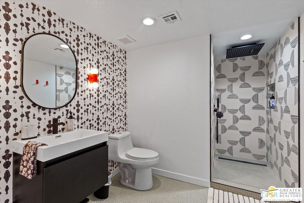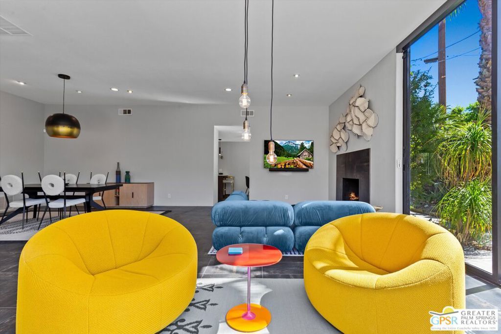 Located in the coveted Deepwell Estates neighborhood, this late-modern architectural home built in 1974 captures the essence of desert modernism with its sleek lines and commanding mountain views from both inside and out. Deepwell's location in the desirable south end of Palm Springs offers a unique blend of tranquility, walkability, and proximity to some of the city's best restaurants, midcentury landmarks, and resort amenities. Enter through a custom commercial glass door into a spacious living room with 10-foot Fleetwood floor-to-ceiling glass walls that open to a south and west-facing backyard; a seamless extension of the interior space and a perfect frame for dramatic sunsets. The kitchen features abundant cabinetry, generous counter space, and a casual breakfast area conveniently situated behind the main living and dining rooms. Recently renovated bathrooms bring a sophisticated, contemporary touch that integrates effortlessly with the home's original design. Currently set up as a 3 bedroom house, a 4th has been opened up and is used as a den or office but could be reconfigured back into another bedroom. One of the signature elements of this property is its dramatic ceiling height in the main living area, creating a striking connection to the surrounding mountains a defining hallmark of late-modern Palm Springs architecture.