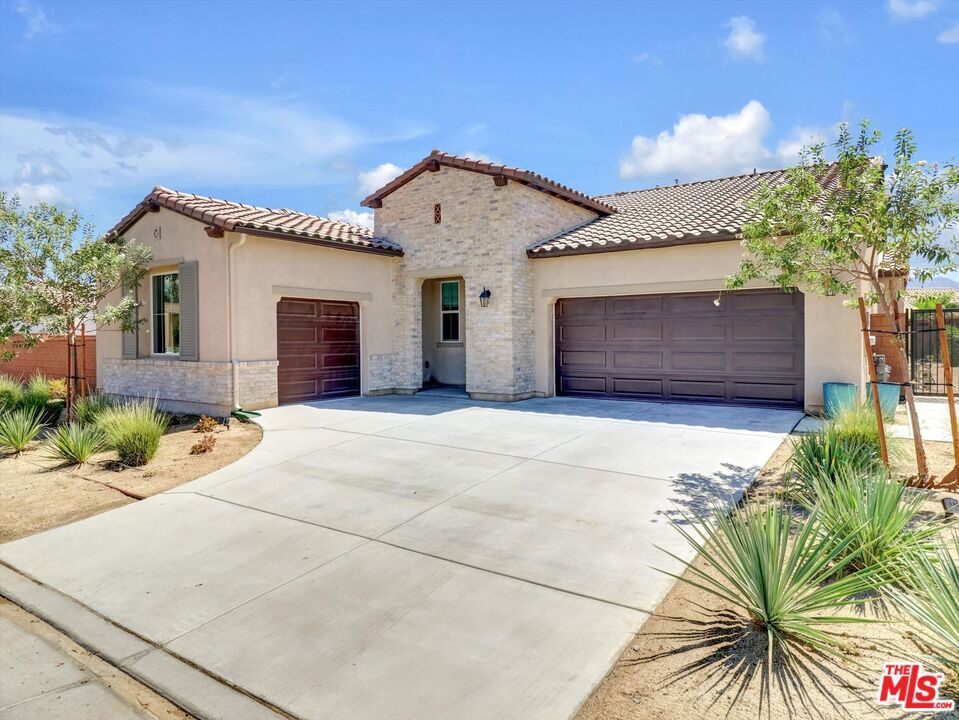 Welcome to this beautifully upgraded, Piazza Serena home completed in 2024 and located in a quiet, gated community. Designed with an open-concept floor plan, the home features a spacious great room anchored by a chef's kitchen with an oversized island, abundant cabinetry, and a walk-in pantry, perfect for everyday living and effortless entertaining. The expansive primary suite offers a spa-like ensuite bath, while three additional bedrooms each feature walk-in closets for ample storage. With three bathrooms and a large laundry room, functionality meets modern convenience at every turn. Step outside to a true desert oasis. Extensive landscaping upgrades showcase a sparkling saltwater pool and spa, lush grassy yard, in-ground trampoline, custom putting green, and a cozy gas fire pit, all framed by sweeping mountain views. The covered California room with double sliding doors creates seamless indoor-outdoor living, year round. Additional highlights include upgraded flooring, premium carpeting, owned solar, EV charging, and a 3-car garage. This home blends new-construction style with thoughtfully curated upgrades for the ultimate move-in ready retreat.