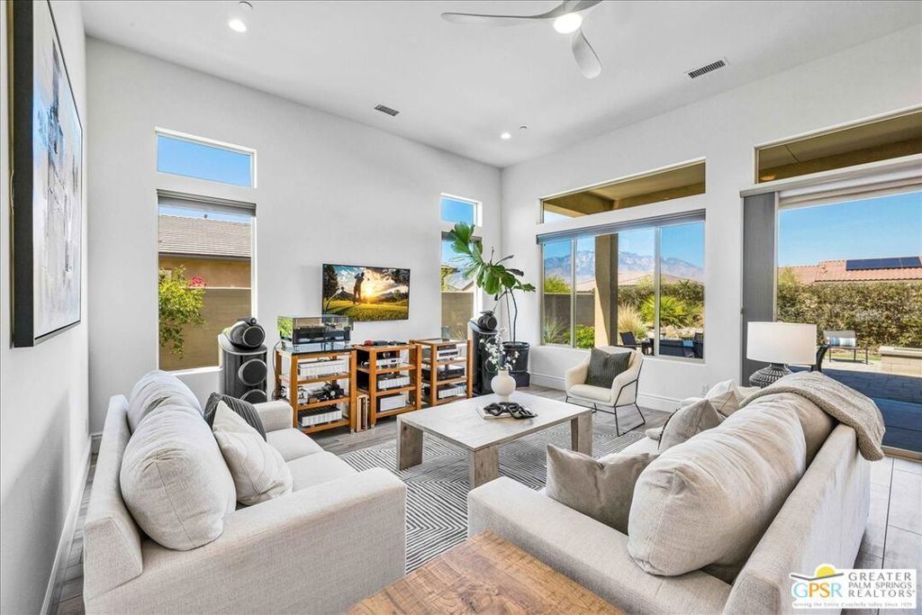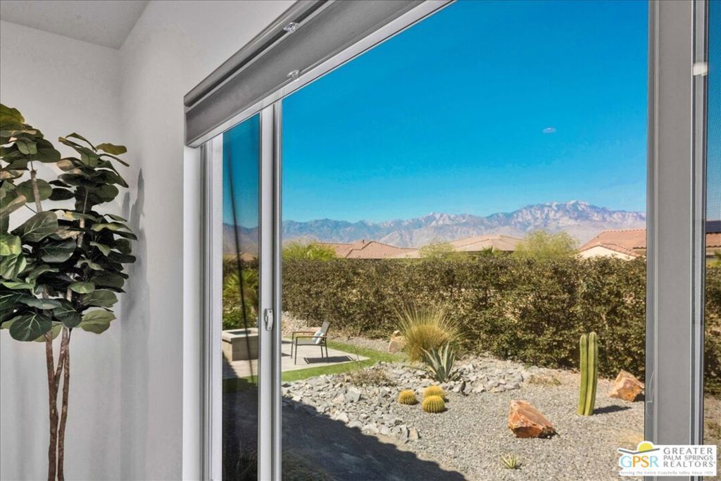 Discover a fresh opportunity to enjoy resort-style living in the heart of Del Webb Rancho Mirage, the desert's premier 55+ community. This beautifully reintroduced Tuscan-style Phase 5, Plan 8 Serenity home captures sweeping mountain views and blends timeless elegance with modern comfort - all enhanced by OWNED SOLAR and thoughtful upgrades throughout. Inside, the open-concept layout features three bedrooms, a versatile den/office/media room, and two baths - designed to balance relaxation and entertaining with ease. Rich porcelain wood-look tile flooring, elegant 7" baseboards, custom window treatments, and designer ceiling fans bring warmth and sophistication to every space. The chef's kitchen takes center stage with an upgraded KitchenAid appliance suite - including a built-in refrigerator - 42" upper cabinets with crown molding, and a grand executive island offering extra storage, power outlets, and luxurious double-thick quartz countertops. Wake up to breathtaking mountain vistas from the light-filled primary suite, featuring a spa-inspired bath with quartz dual vanities, sleek fixtures, and a custom-tiled walk-in shower. A generous walk-in closet completes this serene retreat. The guest wing and den are ideally separated, providing comfort and privacy for visiting friends and family. Step outside to a stunning, fully landscaped backyard oasisperfect for year-round desert living. Enjoy panoramic mountain views, gather around the built-in firepit, or unwind beside the tranquil custom pond and water feature. Additional highlights include a central vacuum system, air-conditioned oversized garage with overhead storage, EV charging outlet, and more. Within the exclusive gates of Del Webb Rancho Mirage, you'll have access to an impressive array of amenities -from the resort-style pool and spa to tennis, pickleball, bocce ball, fitness facilities, and a vibrant social calendar. Experience a new chapter of luxury, lifestyle, and community living - right here at Del Webb Rancho Mirage.