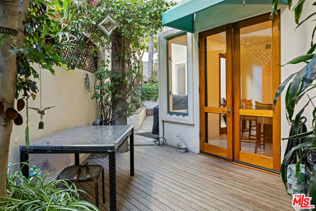 Wonderful opportunity to lease right in the heart of the Palisades while you are rebuilding! Controlled access iconic building completely remediated, freshly painted and available immediately for one or two year lease. Furniture available, but can be moved out if preferred. Terrific wrap around patio makes it feel like a real home. Two large bedrooms on separate sides of the condo, one has been used for a den/office with a Murphy bed. Primary bedroom has patio access and a large dual sink bathroom and walk-in closet. Full size washer and dryer in the unit. High ceiling living room, charming dining area, eat in kitchen with center island. Two assigned parking spaces in underground garage, accessed with clicker that opens and closes the gate. The 19 unit complex is known for its beautifully maintained courtyard with Hacienda style landscaping.