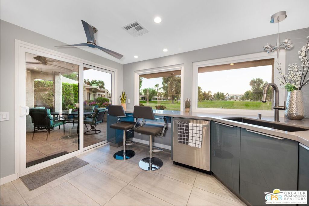 Beautifully renovated golf course patio home showing true pride of ownership! Desirable 3BR floor plan with great bedroom separation, vaulted ceilings, and spacious living area with wet bar. Gourmet kitchen and large windows create a bright, open feel. Attached 2-car garage offers direct access, AC split system, insulated walls/doors, and storage loft. Enjoy stunning golf course views of the 6th hole and green from the expansive patio. Updates include HVAC with heat pump, 50-gal water heater (2019), and dual-pane windows. Located in gated Cathedral Canyon CC with golf, tennis, and resort-style amenities minutes to shopping, dining, and Palm Springs Airport!