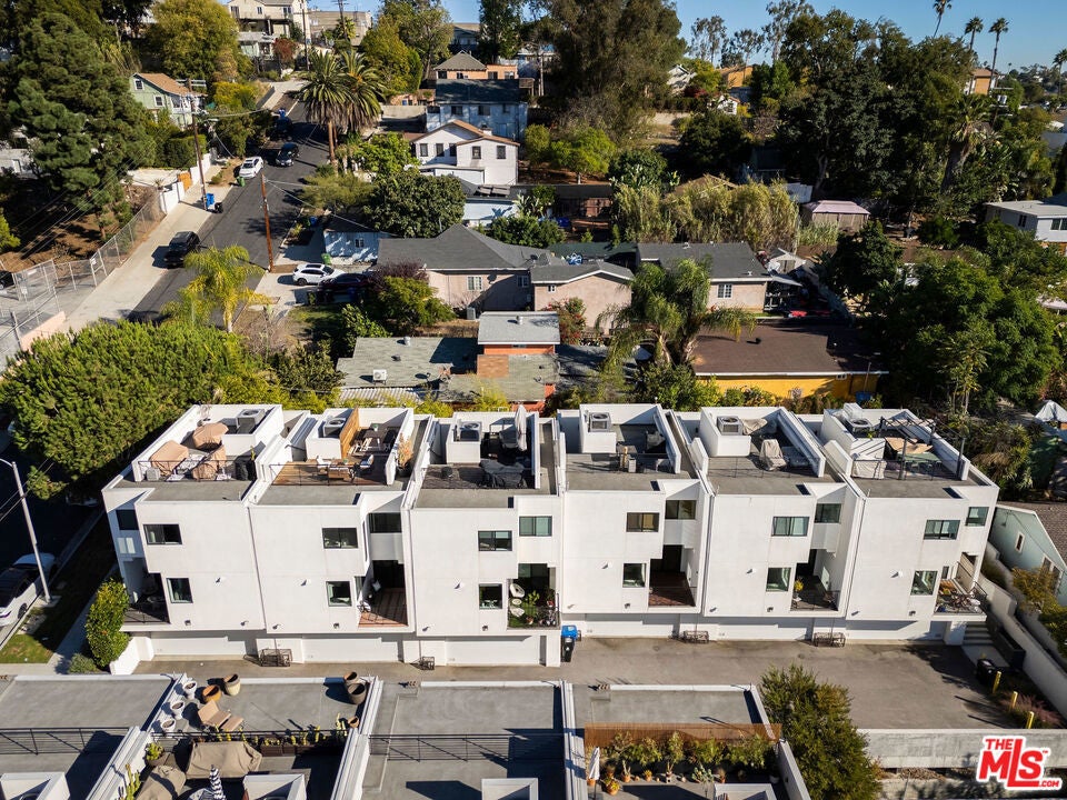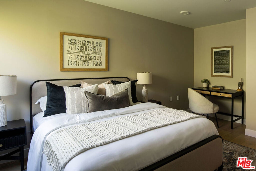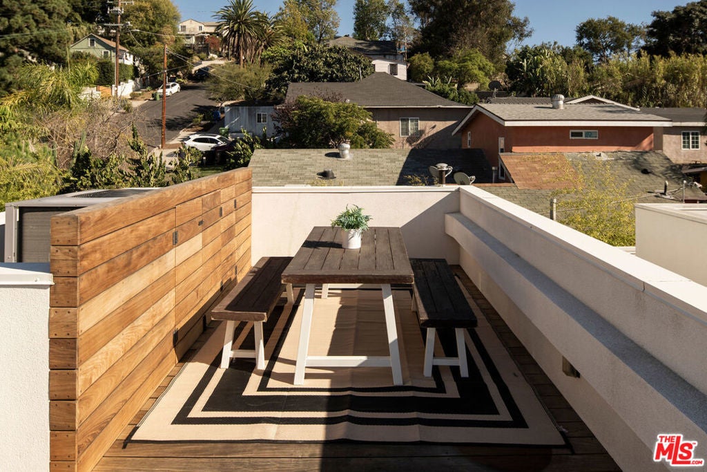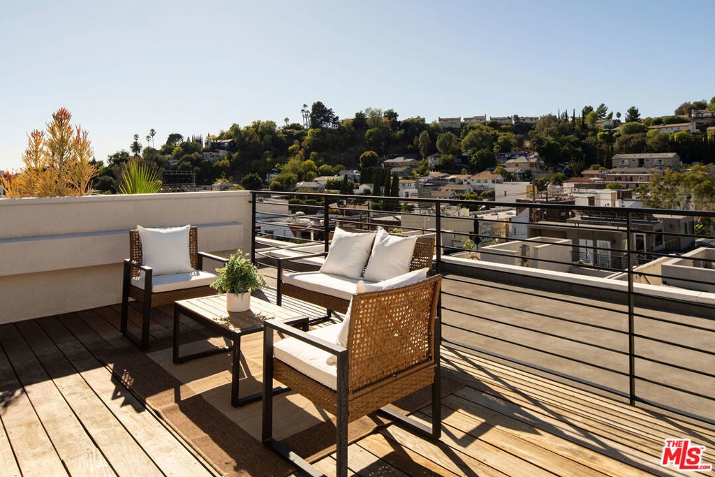 Perched within The Cliffs, a boutique collection of modern architectural homes in Echo Park, this light-filled 2-bed, 3-bath residence blends elevated design with stylish upgrades across four thoughtfully designed levels. Sunlight floods the interiors, highlighting warm wood flooring and a seamless open-concept layout. The gourmet kitchen is a true centerpiece, appointed with handcrafted Moroccan Zellige tile, an expansive quartz island, and professional-grade Fisher & Paykel and Bosch appliances. Just beyond the dining area, a private terrace with handmade Mexican Cotto terracotta tiles extends the living space outdoors. The second level hosts two serene bedroom suites, each finished with Farrow & Ball floor-to-ceiling paint for a bespoke, gallery-like aesthetic. The primary suite indulges with a spa-inspired bathroom, showcasing double vanities, a soaking tub, and a walk-in shower, evoking a boutique hotel experience. A brand-new LG washer and dryer provide seamless convenience. Crowning the home is a private rooftop retreat with a Brazilian walnut IPE deck, gas hookup, and panoramic city views, an ideal setting for entertaining under the stars. The lower level offers a direct-access two-car garage equipped with MyQ remote technology, a versatile bonus/office space with polished concrete floors, Farrow & Ball floor-to-ceiling paint, and a statement powder room adorned with Farrow & Ball hand-painted wallpaper. With modern architecture, thoughtfully curated upgrades, and enviable outdoor spaces, this home offers a turnkey opportunity to live stylishly in the heart of Echo Park, one of Los Angeles' most sought-after enclaves.