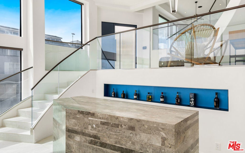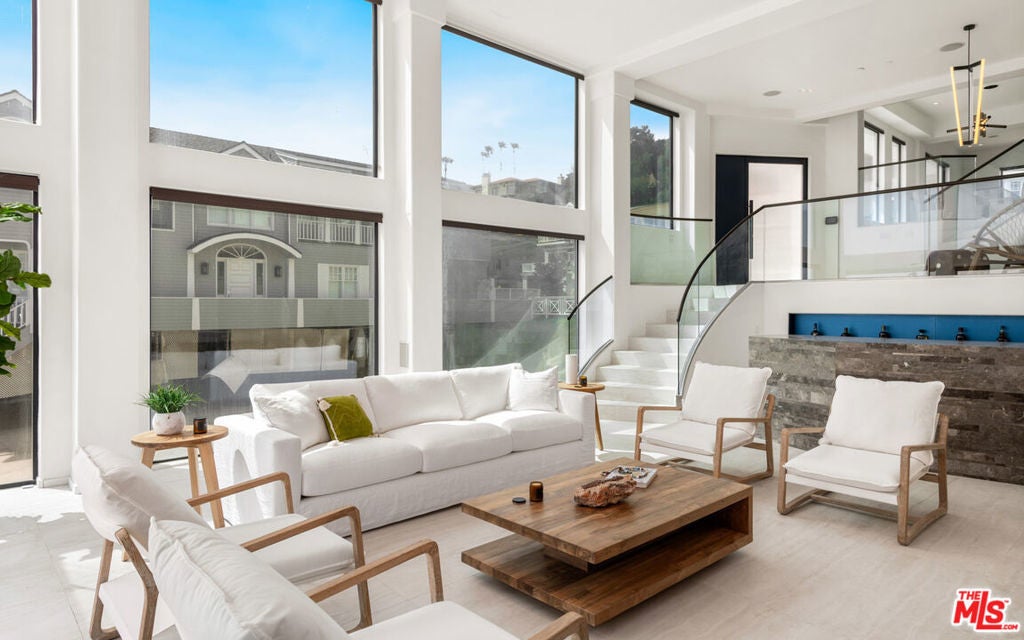 A sleek contemporary with walls of glass and majestic ocean, shoreline, and island views, this sensational home is designed for heavenly relaxation and sophisticated entertaining. Built on three levels for maximum enjoyment of the sunrise-to-sunset panorama, the home's wraparound windows, exceptionally high ceilings, and gorgeous furnishings provide a tranquil setting on the sandy shore of Sea Level beach. The entry, with a huge pivoting glass door, opens onto a mezzanine with a small seating area. Steps lead down to the lower level, where the enormous living room has floor-to-ceiling windows on two sides, a tiled bar, handsome built-ins, and wide glass doors that slide open onto a lighted beachfront balcony with ample room for dining, entertaining, and sea- and star-gazing. Also on this level is a powder room, laundry, and a bedroom. From the foyer, steps lead up to the middle floor, which is home to a beautiful chandelier dining area, chef's kitchen, and the primary suite. The kitchen is equipped with top-quality appliances, an island with bar seating, sleek built-ins, and a walk-in pantry with a beverage cooler. The primary suite is a spacious and private retreat that commands spectacular views and opens onto a large oceanfront deck. The suite has a built-in beverage cooler, walk-in closet, and a lovely spa-style bath. A skylight stairway leads to the top floor, home to a television/reading lounge and three bedrooms, one with a private balcony. The home is also equipped with smart-home features, multizone air conditioning, built-in speakers, a two-car garage, and a stairway to the beach below. This is a stunning new oceanfront residence and the perfect setting for comfortable living and generous entertaining.