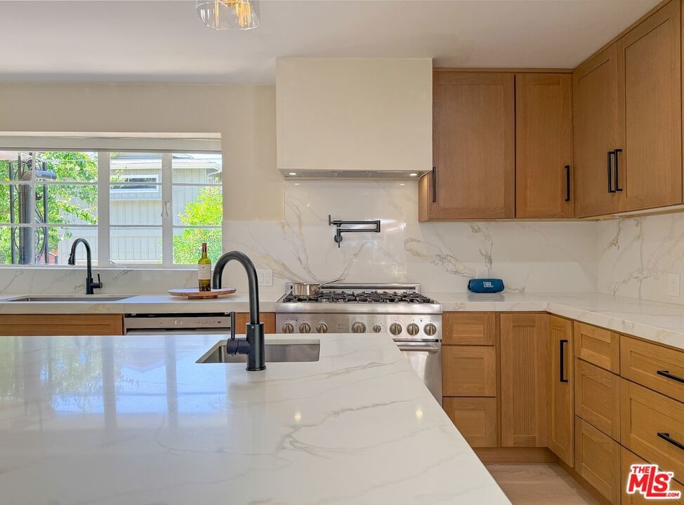 Tucked at the end of a quiet cul-de-sac in prime Sherman Oaks, this single-story 3BR/2.5BA (~2,109 sf) blends style, privacy, and effortless indoor-outdoor living. A clean modern palette wide-plank oak floors, recessed lighting, Roman Clay walls frames a chef's kitchen with a 7'x5' waterfall island, prep sink, pot filler, and 36" Thermador range. The sun-drenched primary bedroom opens to a lush yard with a 40' heated lap pool (10' deep), sun decks, grassy play area, and golden-hour valley views. A third bedroom with en-suite bath is perfect for guests or a luxe home office. Extras: brand-new 15-panel solar (lower utilities), outdoor loungers + heaters, and unbeatable proximity to Ventura Blvd favorites, Equinox, and Fashion Square Mall. Available fully furnished and turnkey. Flexible lease terms (short, mid, or long). This is elevated Sherman Oaks living private, polished, and ready now.