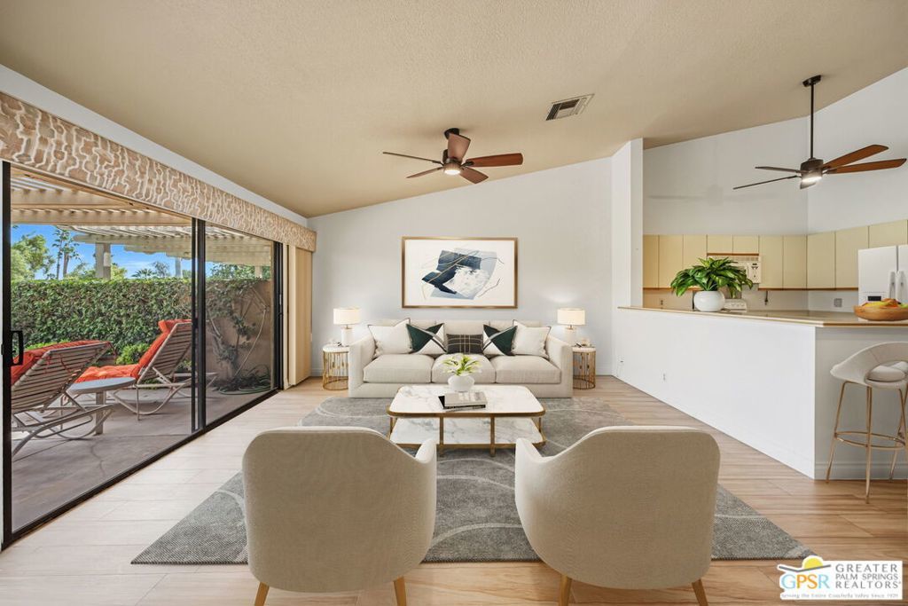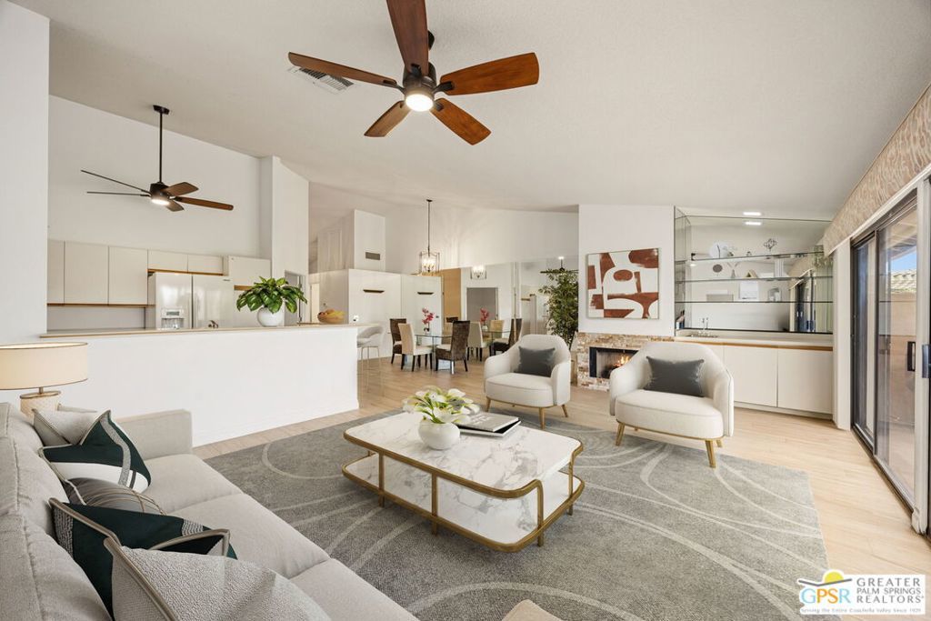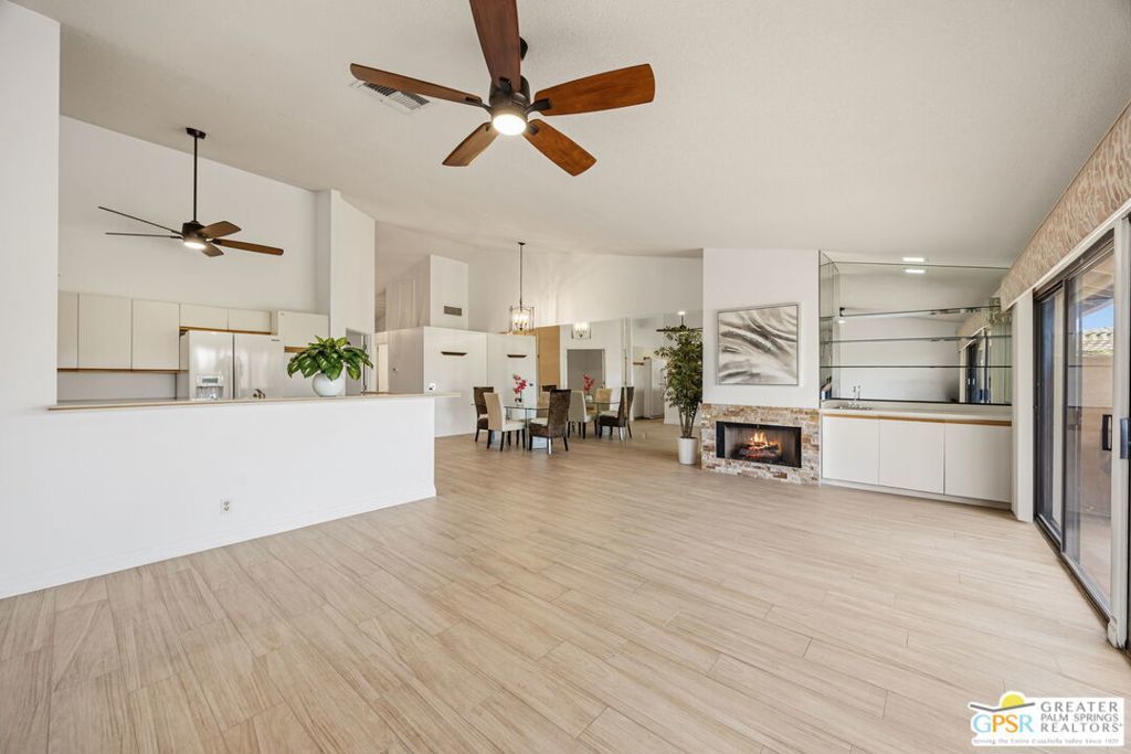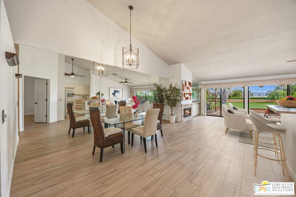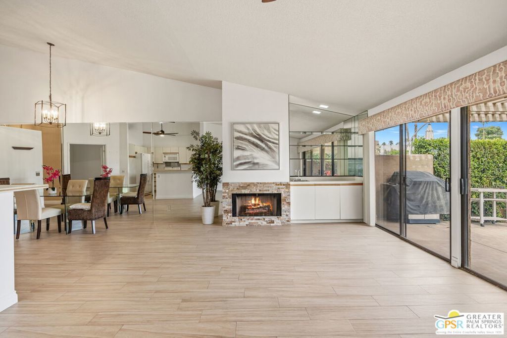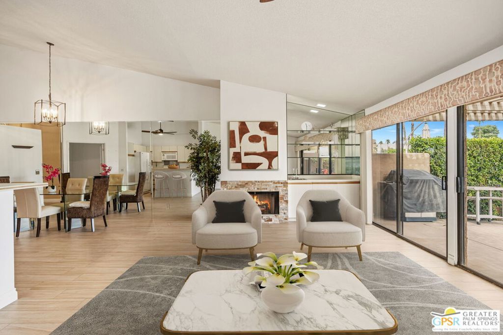 Welcome to Woodhaven Country Club, where resort-style living meets everyday comfort. This beautiful 2-bedroom 2 Bathroom condo offers the perfect blend of relaxation and recreation within one of Palm Desert's most sought-after guard-gated communities. Step inside to find an open-concept floor plan with soaring ceilings, abundant natural light, and contemporary wood laminate flooring throughout. The spacious great room features a cozy fireplace, mirrored accent wall, and seamless flow to the dining area and kitchen, ideal for entertaining or unwinding after a day on the course. Enjoy morning coffee or evening cocktails on your private patio overlooking the lush, manicured fairways with one of the community's four heated pools and spas just across the street. Residents of Woodhaven Country Club enjoy access to top-tier amenities, including an 18-hole golf course, tennis and pickleball courts, fitness center, clubhouse dining, and social activities year-round. With world-class shopping, dining, and the Indian Wells Tennis Garden just minutes away, this location offers the perfect mix of convenience and leisure. Whether you're searching for a full-time home, seasonal getaway, or investment opportunity, this charming desert retreat captures the best of the Coachella Valley lifestyle.