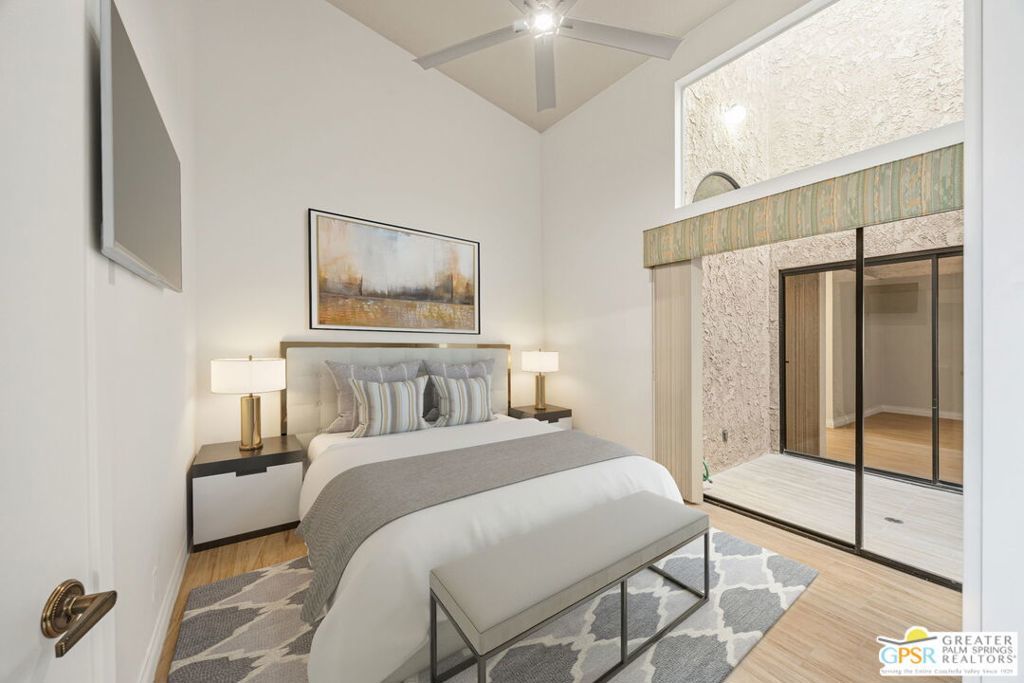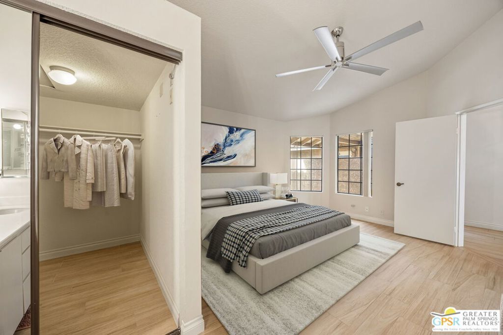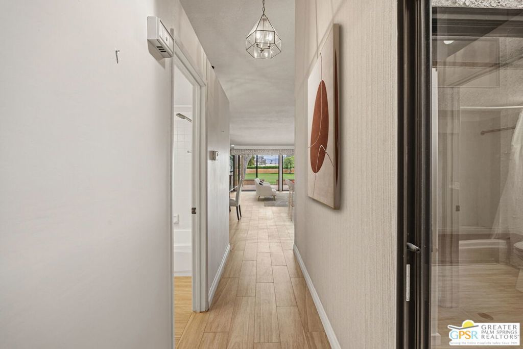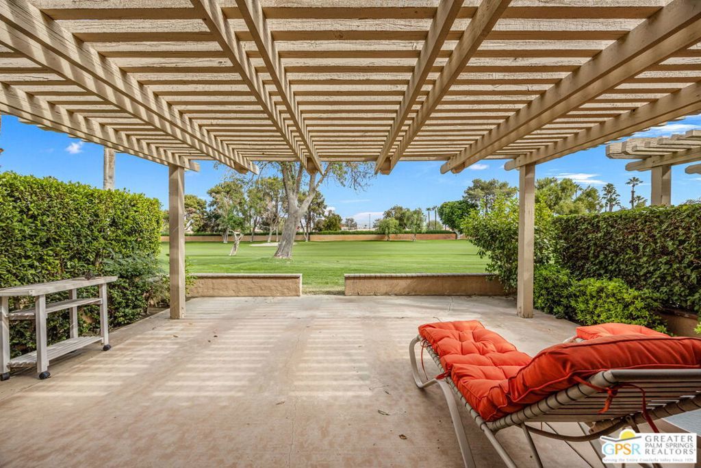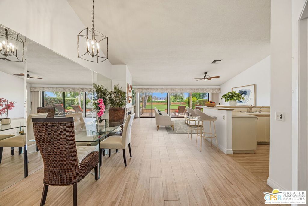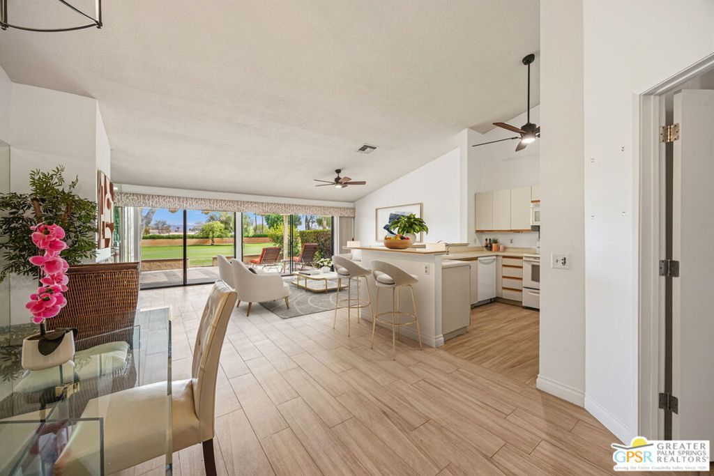 Welcome to Woodhaven Country Club, where resort-style living meets everyday comfort. This beautiful 2-bedroom 2 Bathroom condo offers the perfect blend of relaxation and recreation within one of Palm Desert's most sought-after guard-gated communities. Step inside to find an open-concept floor plan with soaring ceilings, abundant natural light, and contemporary wood laminate flooring throughout. The spacious great room features a cozy fireplace, mirrored accent wall, and seamless flow to the dining area and kitchen, ideal for entertaining or unwinding after a day on the course. Enjoy morning coffee or evening cocktails on your private patio overlooking the lush, manicured fairways with one of the community's four heated pools and spas just across the street. Residents of Woodhaven Country Club enjoy access to top-tier amenities, including an 18-hole golf course, tennis and pickleball courts, fitness center, clubhouse dining, and social activities year-round. With world-class shopping, dining, and the Indian Wells Tennis Garden just minutes away, this location offers the perfect mix of convenience and leisure. Whether you're searching for a full-time home, seasonal getaway, or investment opportunity, this charming desert retreat captures the best of the Coachella Valley lifestyle.