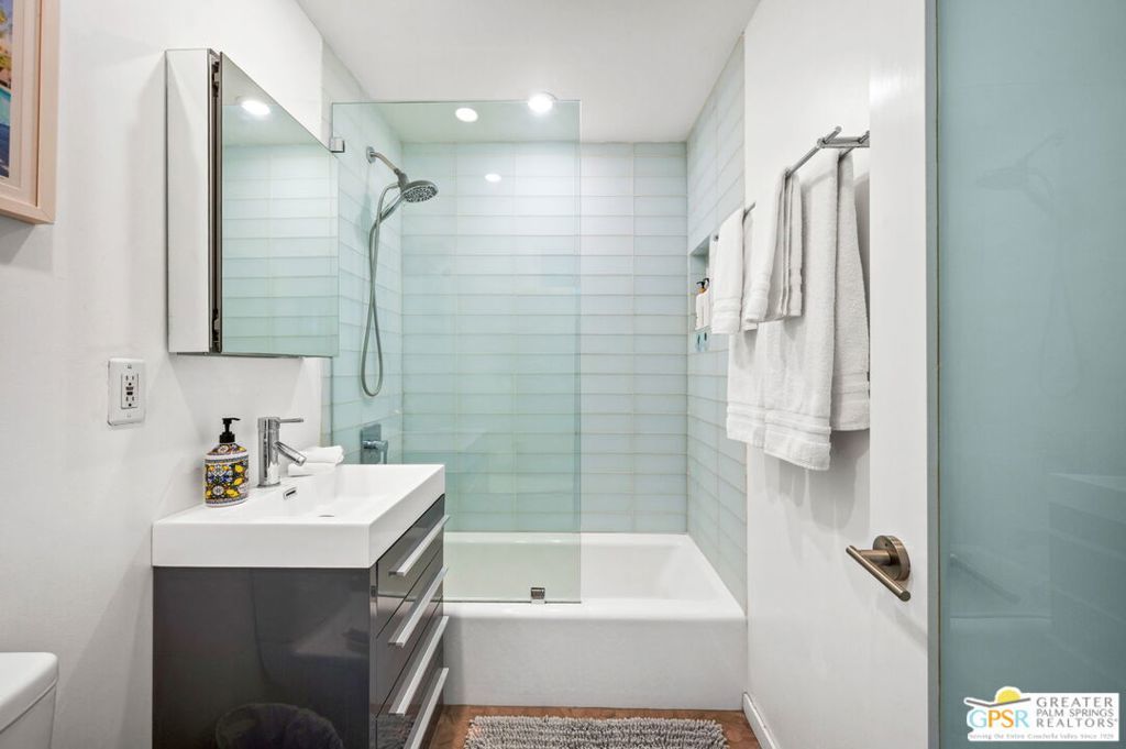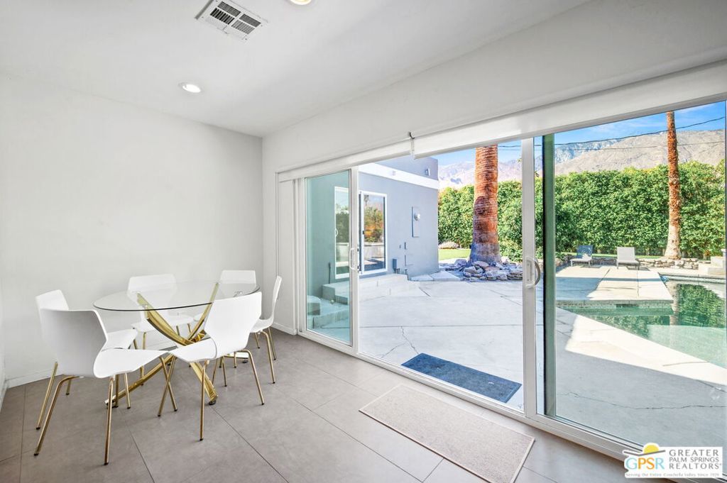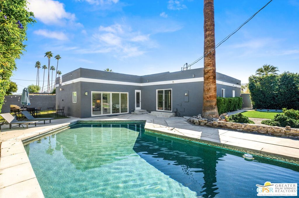 This contemporary home in the desirable Tahquitz River Estates neighborhood of South Palm Springs features three bedrooms, two bathrooms, a saltwater pool and spa in a private backyard, and sweeping mountain views. The entry opens to a spacious living room with a gas fireplace, flowing into a kitchen equipped with a commercial-style range and generous storage and counter space. A den and dining area sit just beyond, completing a layout that's ideal for both everyday living and entertaining. A converted one-car garage houses the washer and dryer and provides flexible space for an office, gym, or storage. The roof has recently been upgraded with 1.5 inches of foam, and the exterior has been freshly painted. Drought-tolerant landscaping and synthetic turf complete the clean, low-maintenance outdoor setting. The home offers convenient access to Downtown Palm Springs, shopping, dining, and essential services.