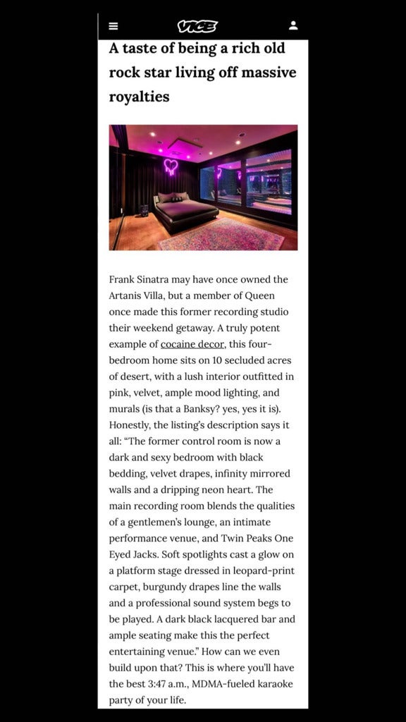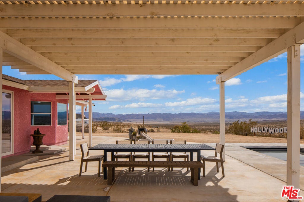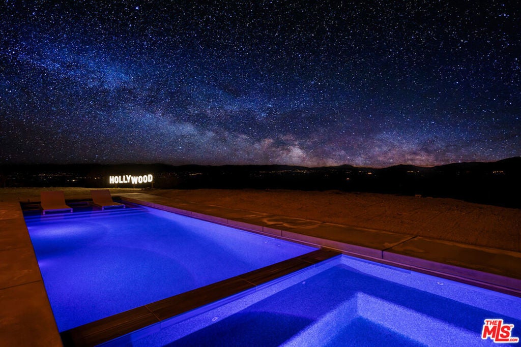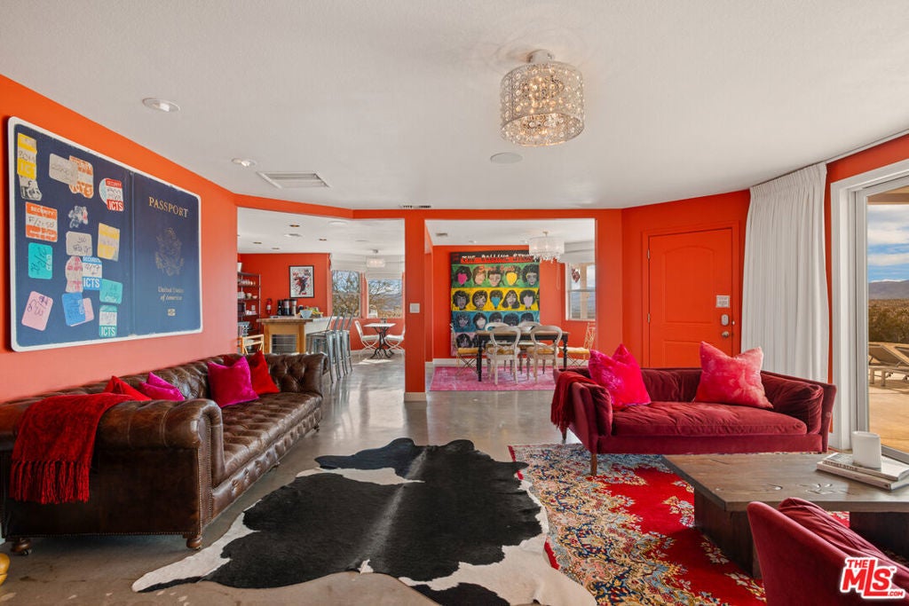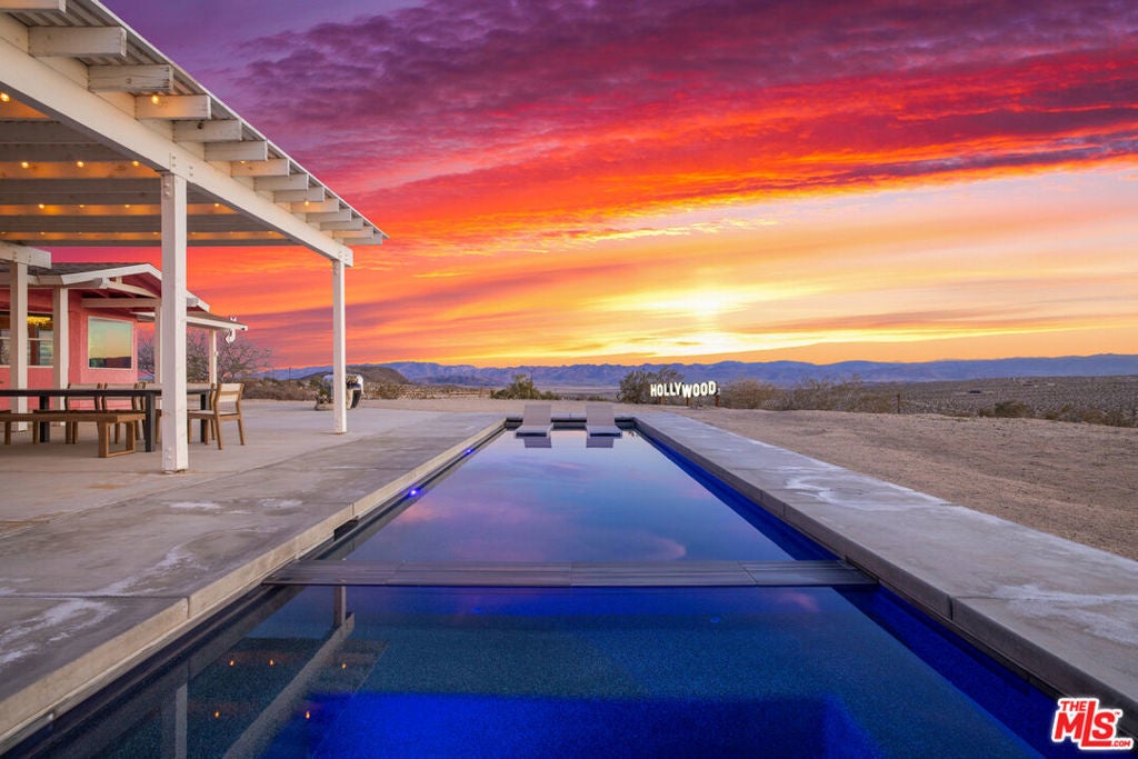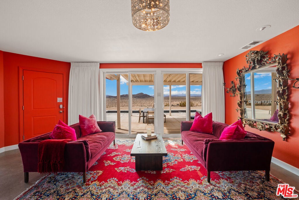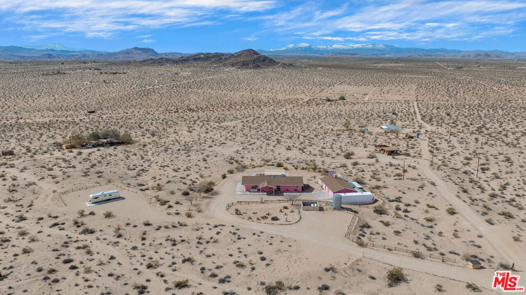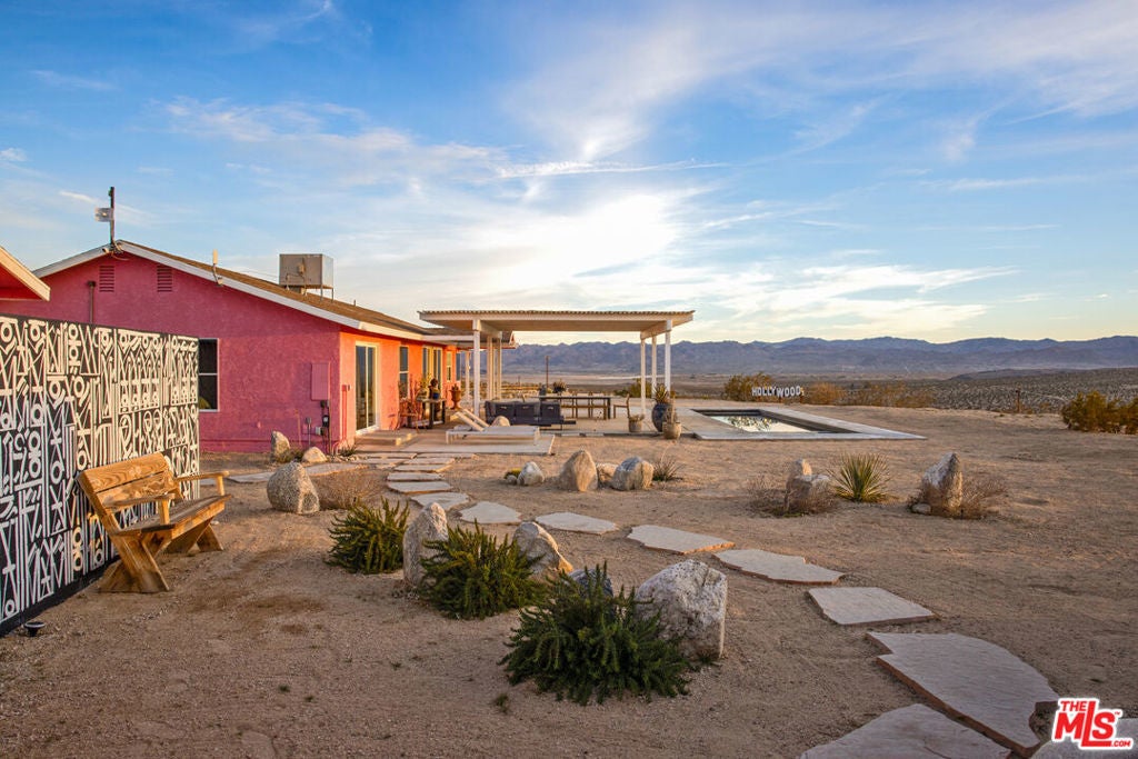 "LET THE DESERT BE YOUR MUSE" A once-in-a-lifetime opportunity to acquire the creative provenance of legendary rock group Queen the iconic PINK SATELLITE STUDIO, set atop a hilltop with sweeping 180-degree views of the desert floor, Goat Mountain, the San Jacinto Mountains, and even Daniel Popper's monumental art installation. This legendary 5-acre Joshua Tree compound merges high design, art, and music heritage. The property features a fully remodeled 3-bedroom, 2-bath main home (approx. 1,775 SF) and a detached 1-bedroom, 1-bath ADU / 1,000 SF professional recording studio, once used by internationally acclaimed artists.Featured in Palm Springs Life, Vice, and Mixmag AKG, the estate blends creative pedigree with modern desert luxury. The exteriors showcase murals by well-known street artists,, while interiors showcase polished concrete floors, Viking & Bosch appliances, and open-concept living spaces that flow seamlessly outdoors to a sparkling SALTWATER pool/spa, granite fire pit, cactus garden, and shaded lounge with panoramic views. The property is being offered fully furnished and turnkey, inclusive of its vintage Silver Streak trailer, which provides additional guest sleeping quarters. Currently operated as a high-performing Airbnb since March 2025, the property has generated approximately $35,000 in gross revenue from March through August 2025. With gated privacy, cinematic mountain vistas, and a creative legacy tied to music and art icons, this is one of the High Desert's most inspiring private estates equal parts sanctuary, showcase, and soundstage.
