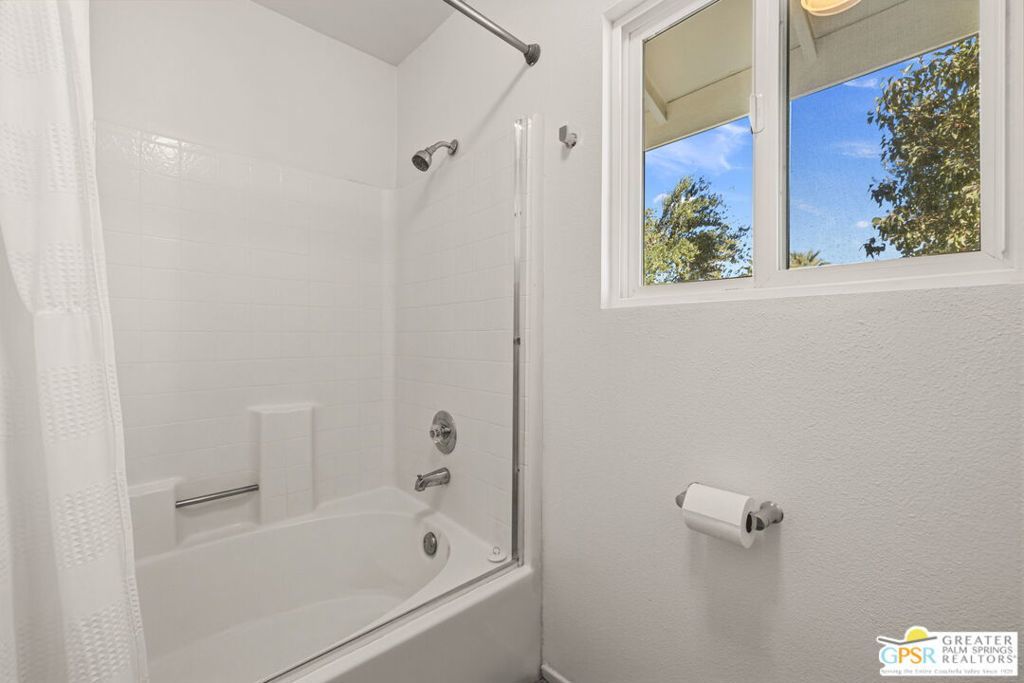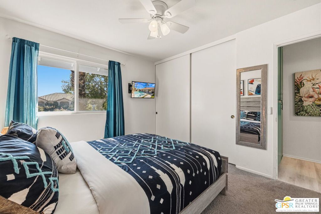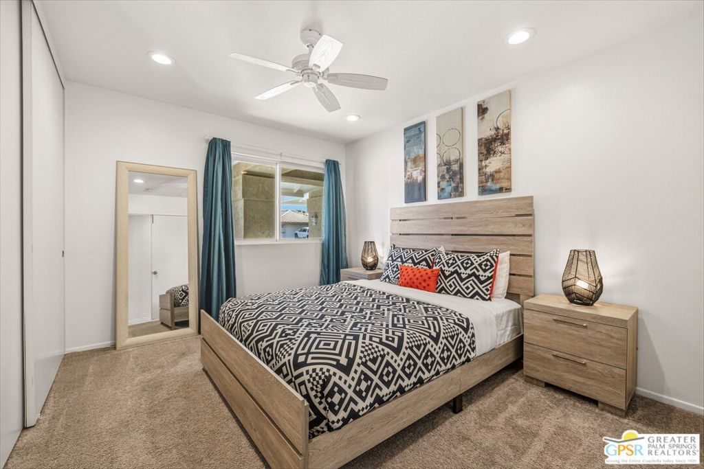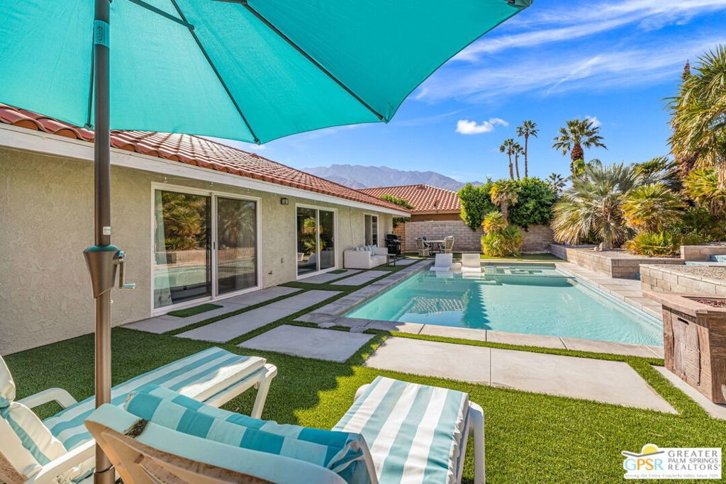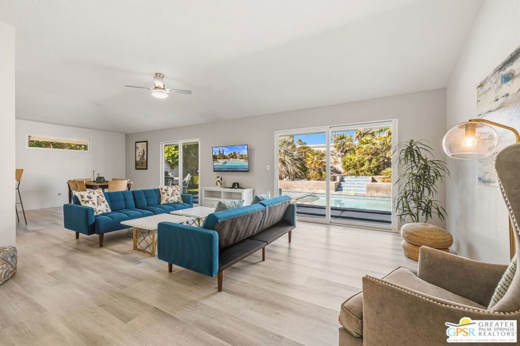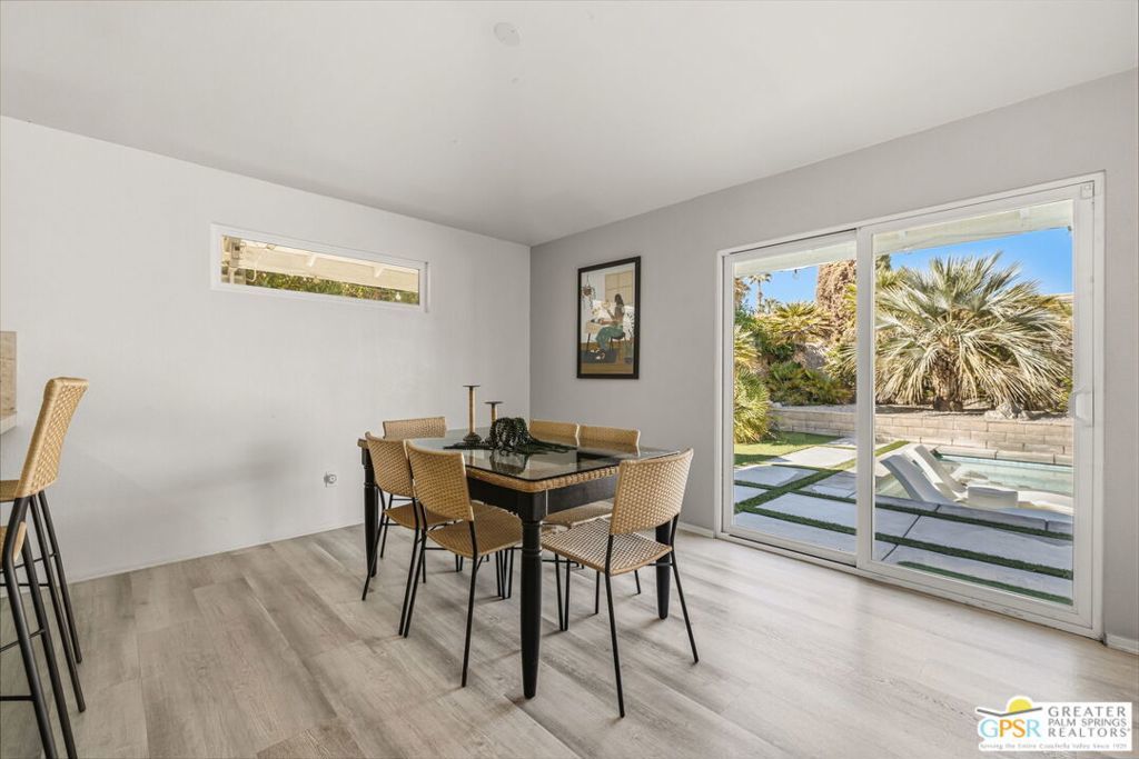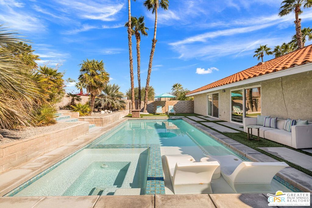 Wow! Bright, stylish, and perfectly positioned for the Palm Springs good life. Poolside mountain views too! This furnished 3 bedroom, 2 bath home celebrates open concept living and resort-style outdoor spaces with sliders from the living, dining, and kitchen areas that open to the saltwater pool, spa, and Baja sunning deck surrounded by mature palms. Vaulted ceilings and clerestory windows fill the interiors with light. Set on Fee Land, you own the land, with underground utilities so no overhead wires interrupt the views. The ensuite primary suite offers direct pool access and a generous walk-in closet, while guest bedrooms share a full bath with clerestory window. Double pane windows and sliders add to the appeal. Two-car garage and utility room just off the kitchen. Waterwise landscaping keeps upkeep simple. Located in Quail Point, a community of 83 homes in Vista Norte with no HOA and not gated. Currently eligible for Short Term Rental permits from the city. Take the Matterport Virtual Tour for a better sense of flow.