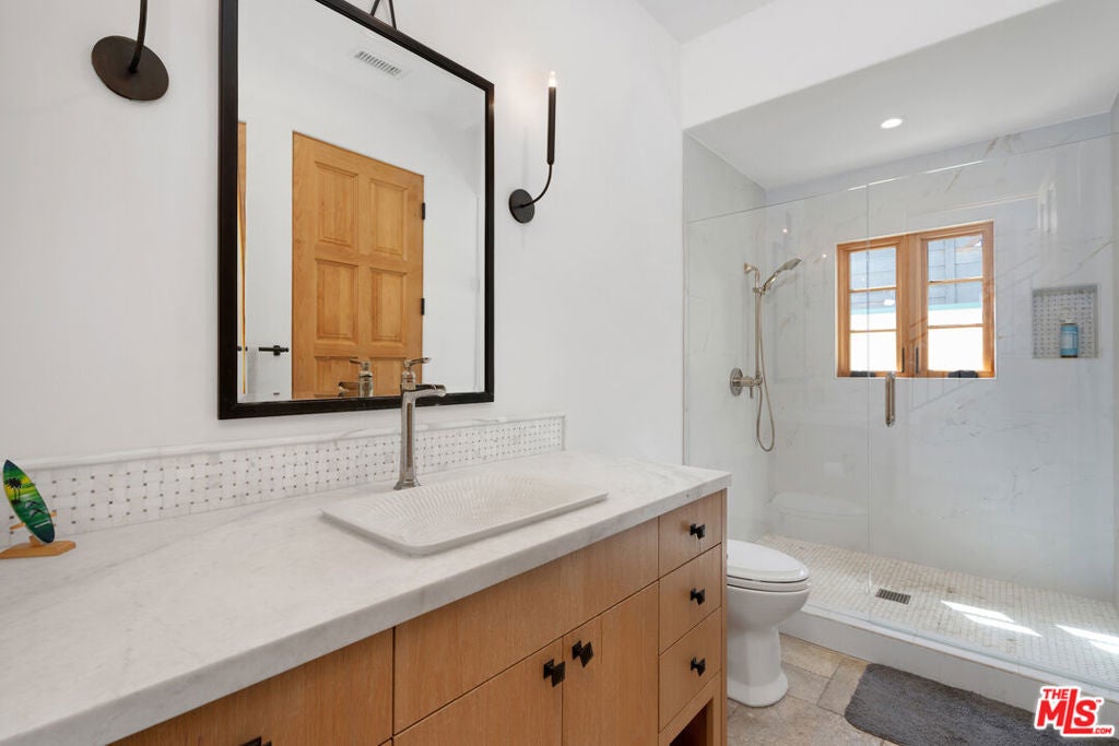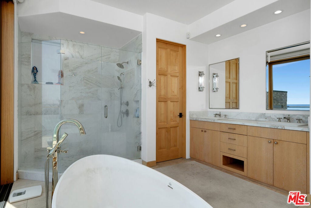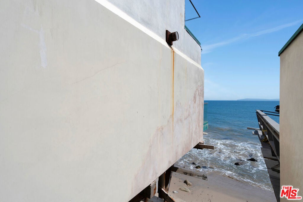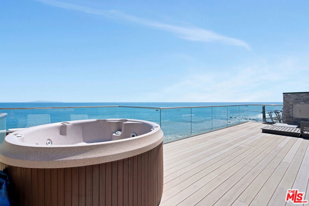 This Mediterranean Modern beachfront property rests on 50ft of beach frontage and was completely rebuilt in 2016 by a local architect with high ceilings and marble floors throughout. The main floor features an open floor plan - ideal for full enjoyment of the Malibu beachfront lifestyle. The living room has a stone fireplace and floor-to-ceiling glass sliders that fully open to the large deck with unobstructed panoramic ocean, coastline, and Catalina views. The kitchen features quartz countertop, stainless steel appliances, and solid wood cabinetry. Lastly, there is an ensuite bedroom/office and private direct beach access. Upstairs features the beachfront primary suite with king size bed, walk-in closet, and sliding glass doors with panoramic views that fully open to a large private deck, hot tub, and fireplace. The primary bathroom includes a dual vanity with quartz countertop, ocean view soaking tub, and marble shower. There is also an additional ensuite bedroom with a third level loft and roof deck with ocean views, and a fourth optional office/guest room with mountain views. Central heating and air conditioning, two car garage with tonal gym. Integrated sound systems, video screens, and security system. This property is located in eastern Malibu and is close to world-class dining, shopping, entertainment, and less than a 10-minute drive to the westside.