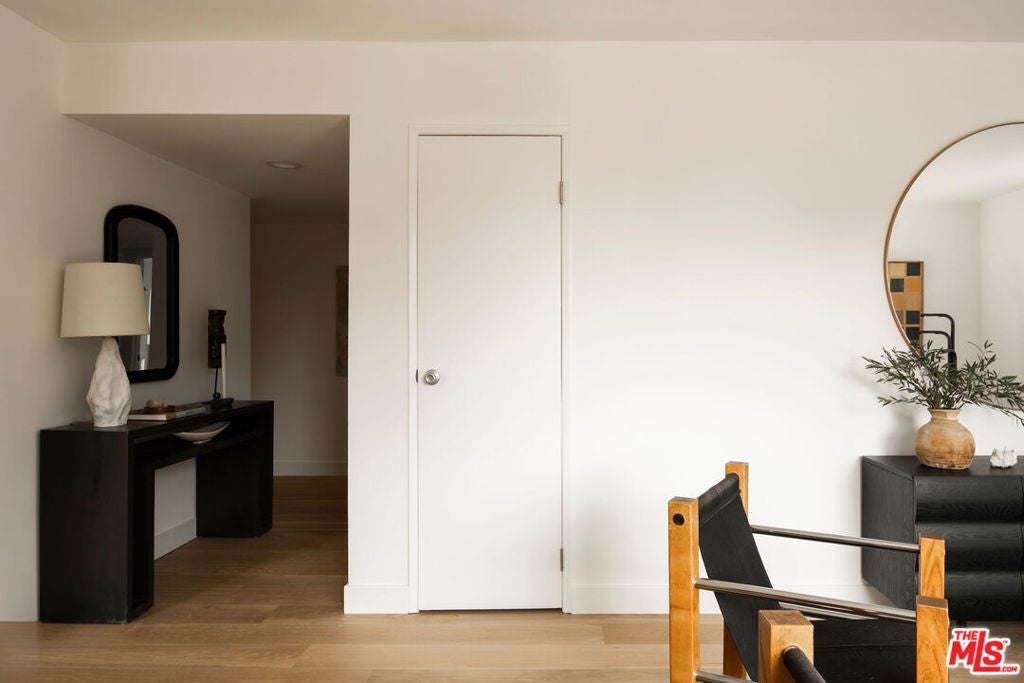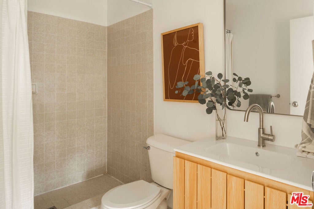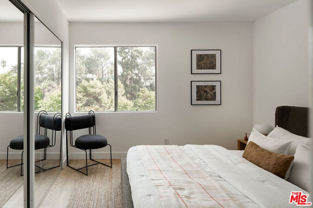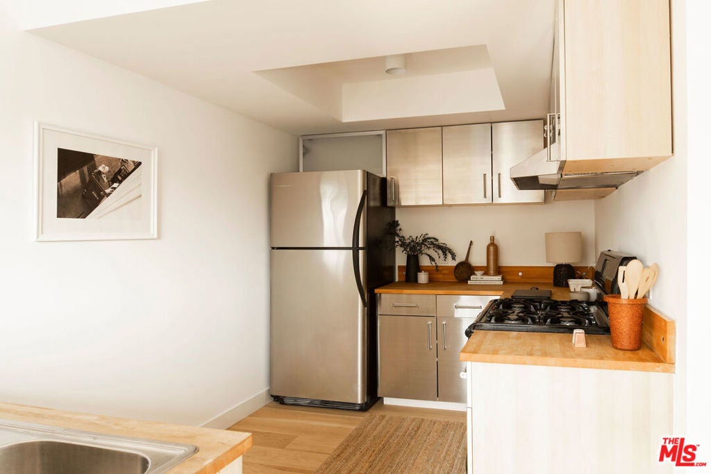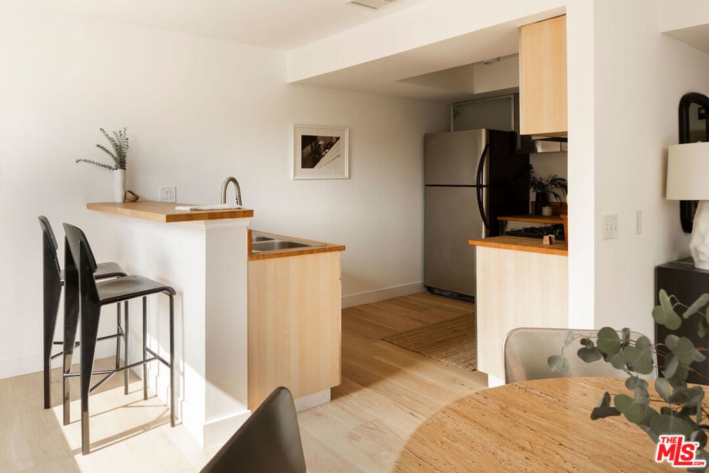 Bathed in natural light with views of tree tops and Bellevue Park, this upstairs rear unit captures the effortless, creative spirit of Silver Lake. With its own private entrance and staircase, it feels tucked away yet just moments from the vibrant pulse of Sunset Junction. Upon entry the open floor plan includes two spacious bedrooms and tasteful updates throughout such as butcher-block counters, stainless-steel cabinetry, new bathroom vanities, new lighting, fresh paint and new engineered-wood floors. This warm and inviting atmosphere leaves room for the next owner to make it their own. Below the unit, a private laundry room adds everyday convenience along with two parking spots. In the evenings, stroll with your dog to the park or meet friends for dinner at neighborhood favorites like Bacari, Pine & Crane or Night + Market Song. The vibe is relaxed, stylish, and unmistakably Silver Lake where community, creativity, and comfort blend effortlessly.