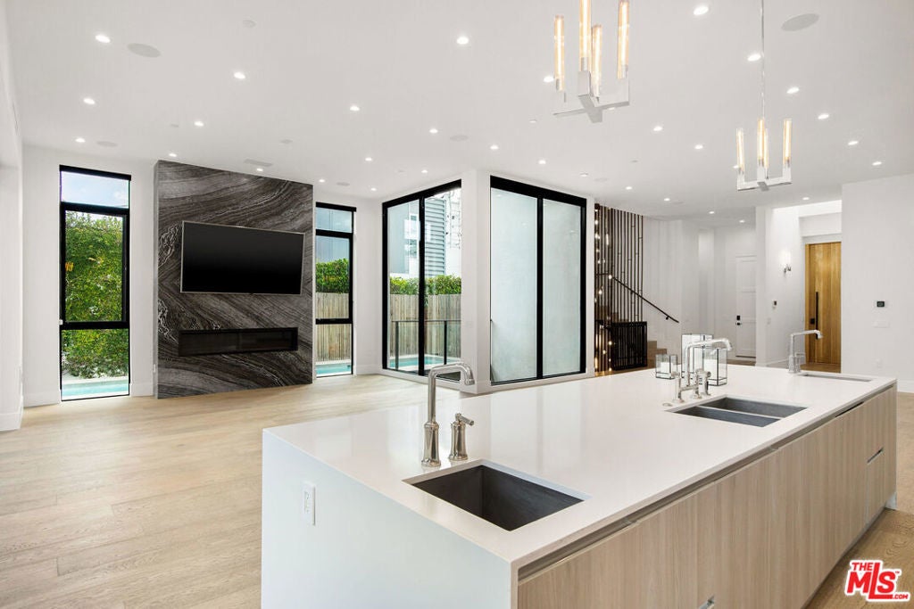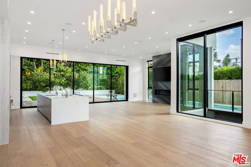 Experience modern luxury in this custom-built Beverly Grove home, designed with open-concept living and seamless indoor-outdoor flow. The main level features soaring ceilings, expansive windows, and a sleek open floor plan connecting the kitchen, dining, and living areas. A full-height sliding pocket door opens to a private backyard oasis complete with a built-in BBQ and a wraparound pool that elegantly frames the home.The lower level is an entertainer's dream, featuring a full bar, movie theater, wine display, and a guest bedroom offering exceptional privacy and natural light.Upstairs, retreat to a grand primary suite with dual walk-in closets and a luxurious spa-style bathroom with soaking tub and double vanity. Secondary bedrooms include en-suite baths and generous closets.Top it all off with a spacious rooftop deck showcasing panoramic views from Downtown Los Angeles to Century City, complete with gas fire pits and built-in lines for entertaining.