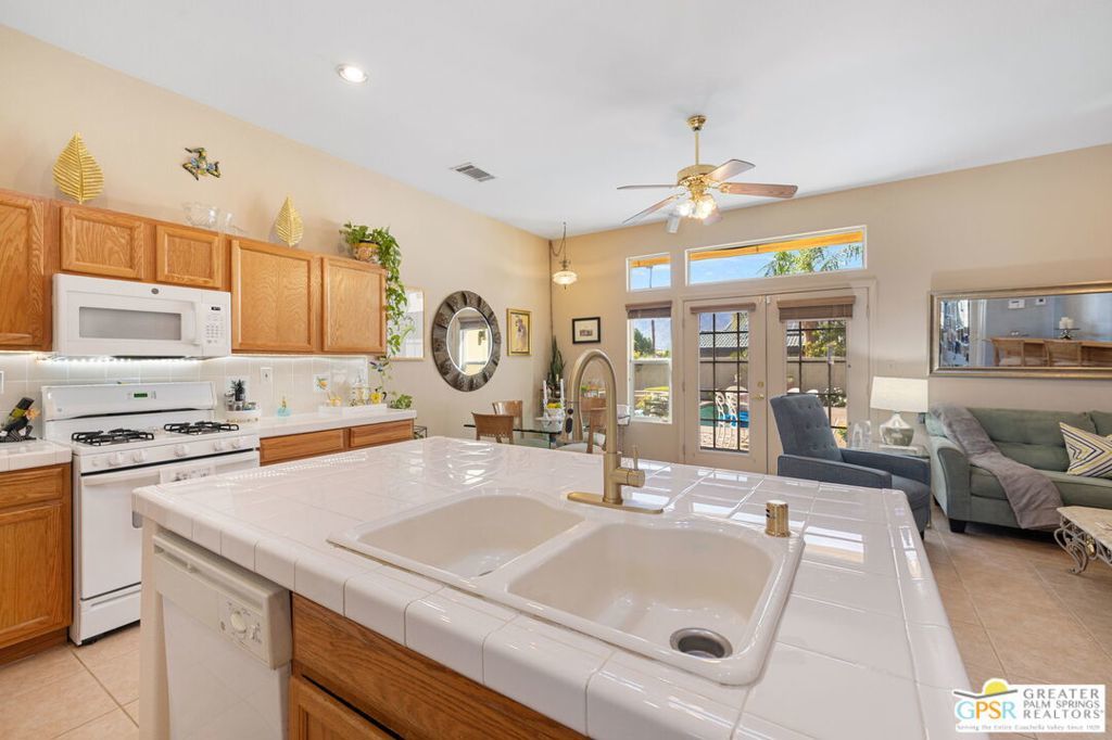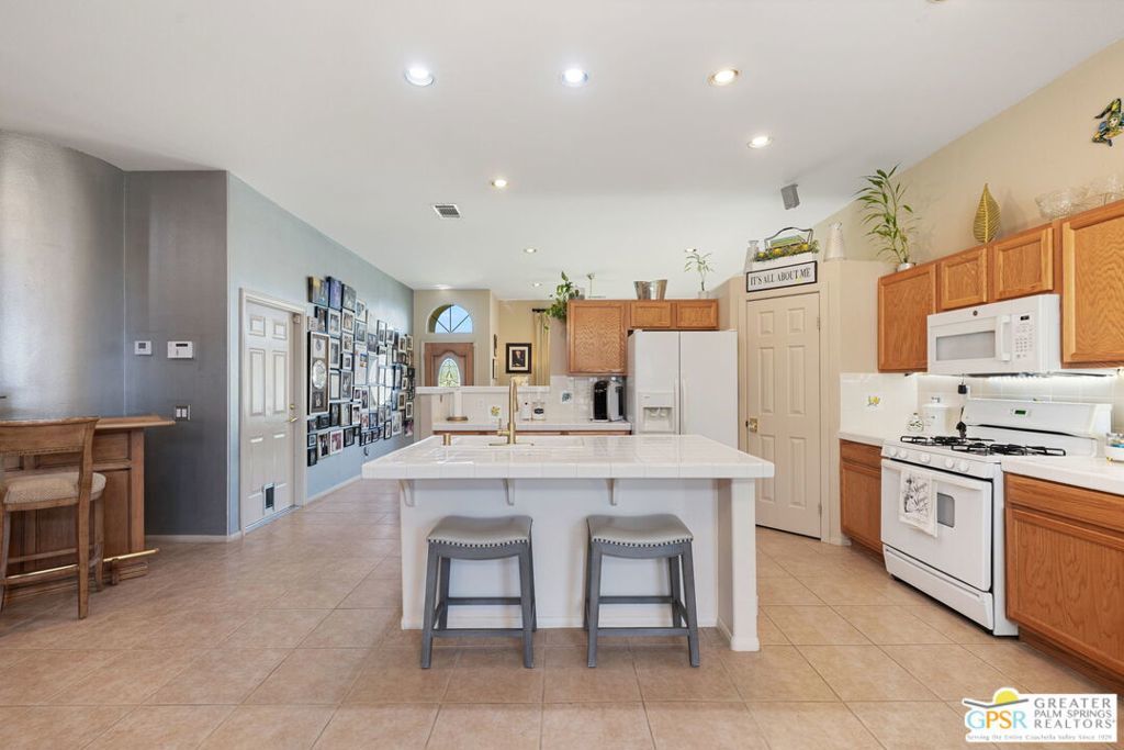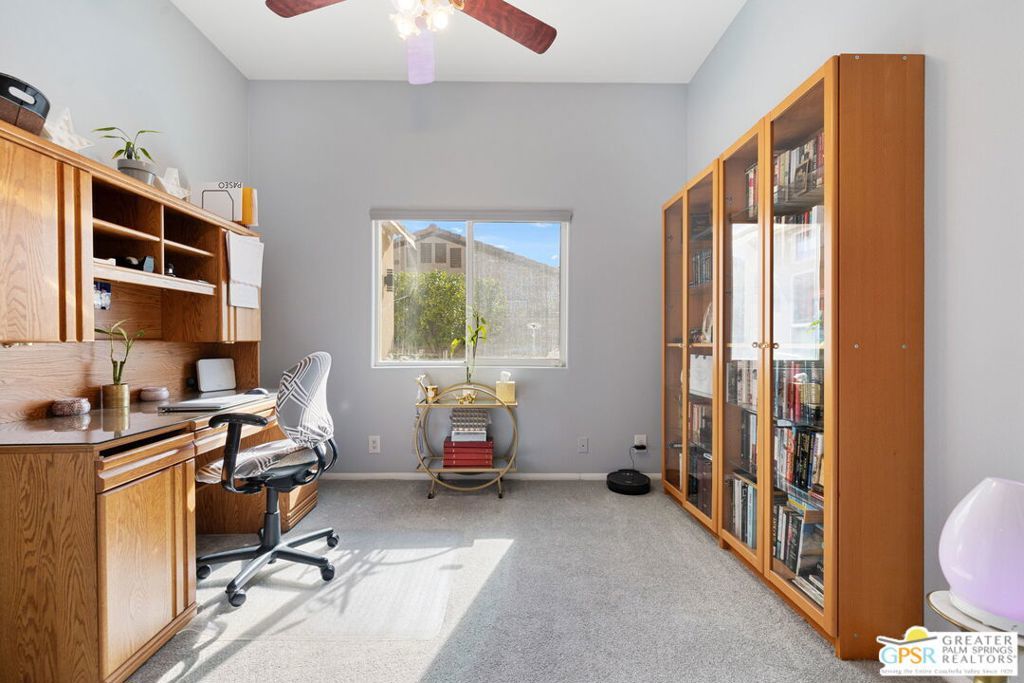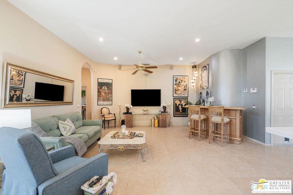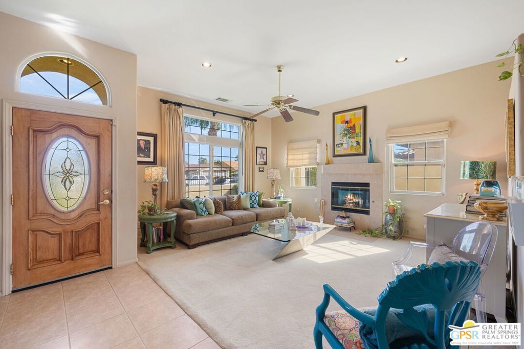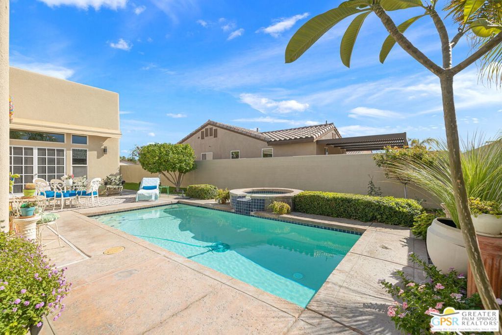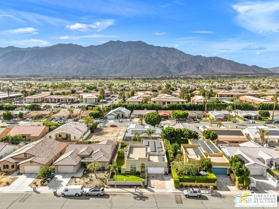 Discover this stunning 3-bedroom, 2-bath home with a den in beautiful Cathedral City, where breathtaking mountain views and modern comfort come together! Designed with an open-concept floor plan and high ceilings throughout, this home feels bright, spacious, and perfect for both relaxing and entertaining. The refurbished roof (just one year old) and leased solar panels add lasting value and energy savings. Step outside to your own private oasis. A sparkling pool and spa with a timed pool vacuum keeps everything pristine and ready for fun in the sun. Inside, enjoy the built-in surround sound system in the kitchen and family room, ideal for movie nights or gatherings. Both bathrooms feature double sinks, and one includes a private water closet with a pocket door for extra convenience. The attached 2-car garage offers built-in cabinets, shelving, and a workbench, providing plenty of space for storage or hobbies. Set in a quiet, friendly neighborhood, this home delivers the best of desert living style, comfort, and incredible views! (Note: Pool heater not working; fireplace painted but not fireproof.) Great location perfect for a family home or investment. Own your piece of Paradise today!